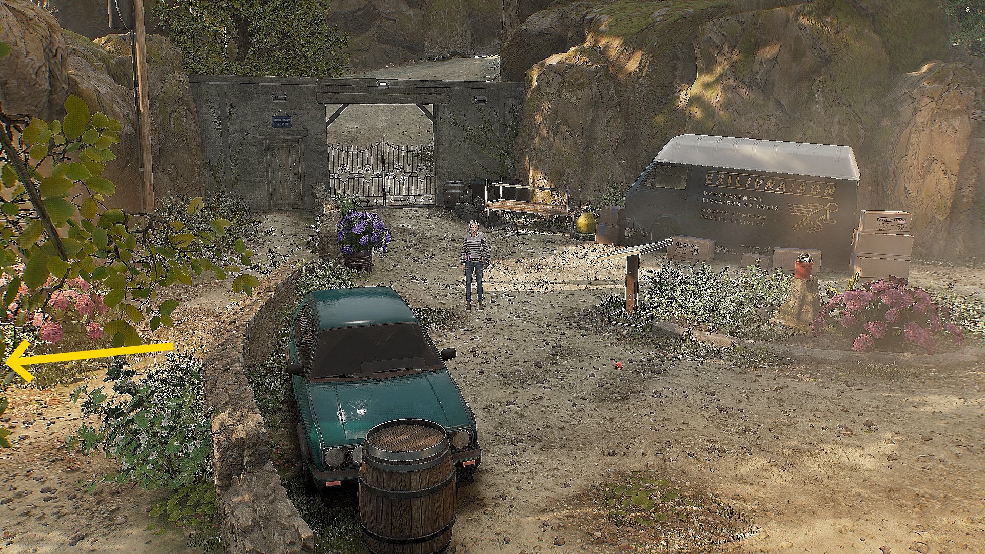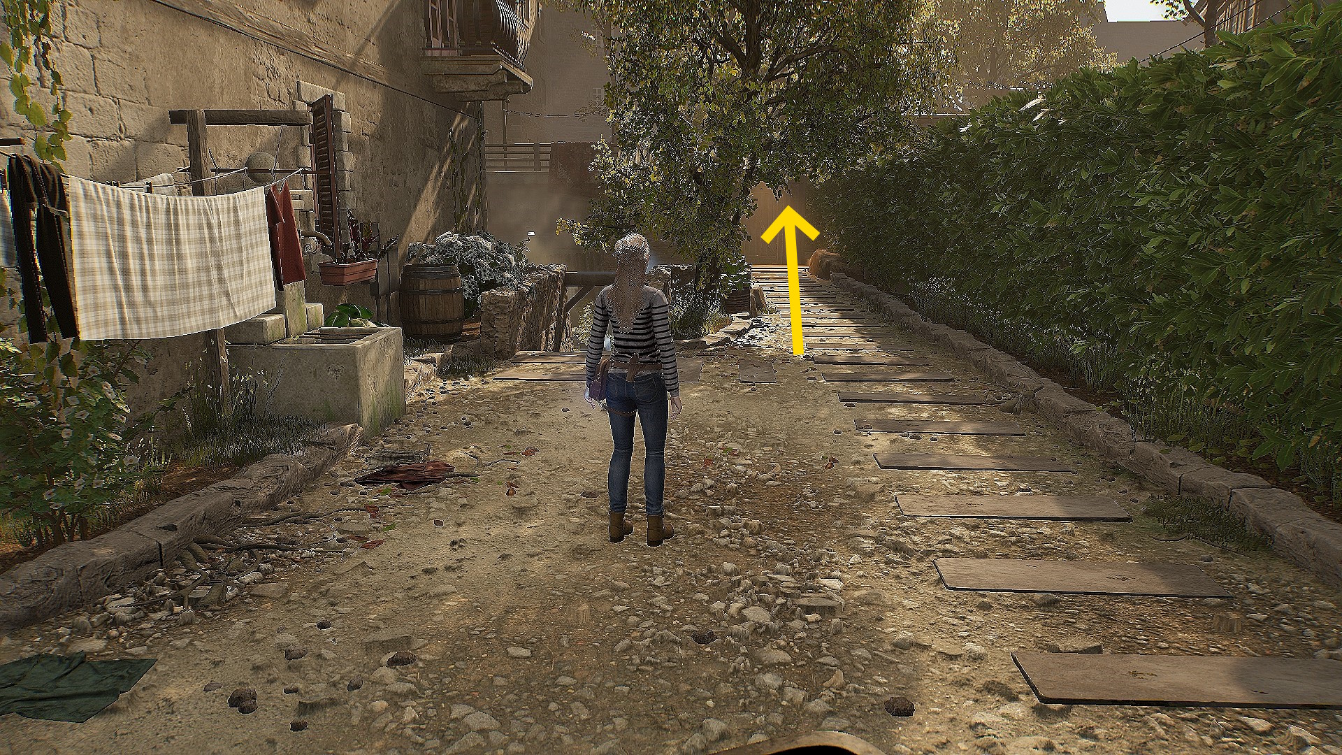 • 小屋を出たら、画面向かって左側に塀が切れているところがあり、そこから裏庭に下りることができる