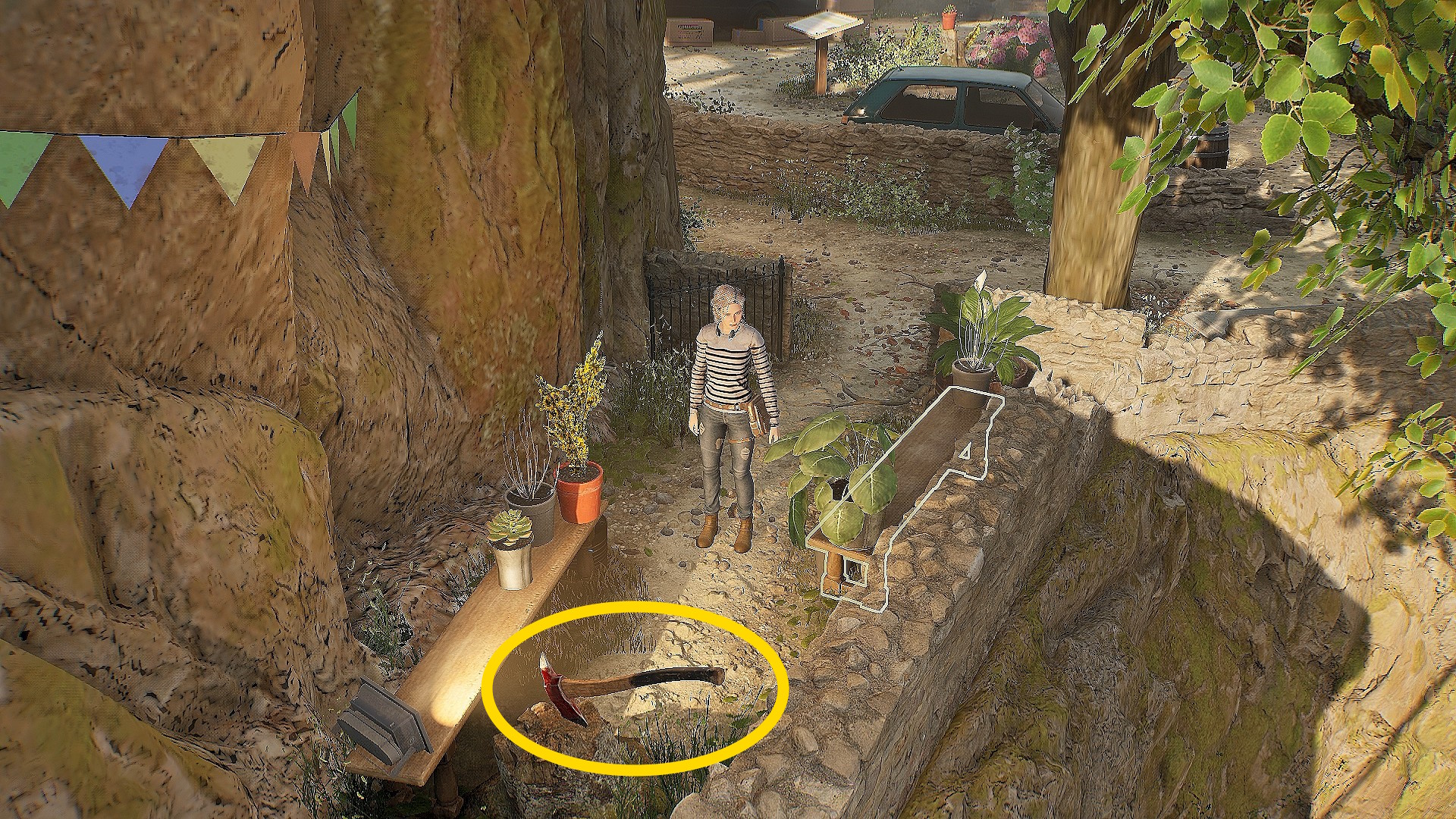 • 斧を回収したら、この小さなエリアを出て、画面手前に進む