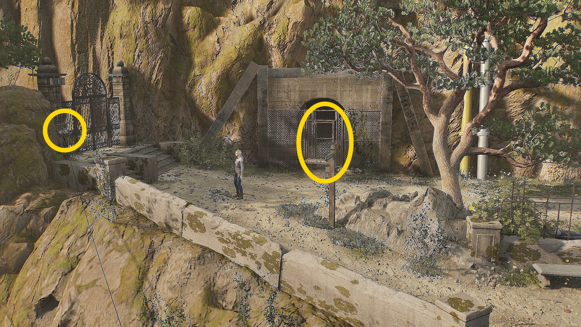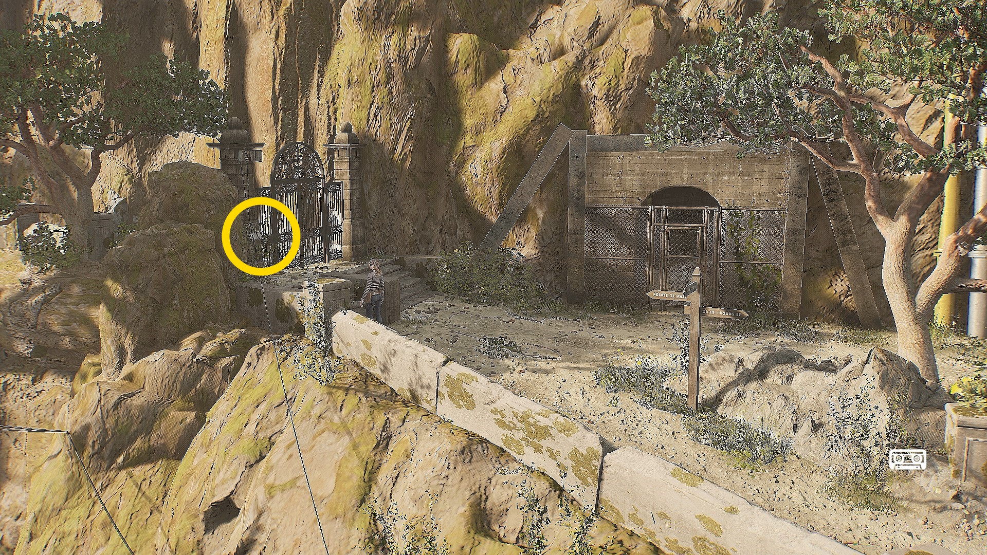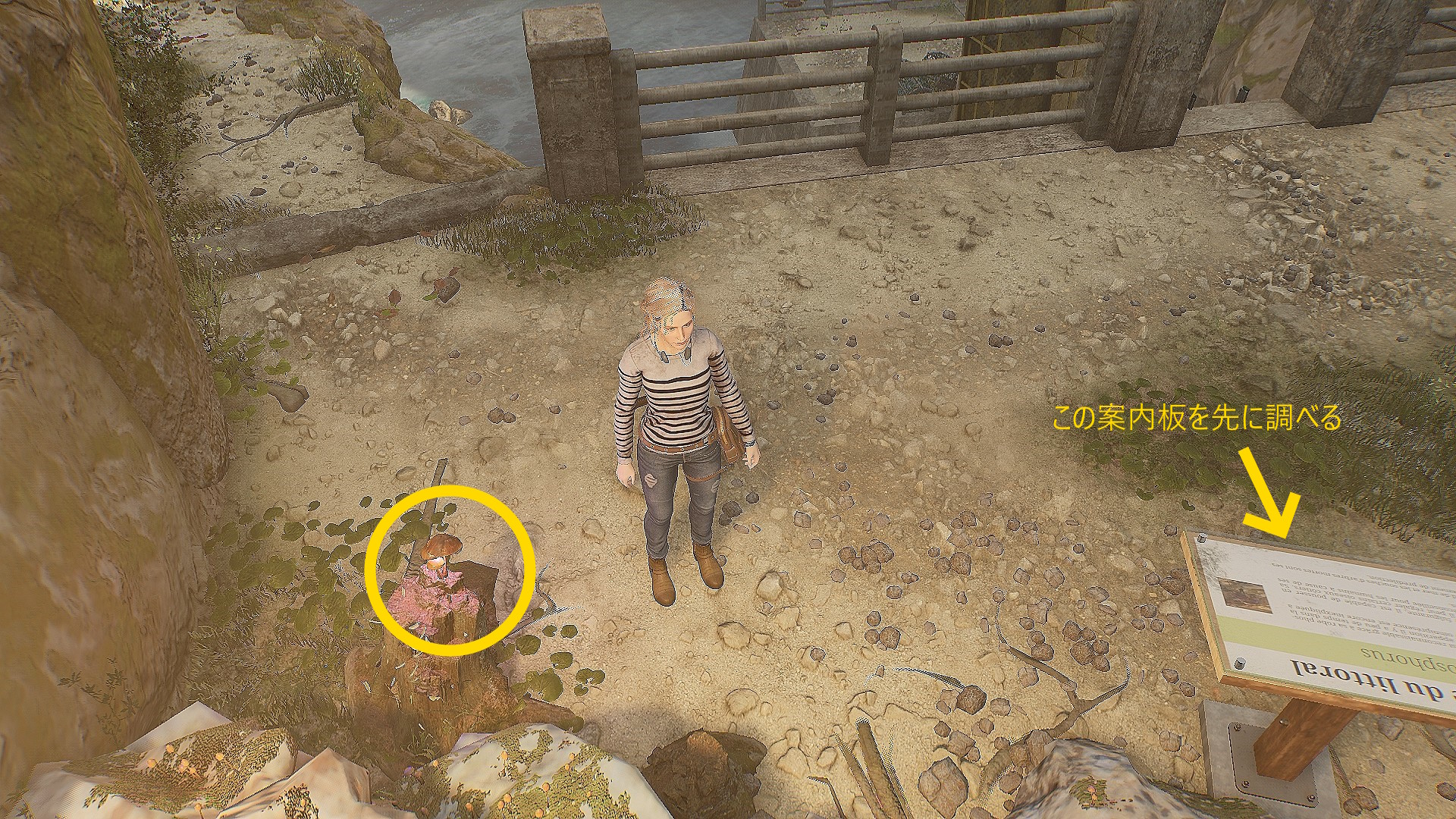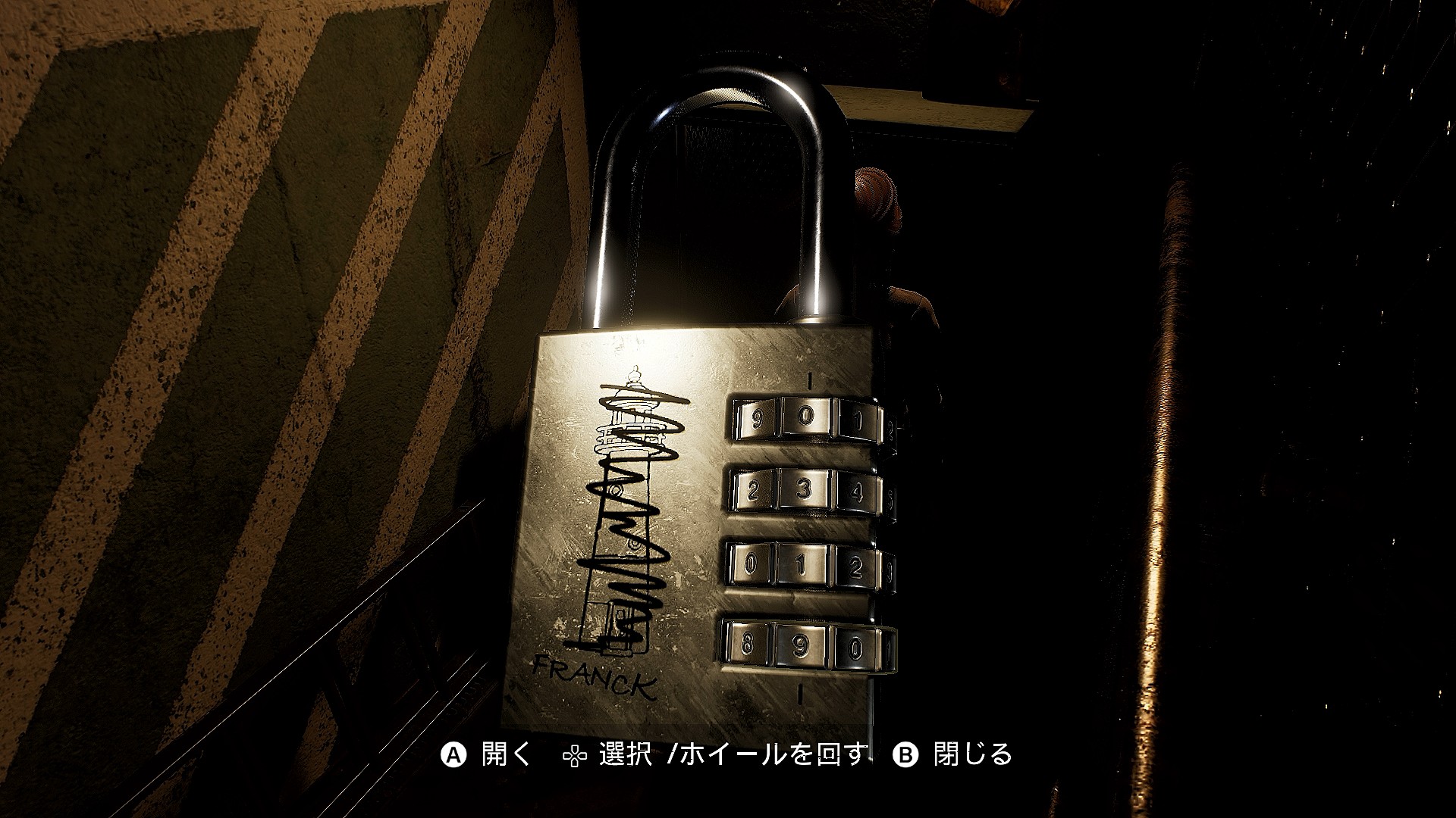 • そのまま少し左に進むと画面手前に黄色の案内板が見えるので読んでおく(読まなくてもあとの南京錠パズルは解ける)