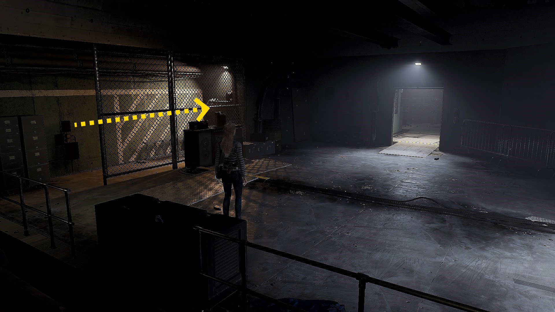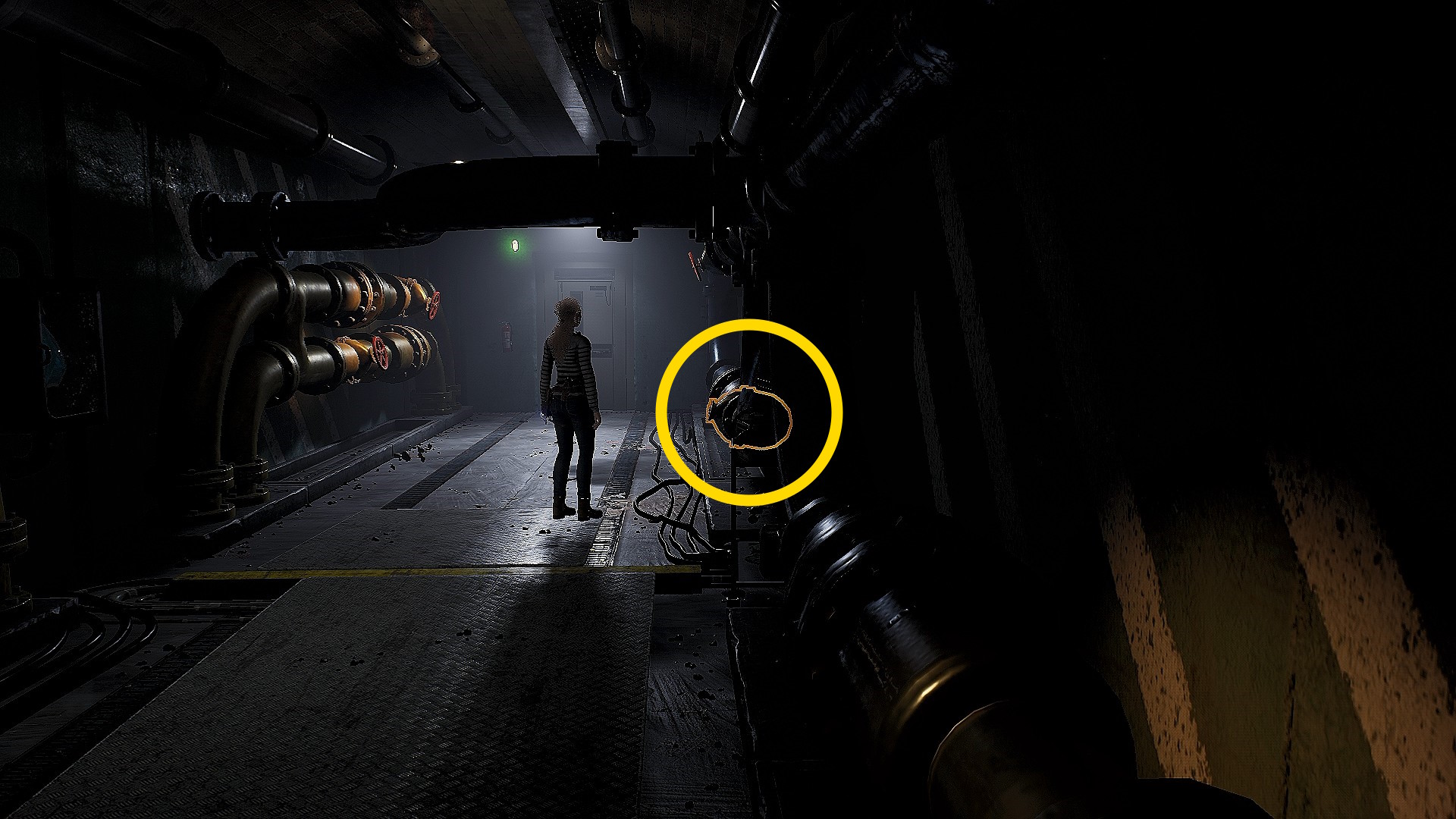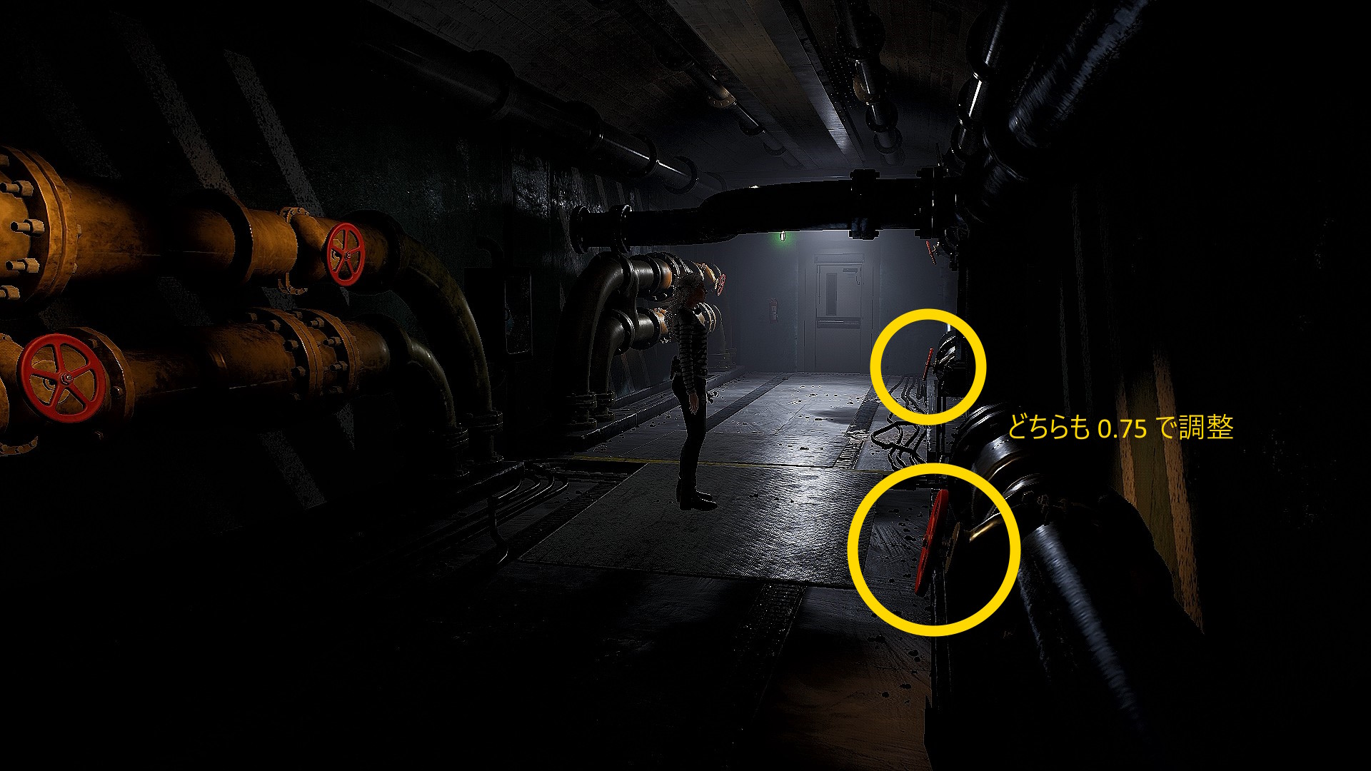 • 最下層に着いたら、目の前の明かりが灯る緑のドアはスルーして、画面手前に進む