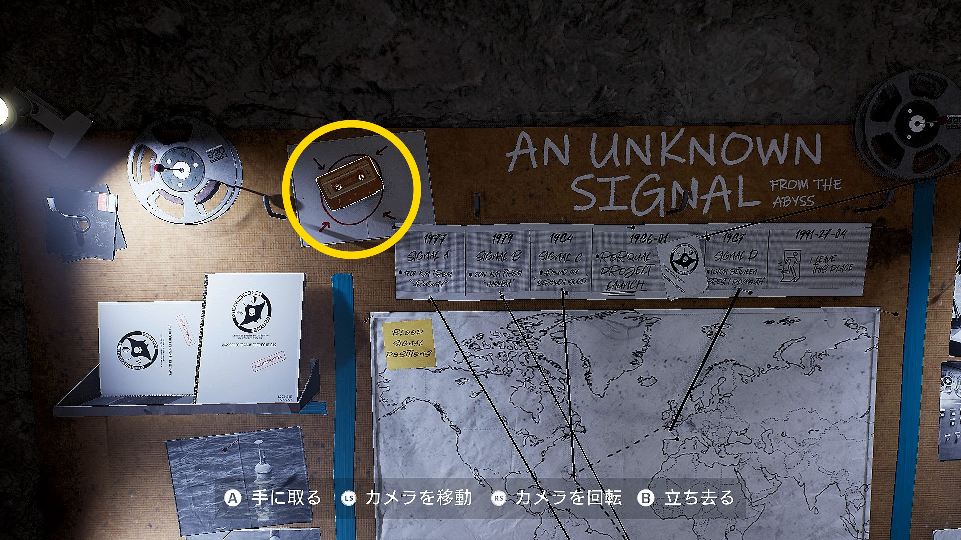 - 画面奥に進み「 AN ANKNOWN SIGNAL 」のボードを調べ、右上に貼られた 謎の信号「ブループ」(カセットテープ:9/39)を回収