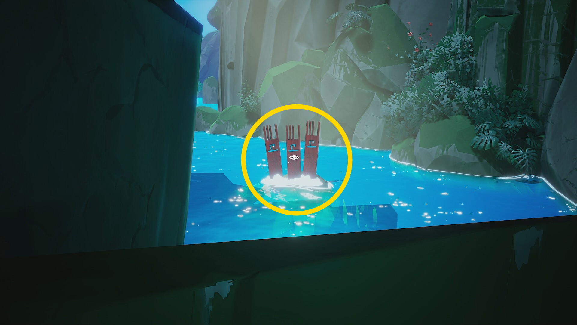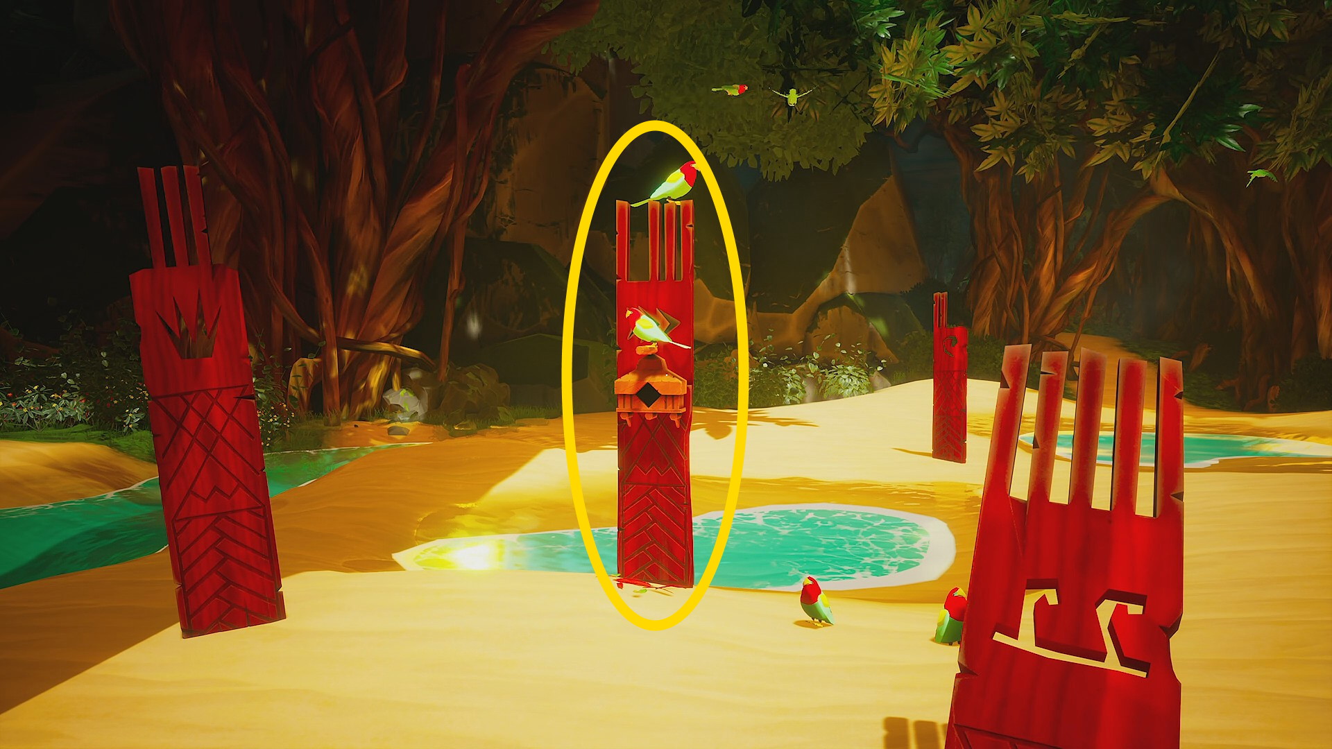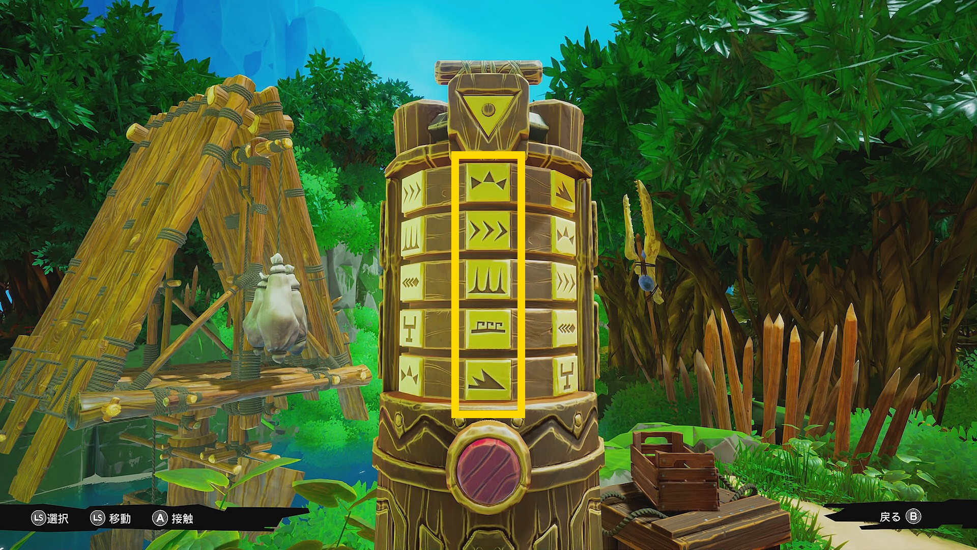 • 橋の手前に短いトーテムポールのようなものがあり、前面にパズル機構があり、背面にはパズルを解く順番が描かれている ⇒ 太陽・鳥・山・波・魚 の順
