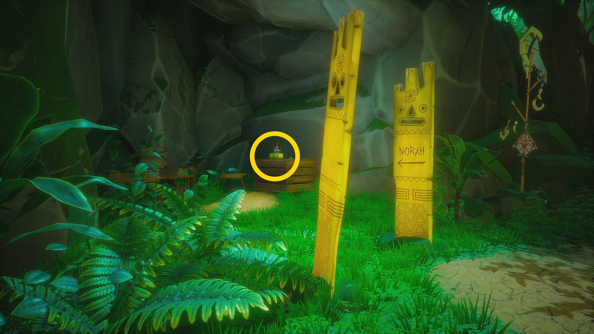 • ゲートを正面に見て右後ろを振り返ると木箱の上に箱が置いてある