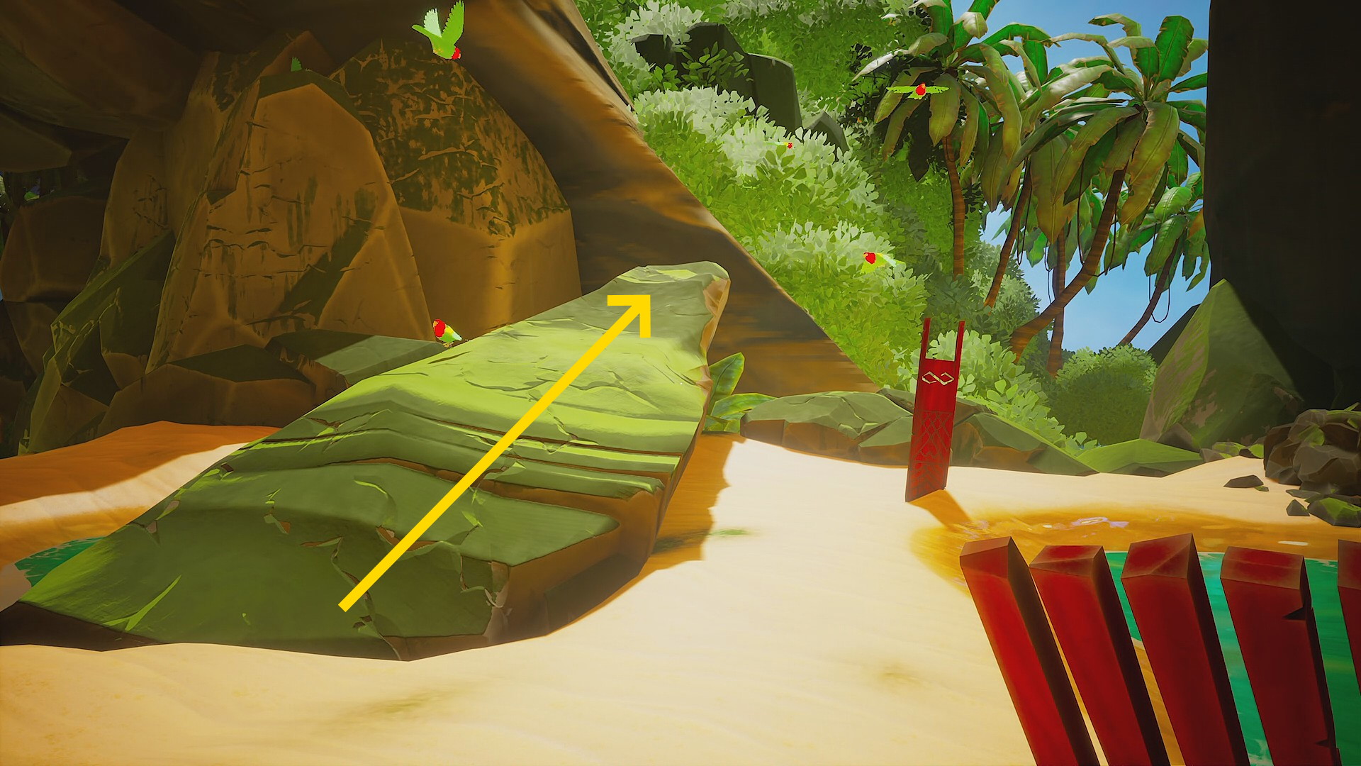 • 鳥のシンボルに戻り、それを正面に見て右後ろを振り返ると緑色のスロープのような岩が見える