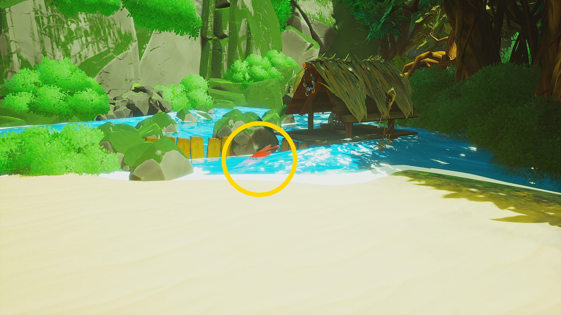 • 正面に進んでいくと川の上に建つ小屋があり、その近くの水中に赤いシンボル(魚のシンボル)が見えるので調べる