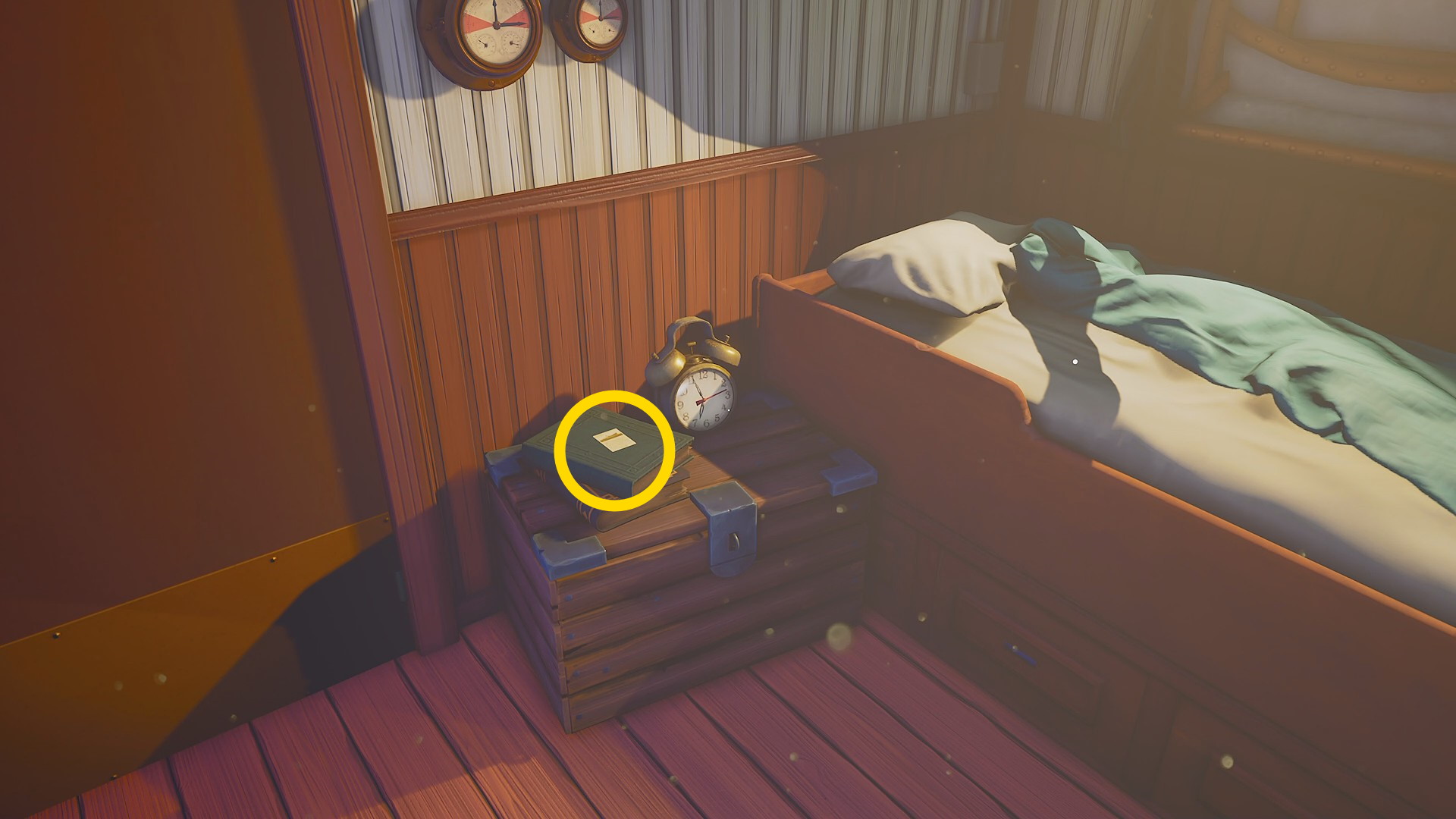- 寝ていたベッドの枕元近くの木箱(目覚まし時計などが乗っている)に緑色の本があり、その上に 乗船証 があるので確認