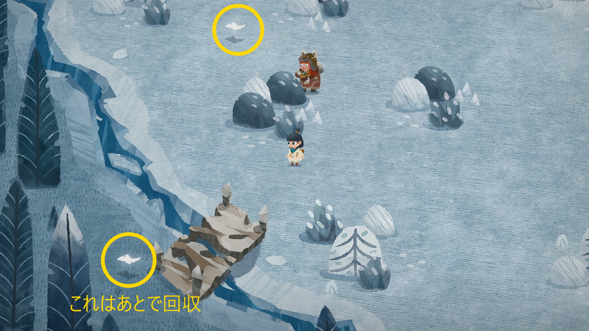 • 強風のため、風に逆らって上に移動することは不可能であるため、横移動したり地図を回転させて下に移動しながら、およそ中央に置かれたリュックを回収する (落下するような形で回収するため A 連打しておくとよい)