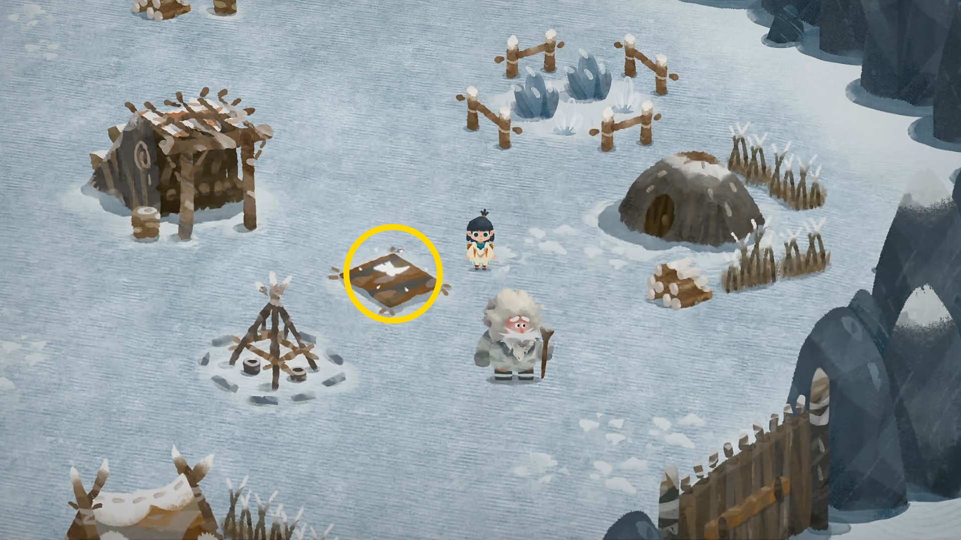 • 基地の東側のゲートを開ける手前、地面に 枝 (雪だるまの腕) が落ちているので回収