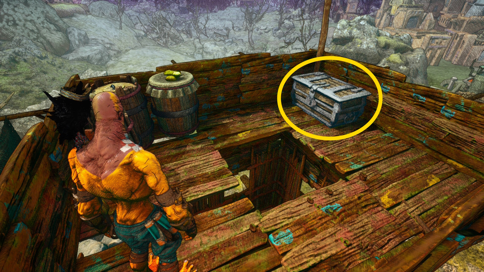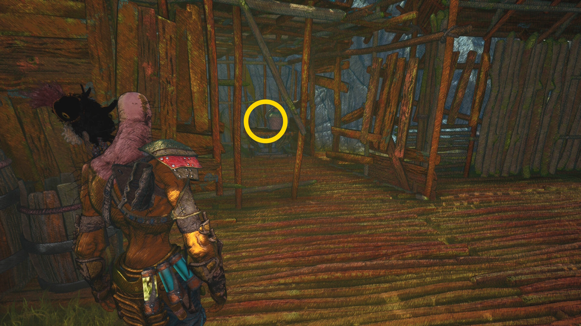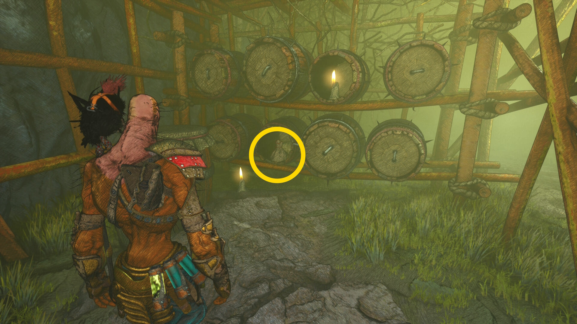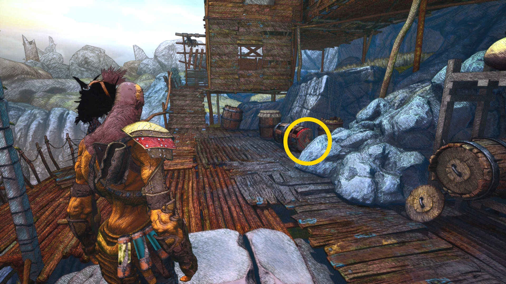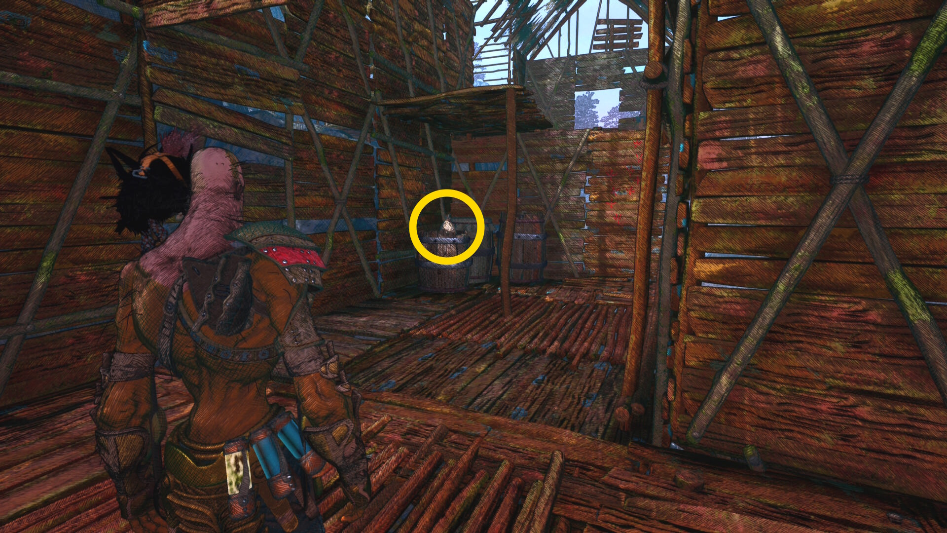 - 中に入って壁を登り、右を向くと奥の樽に革の小袋