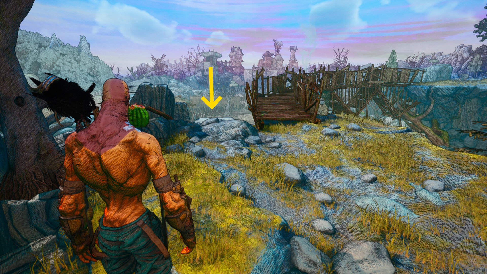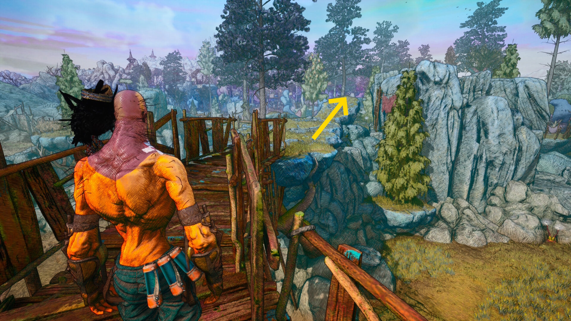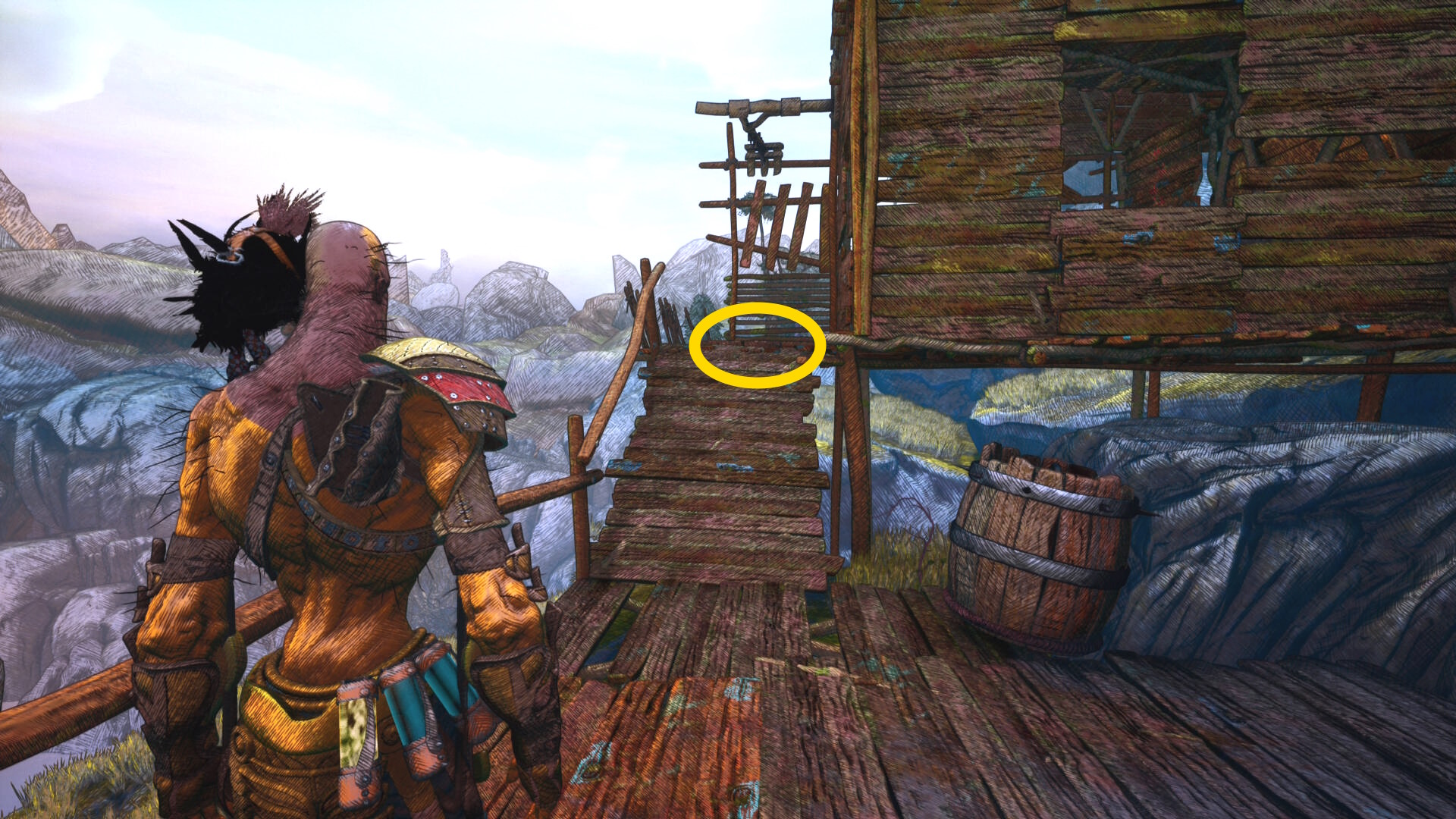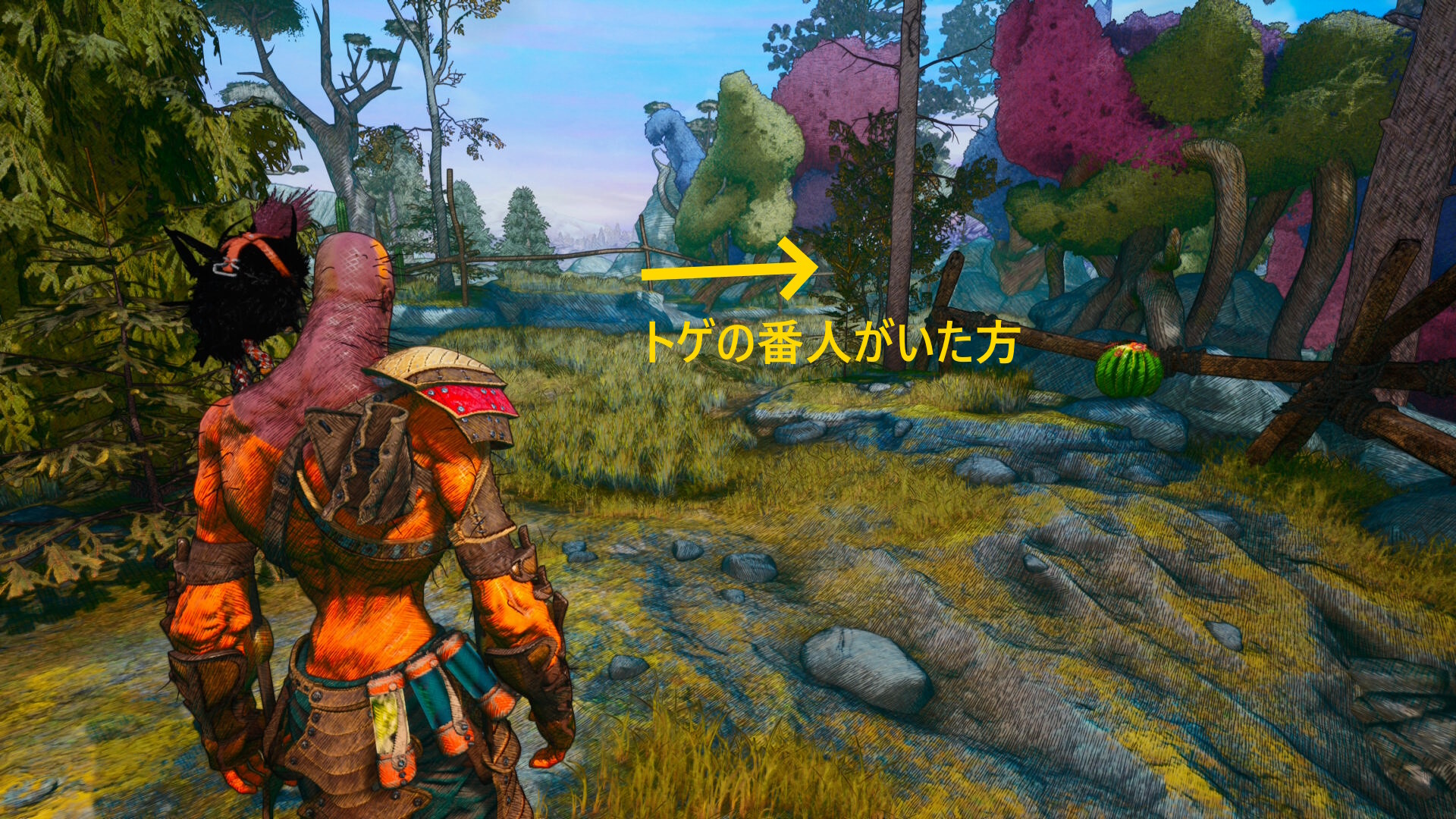 - 町から出たら、正面奥に見える木の板のスロープを登り、奥に進む