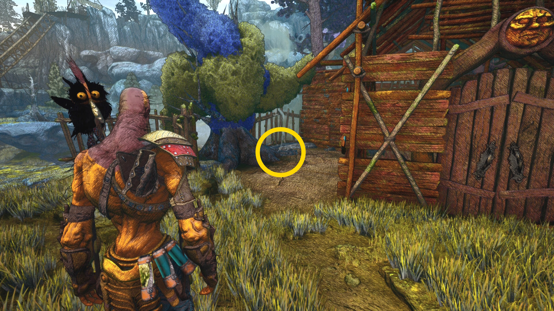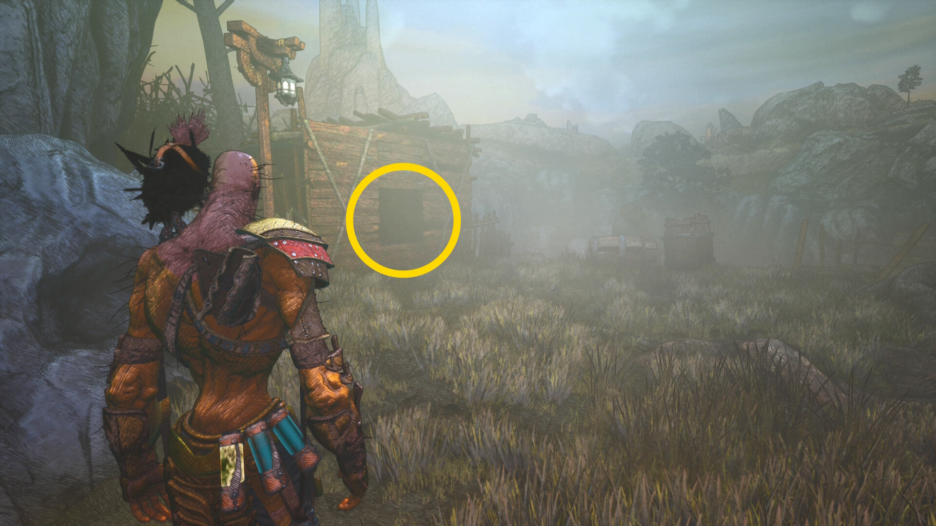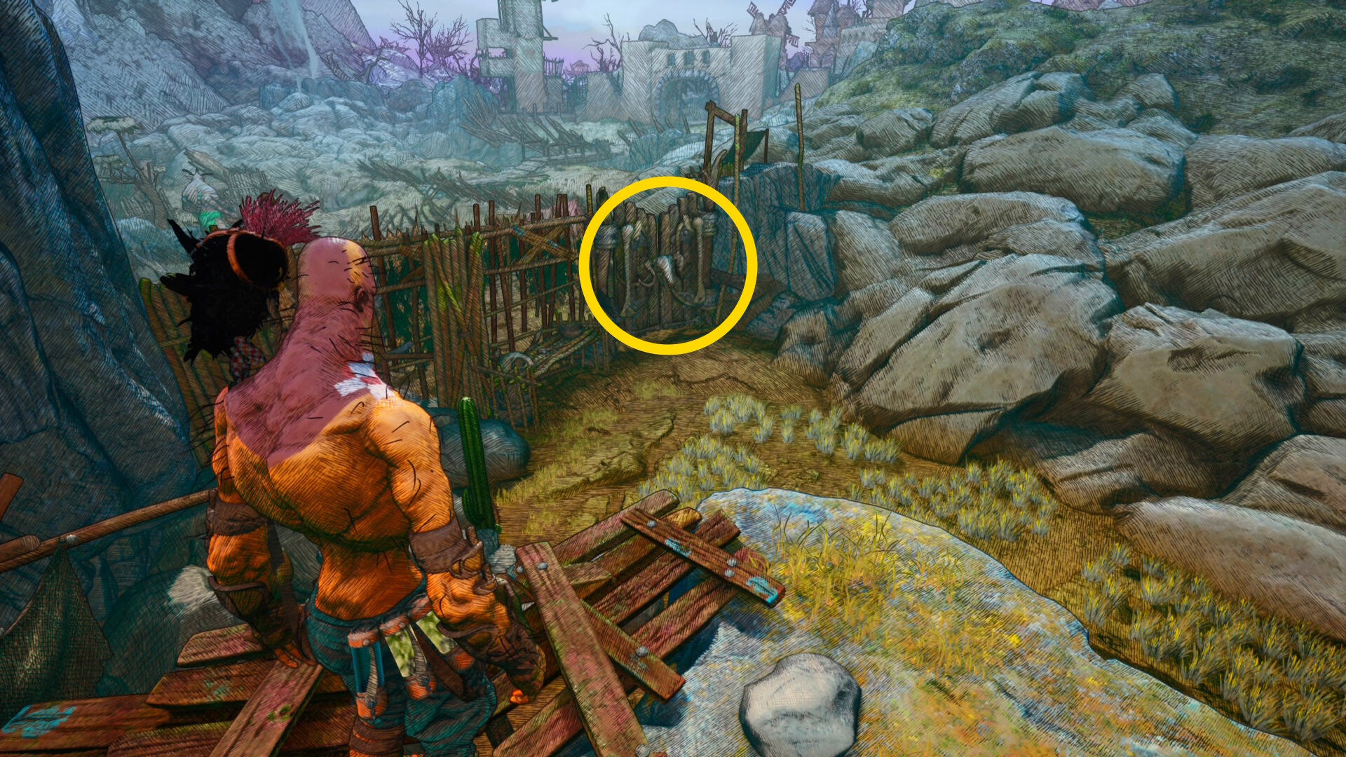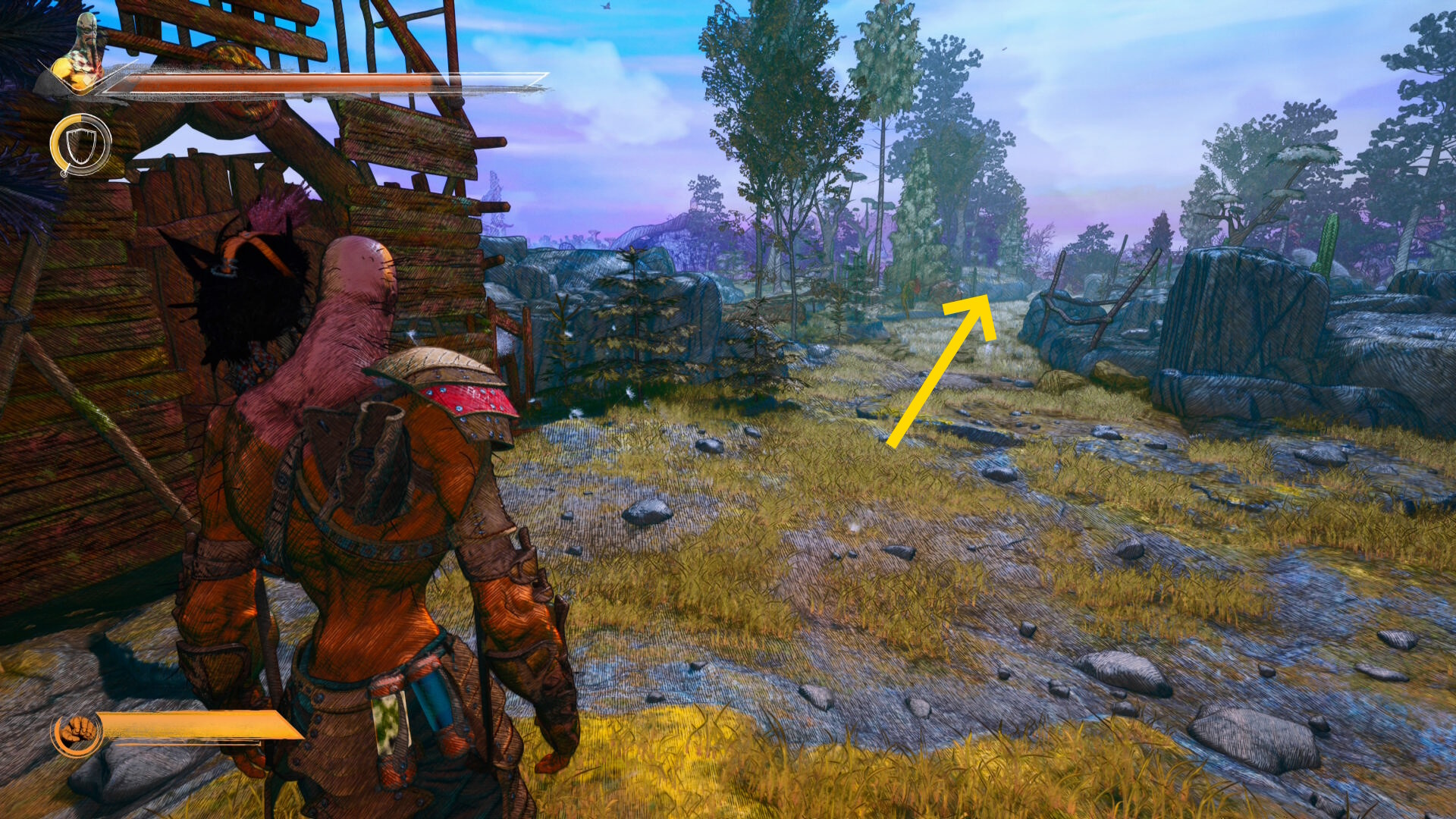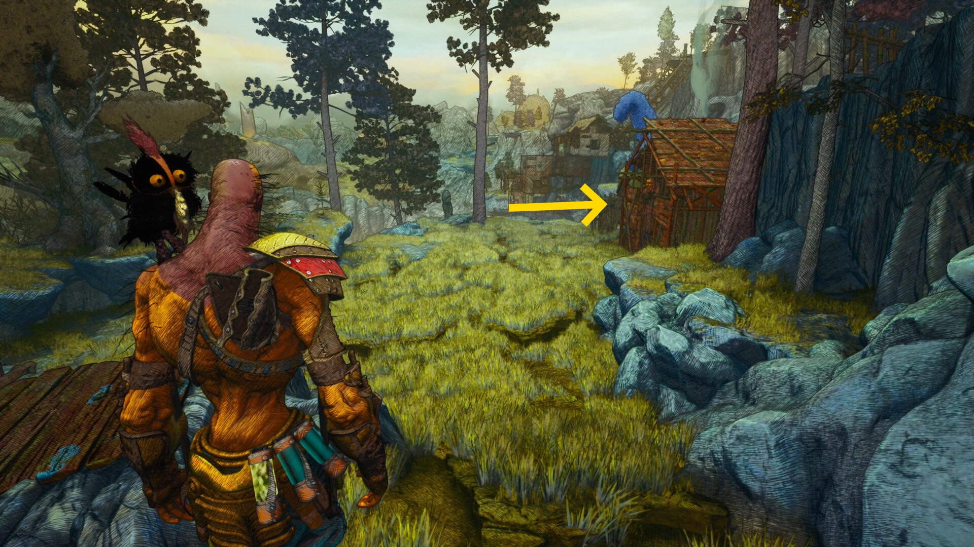 - 町から出たら、正面奥に見える木の板のスロープを登り、奥に進む