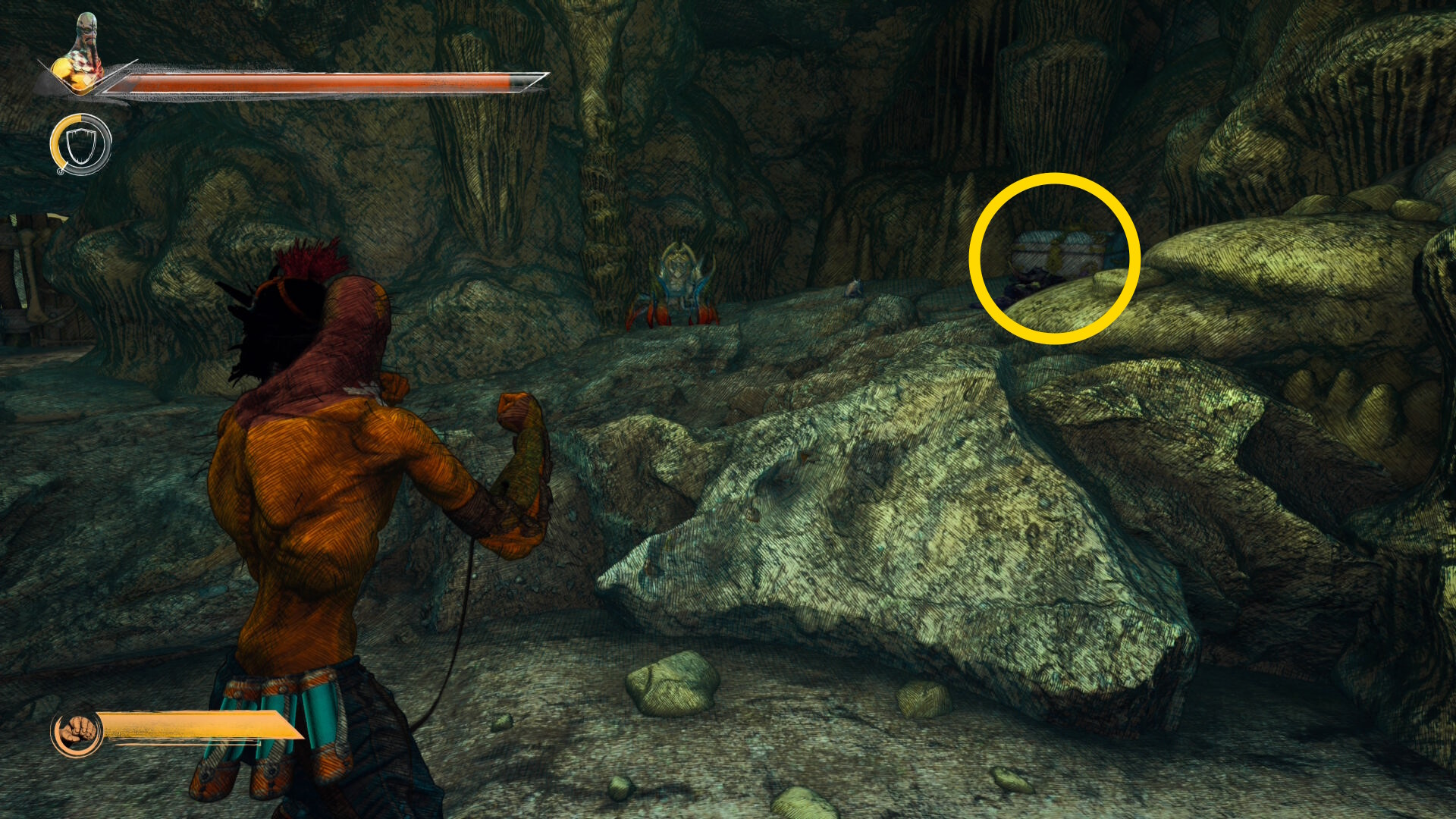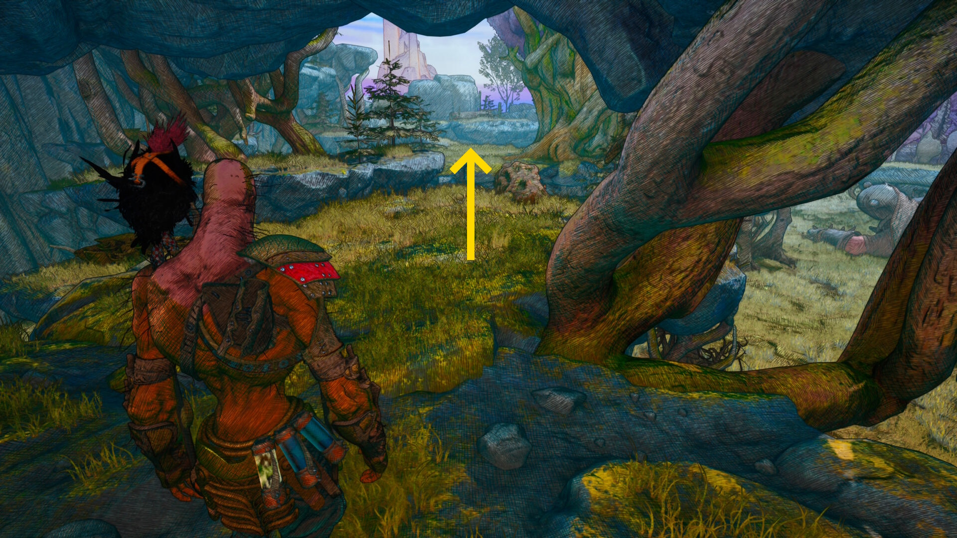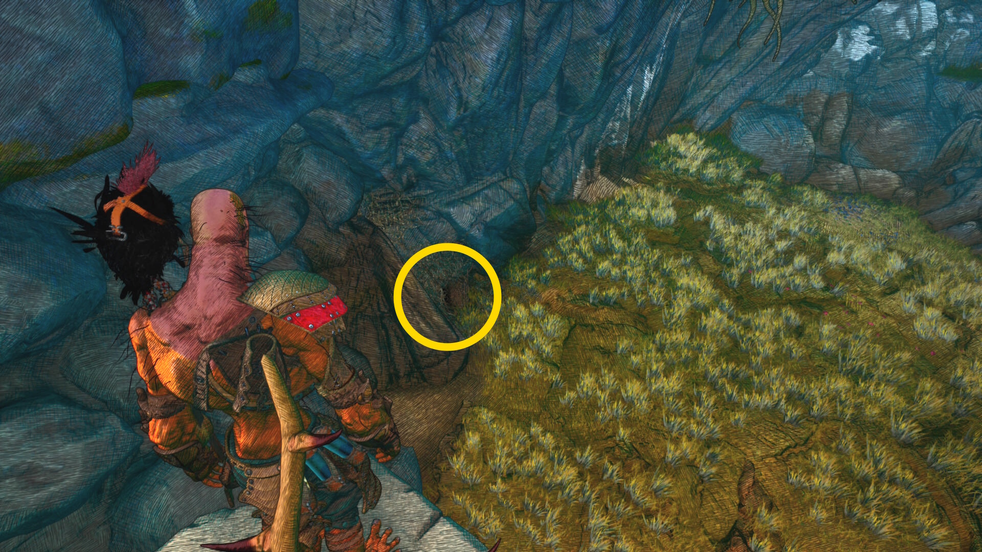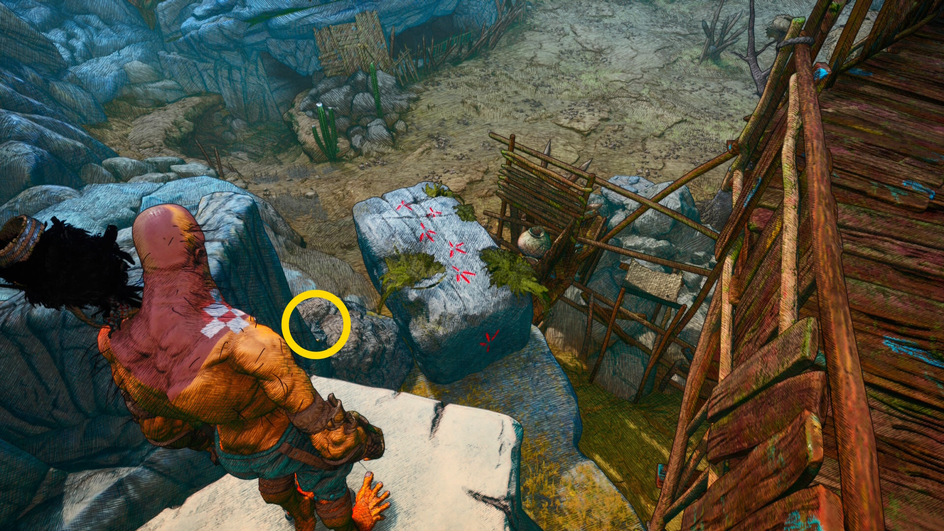 - 右前方の乾いたトゲの茂みは通過できず、正面奥の壁は押せる岩があって登れず、なので左に U ターンするように進む