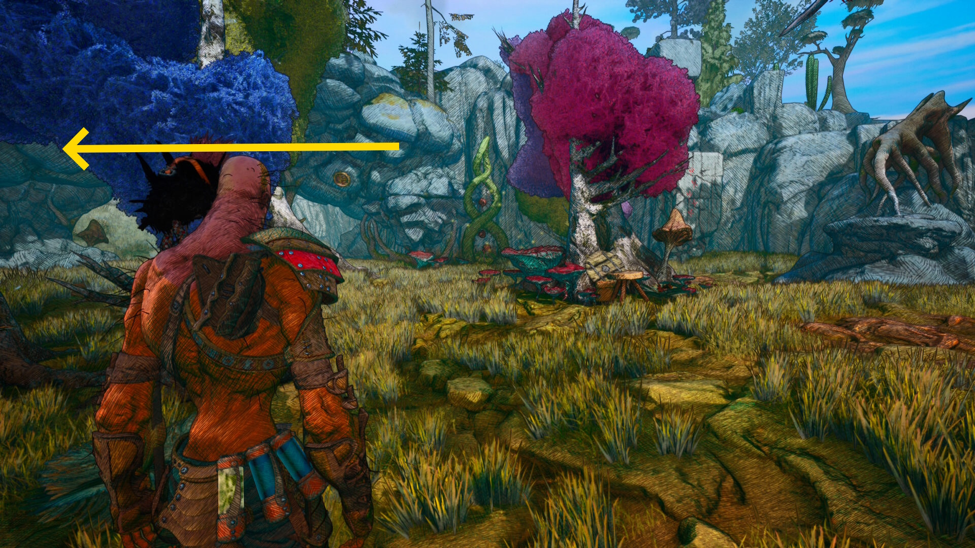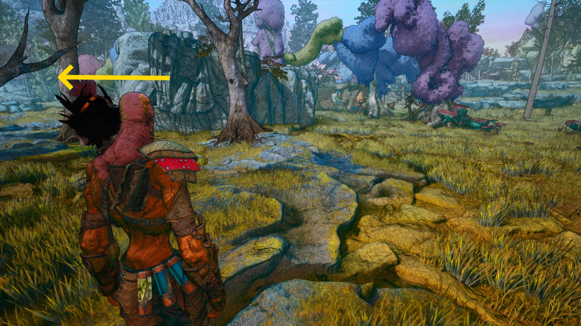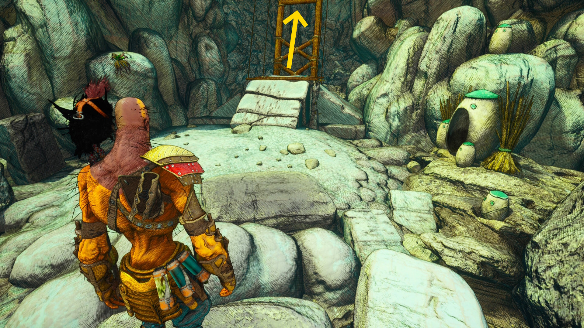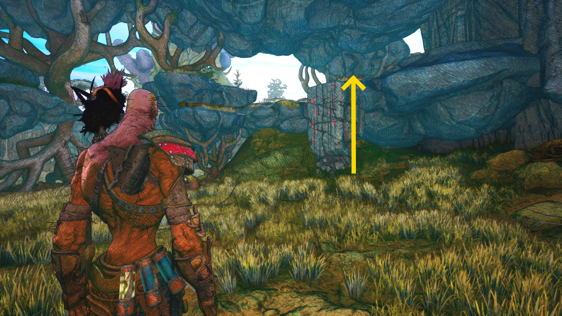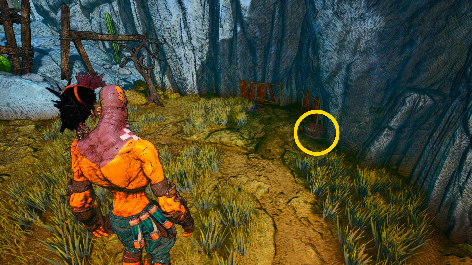 - 右前方の乾いたトゲの茂みは通過できず、正面奥の壁は押せる岩があって登れず、なので左に U ターンするように進む
