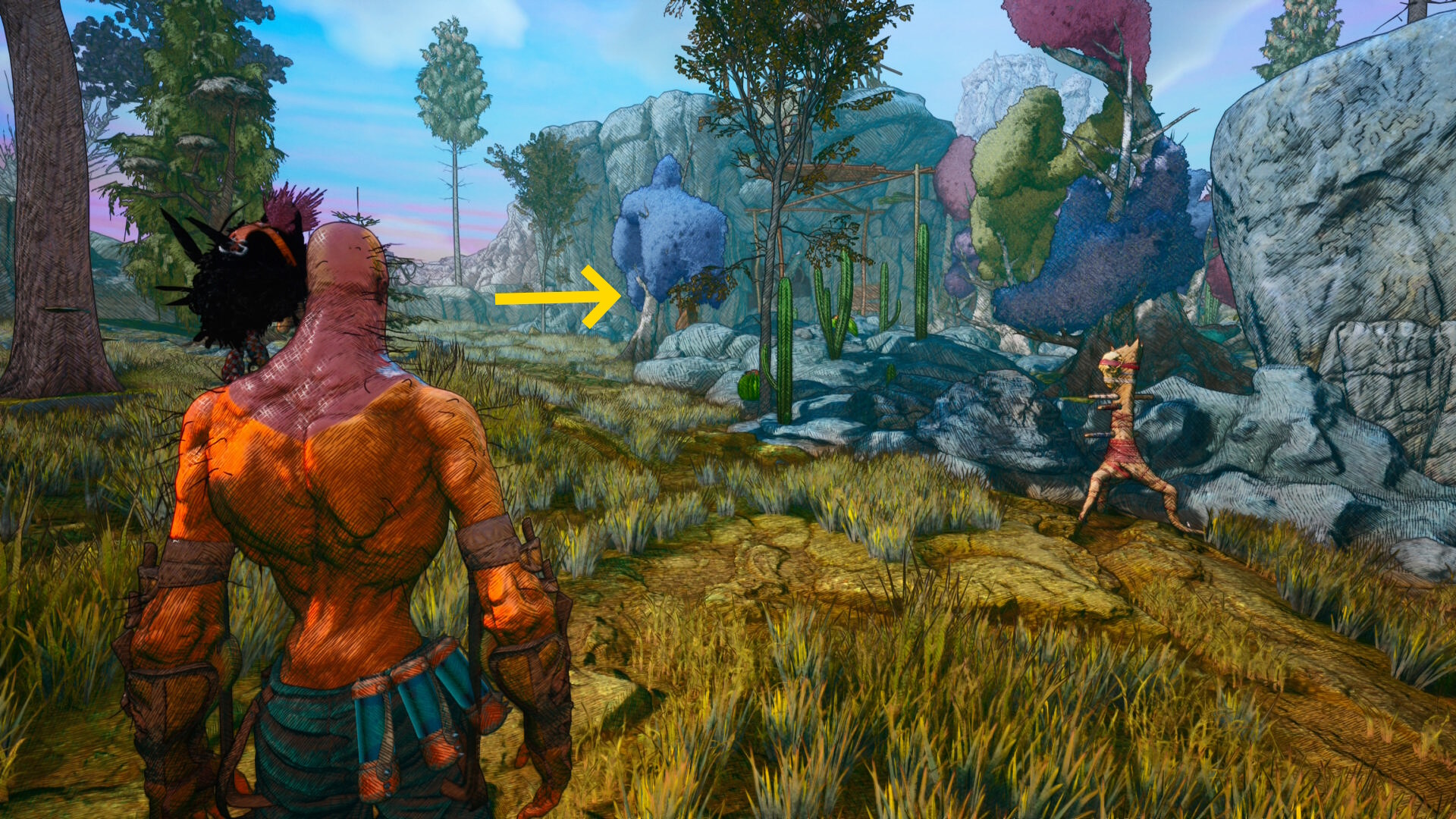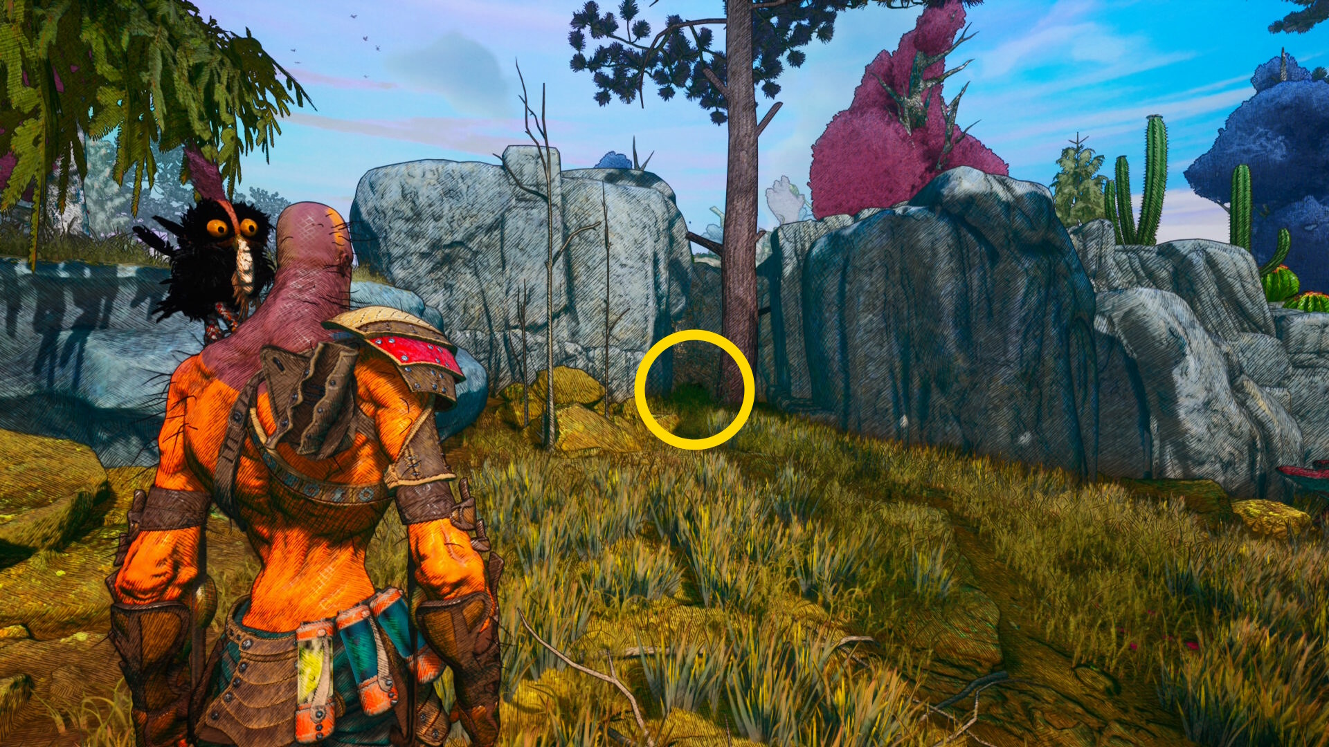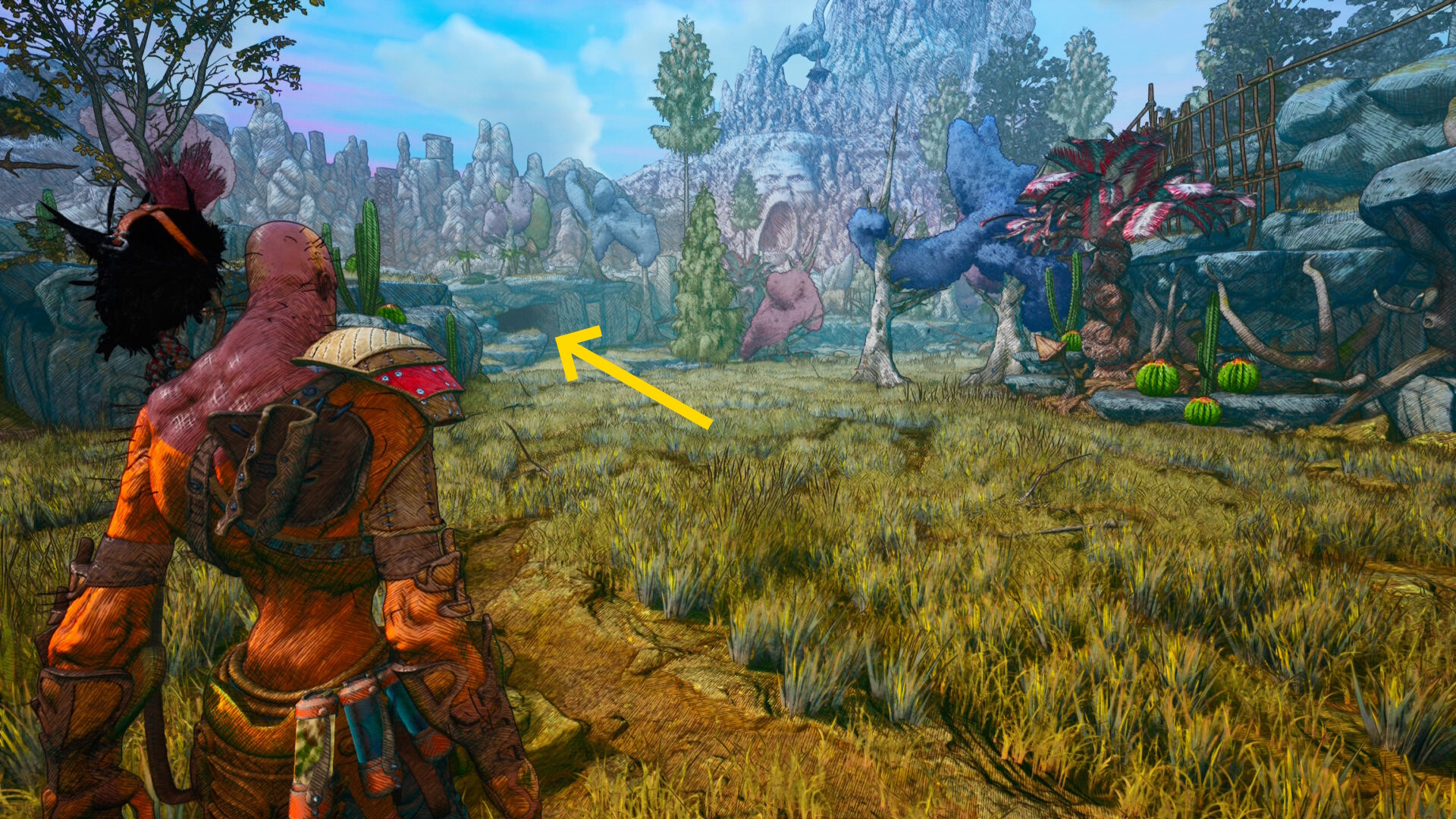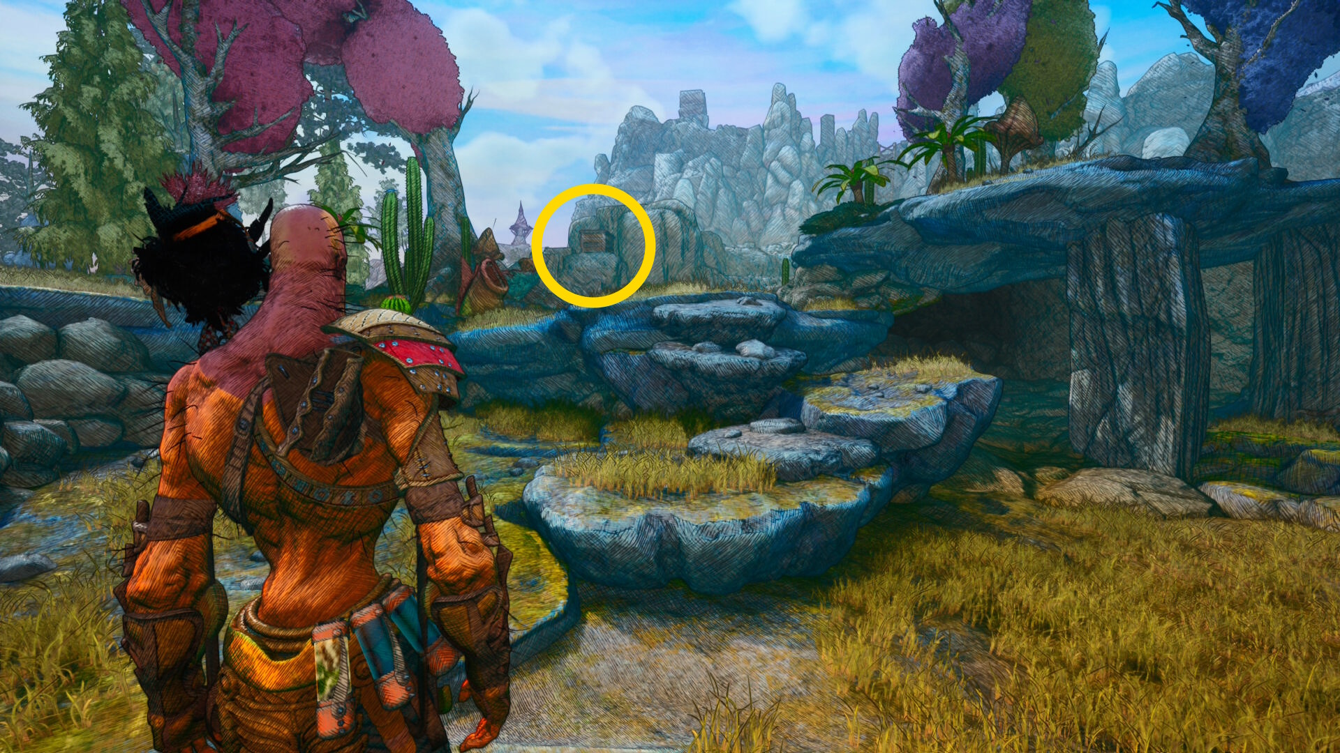 - 右前方の乾いたトゲの茂みは通過できず、正面奥の壁は押せる岩があって登れず、なので左に U ターンするように進む