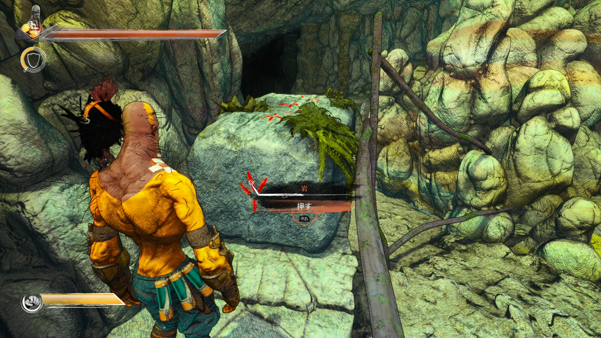 - 洞窟を抜け、押した岩を登ってエリア移動