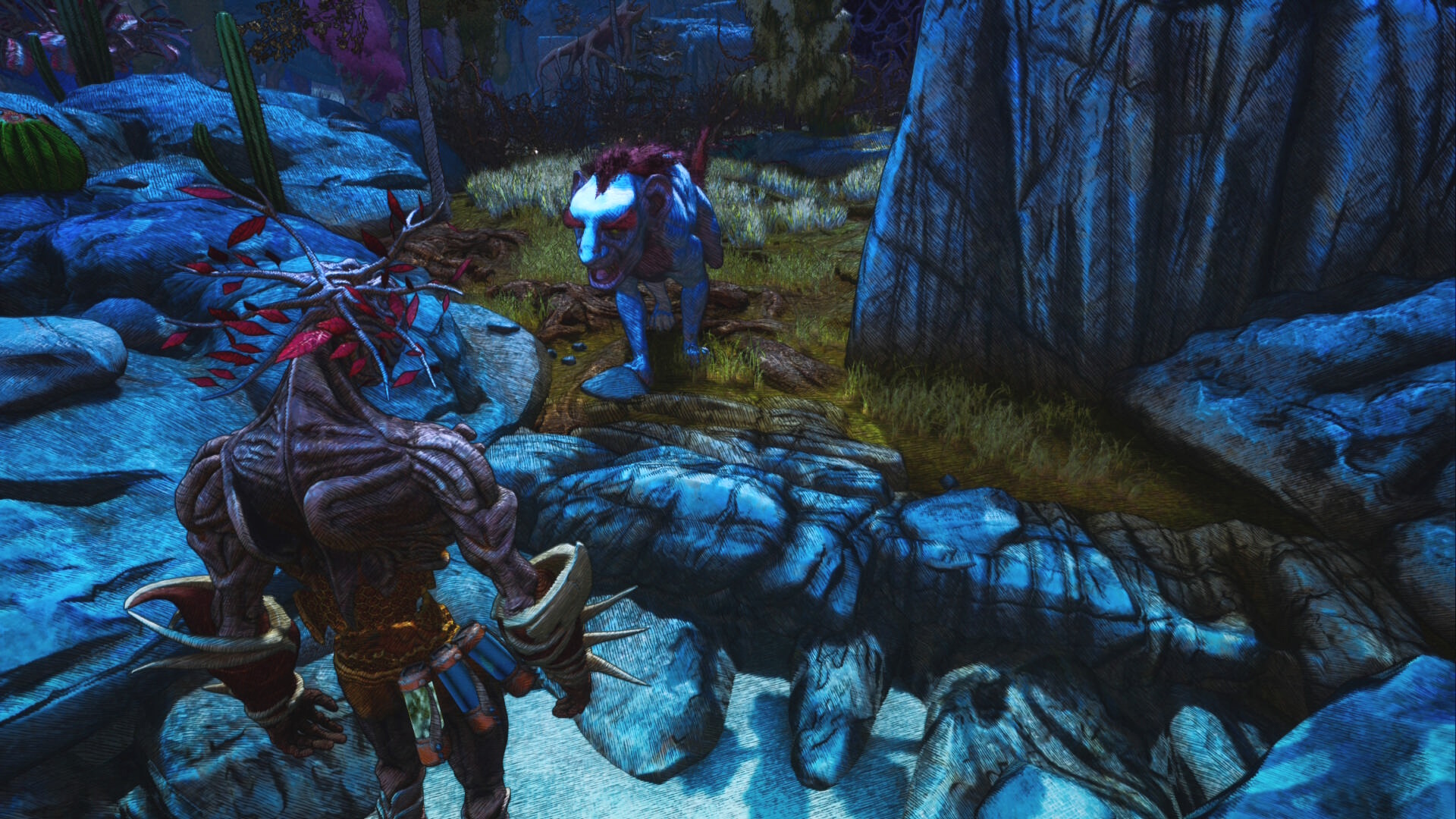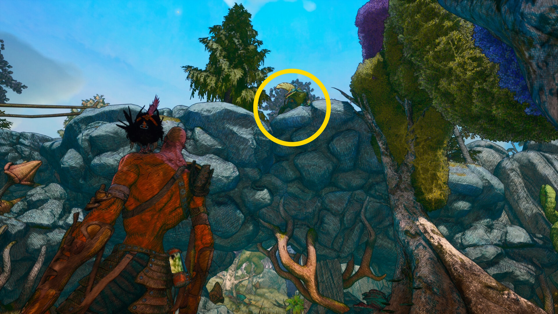 - 茶色の人面獣が最初に休んでいた先、頭上の岩場にドハデトリクスがいる