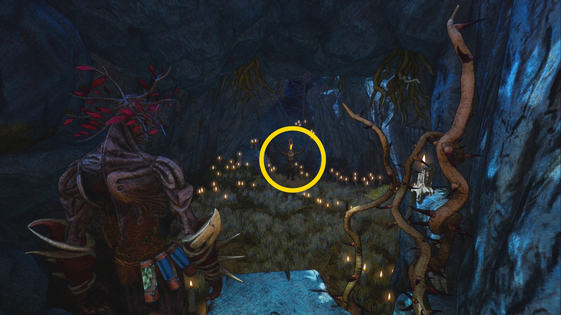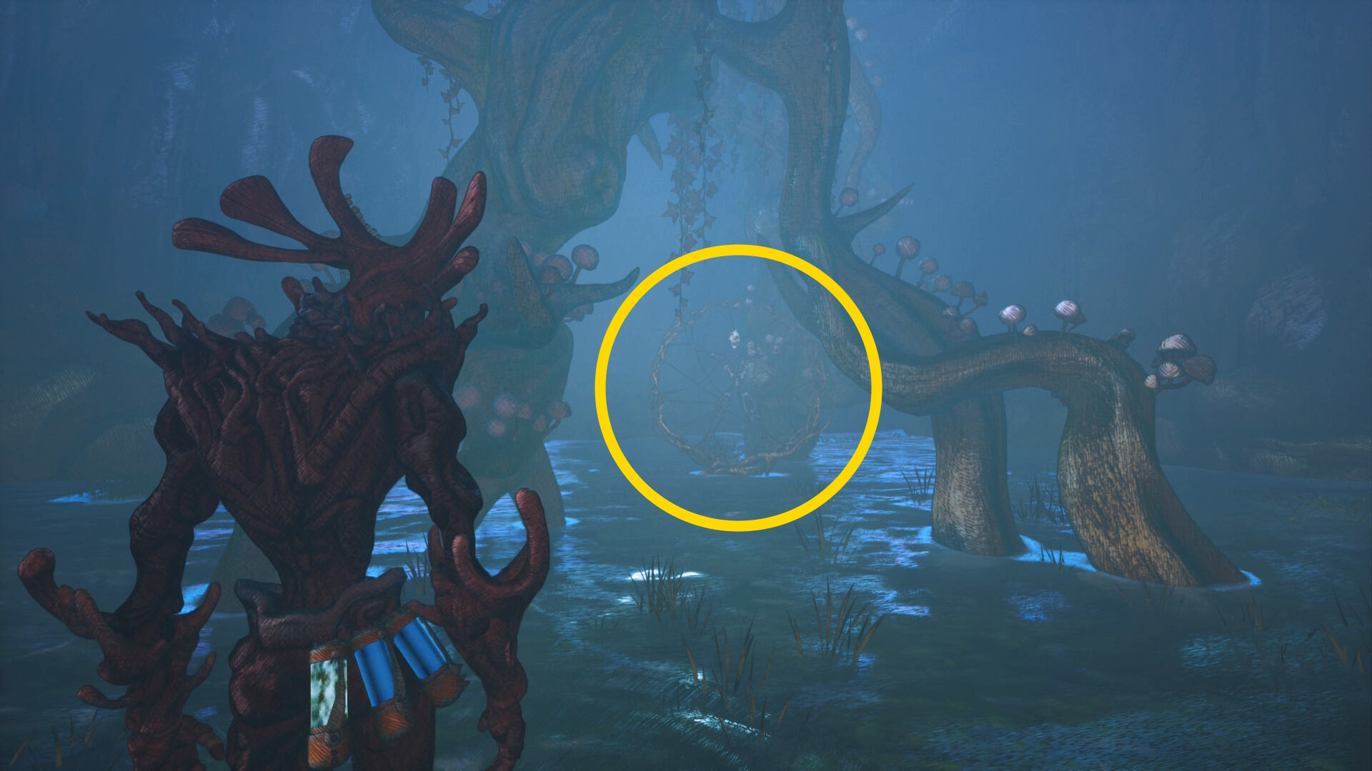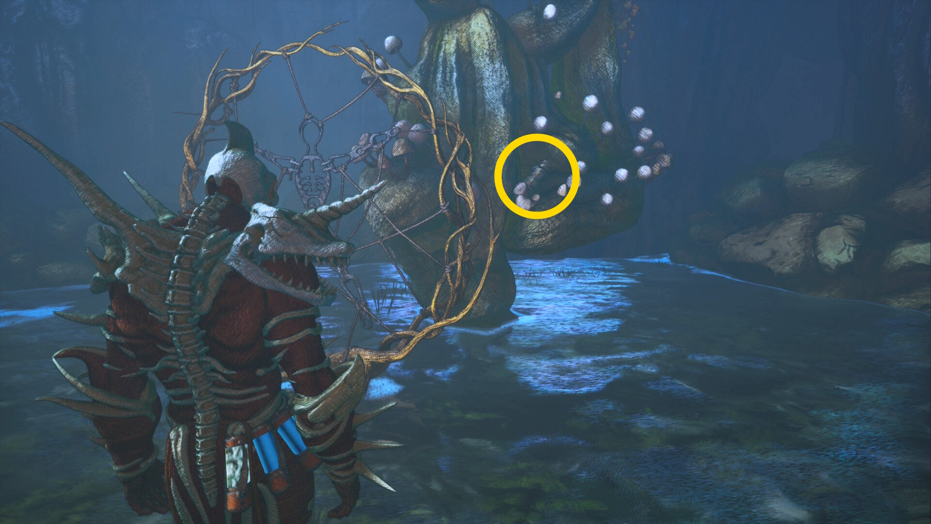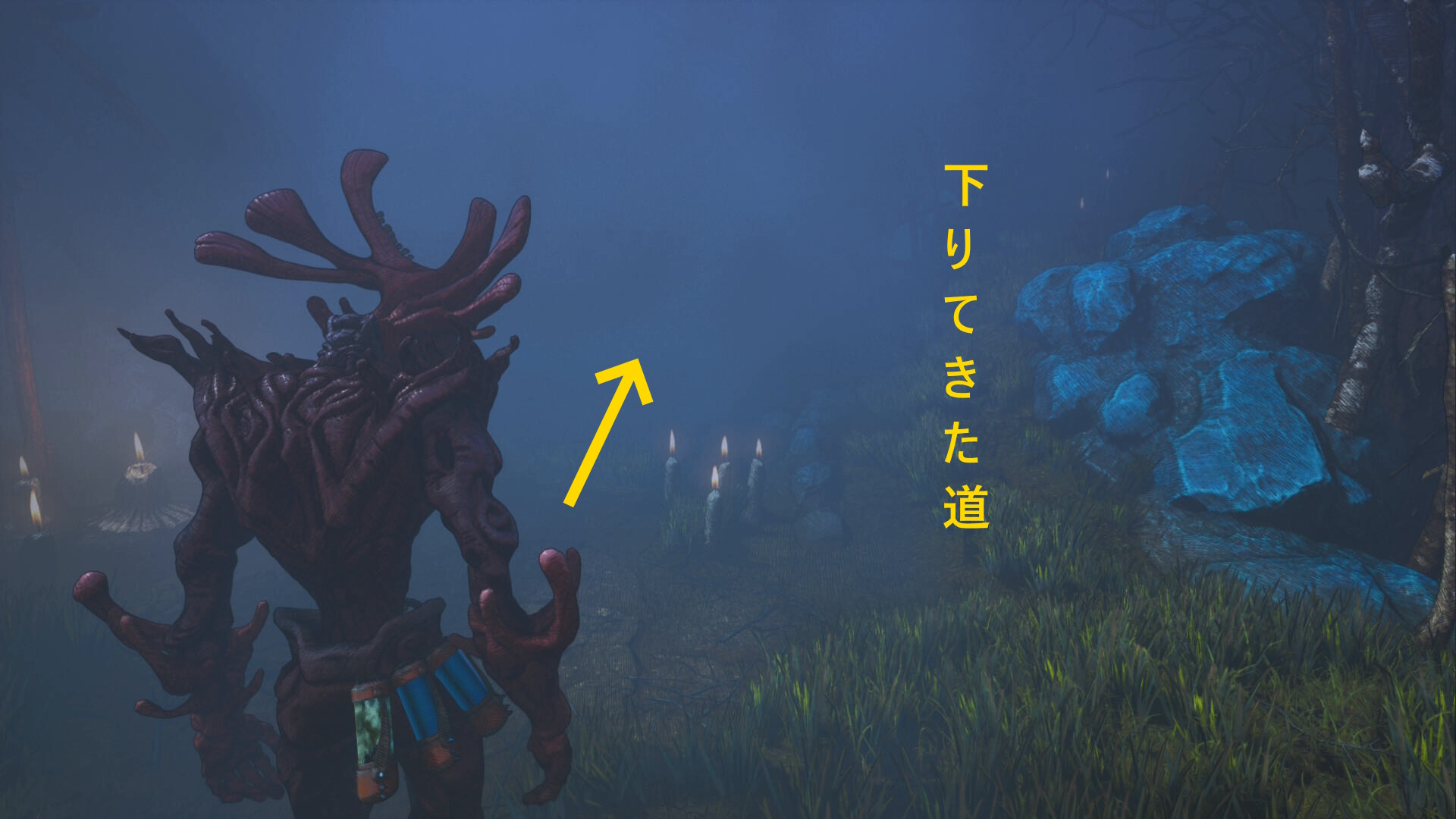 - 少し前にコーウィッドと杖持ちと戦ったところを経由してオオグマムカデがいた水場に戻る(豆像の釜があるところ)