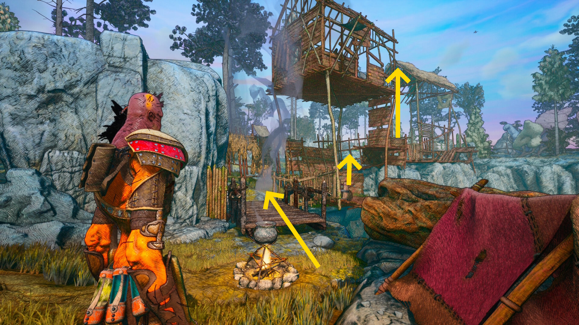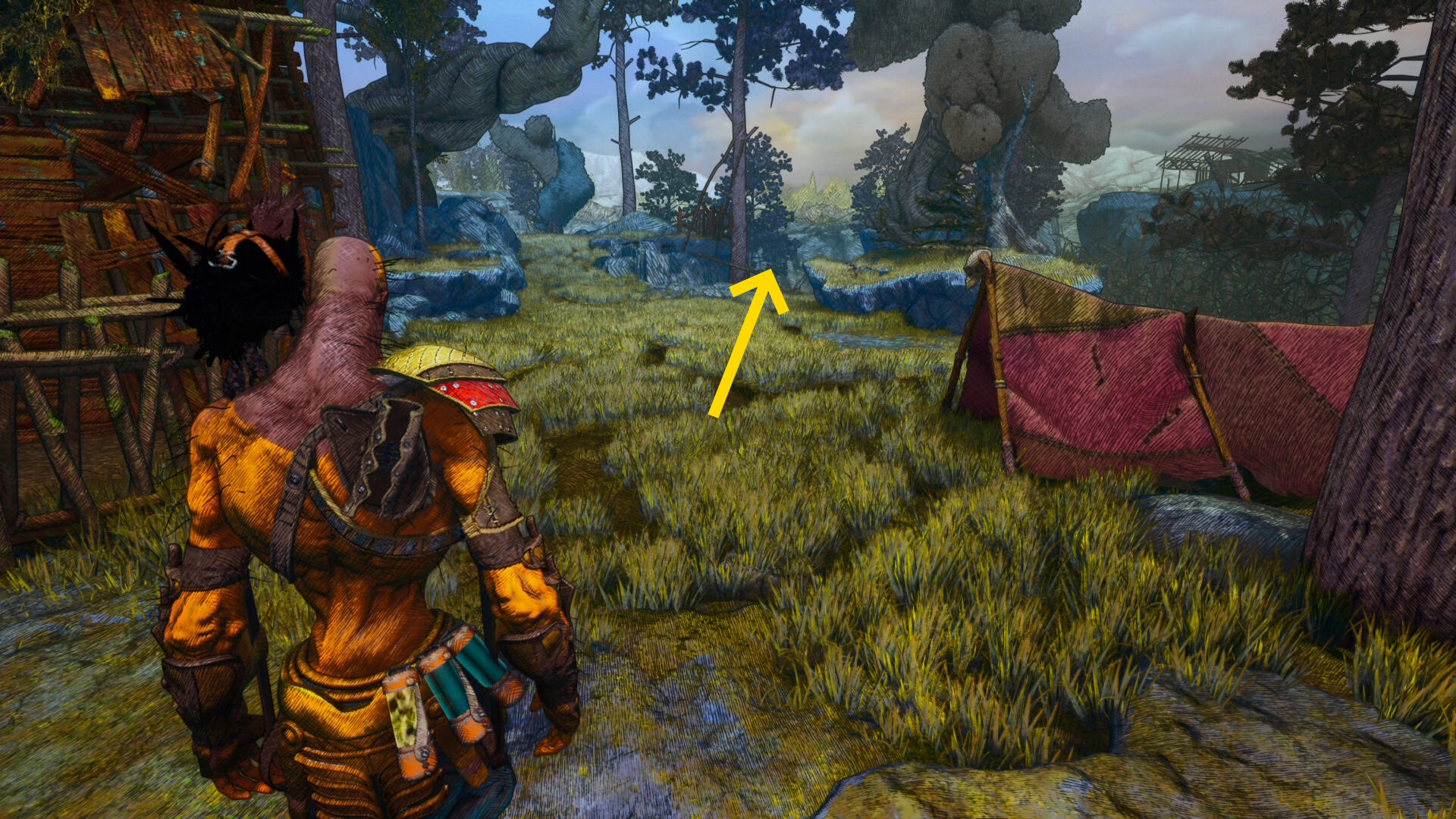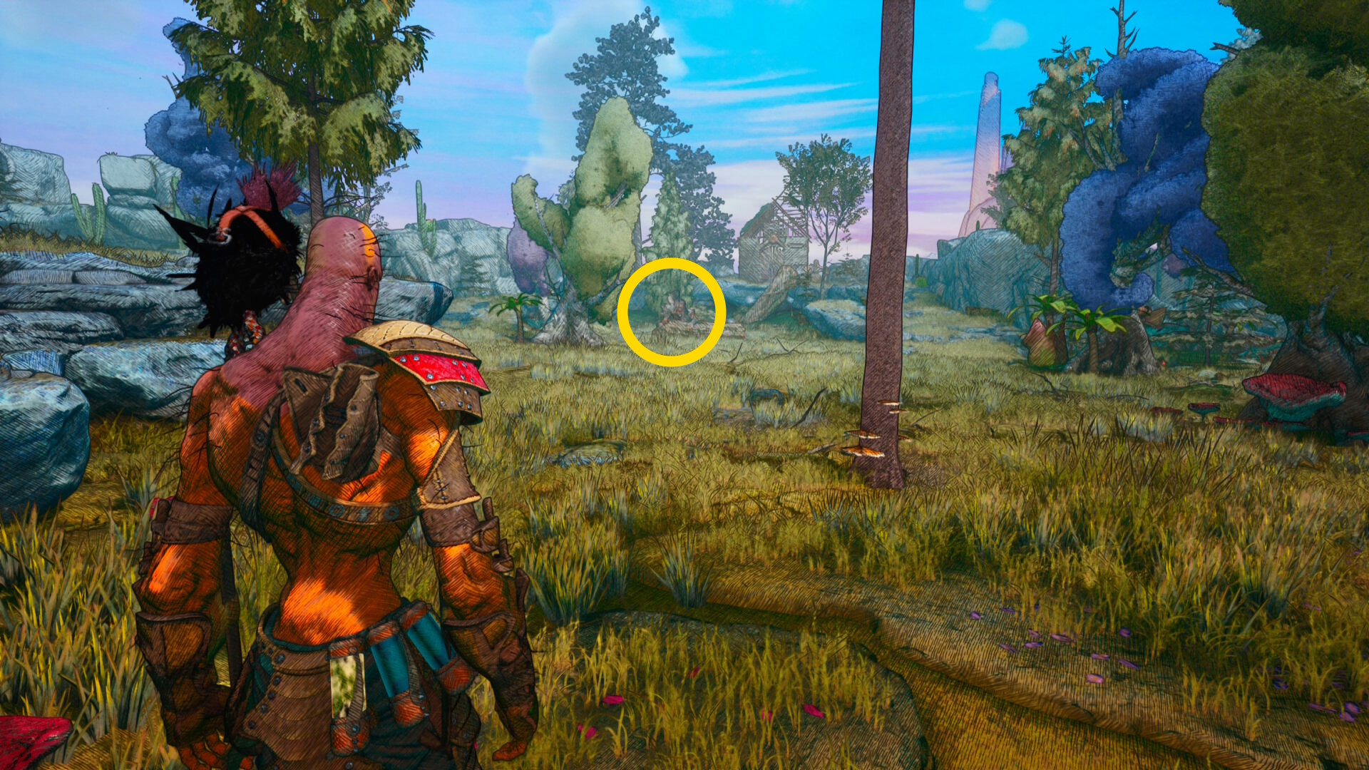 - カットシーン後、NPC の左脇を通って 野営地を設置 することができる(便宜上、第1キャンプと呼ぶ)