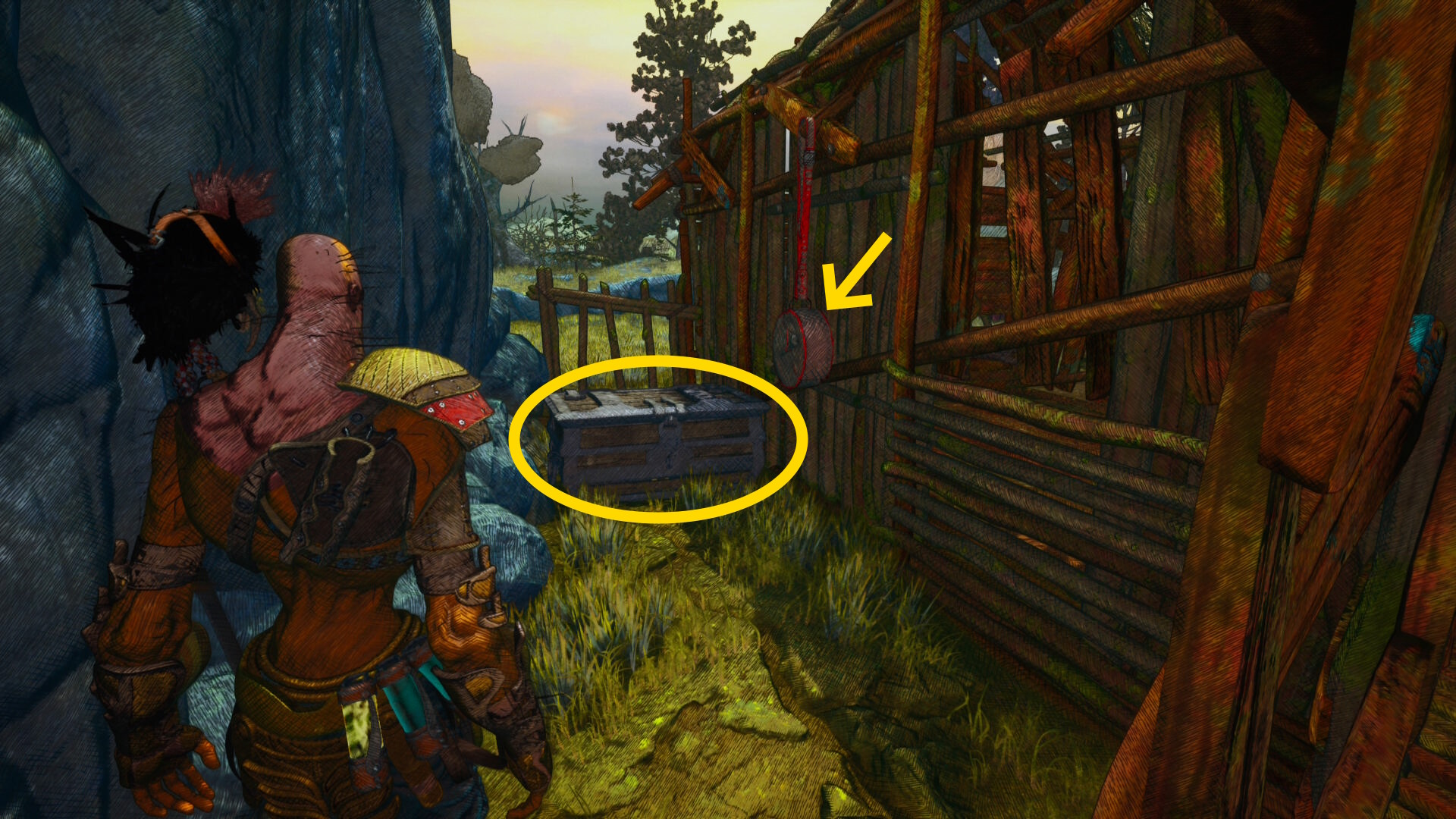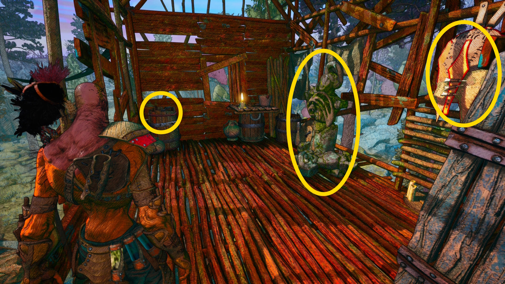 - ドアの左側にある棚にストーンハンマー(武器)あり
