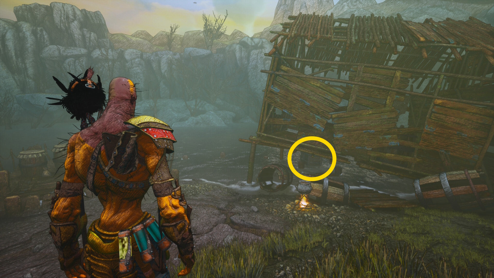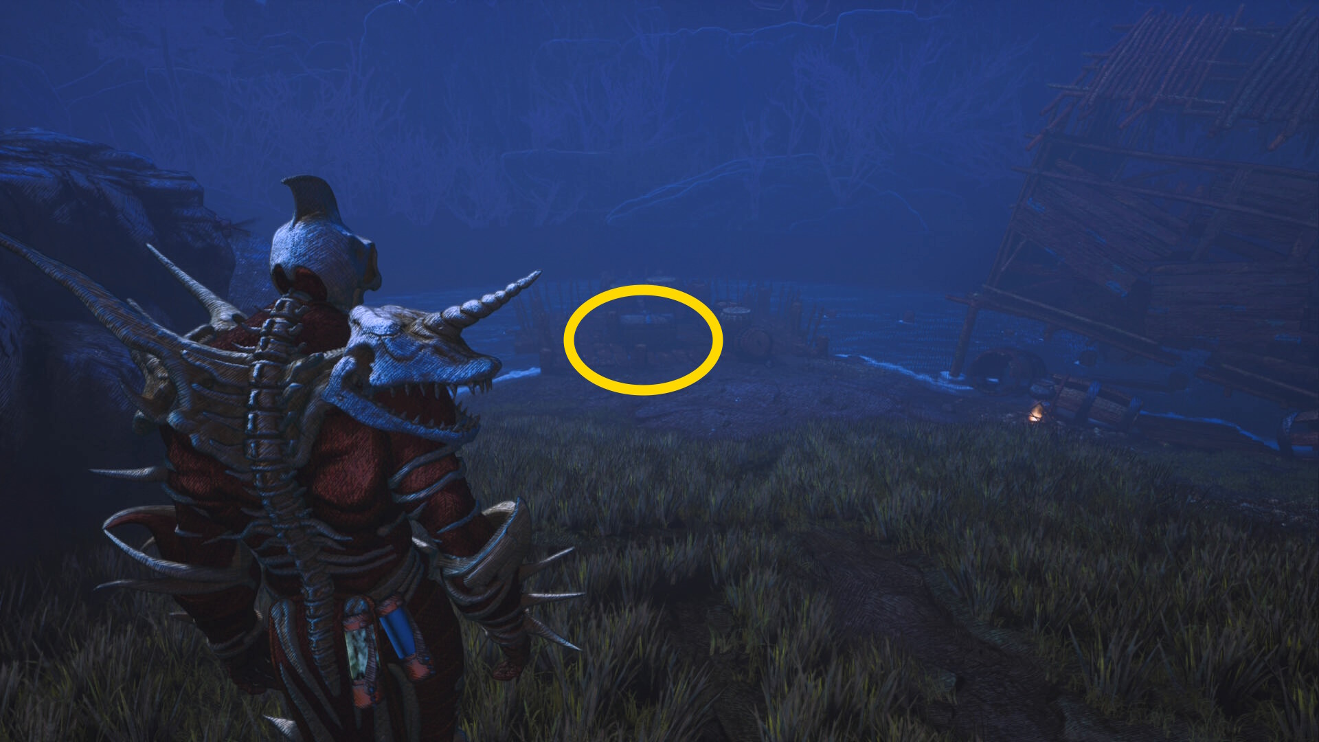 - 浅瀬の右奥にはフリッシュ、サメ蛙、朽ちたボートのところにアイテム