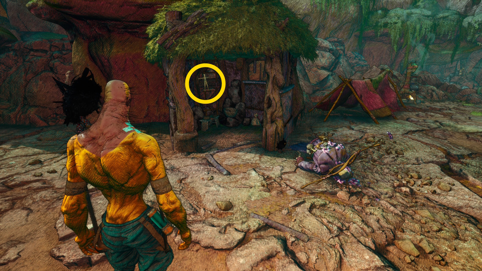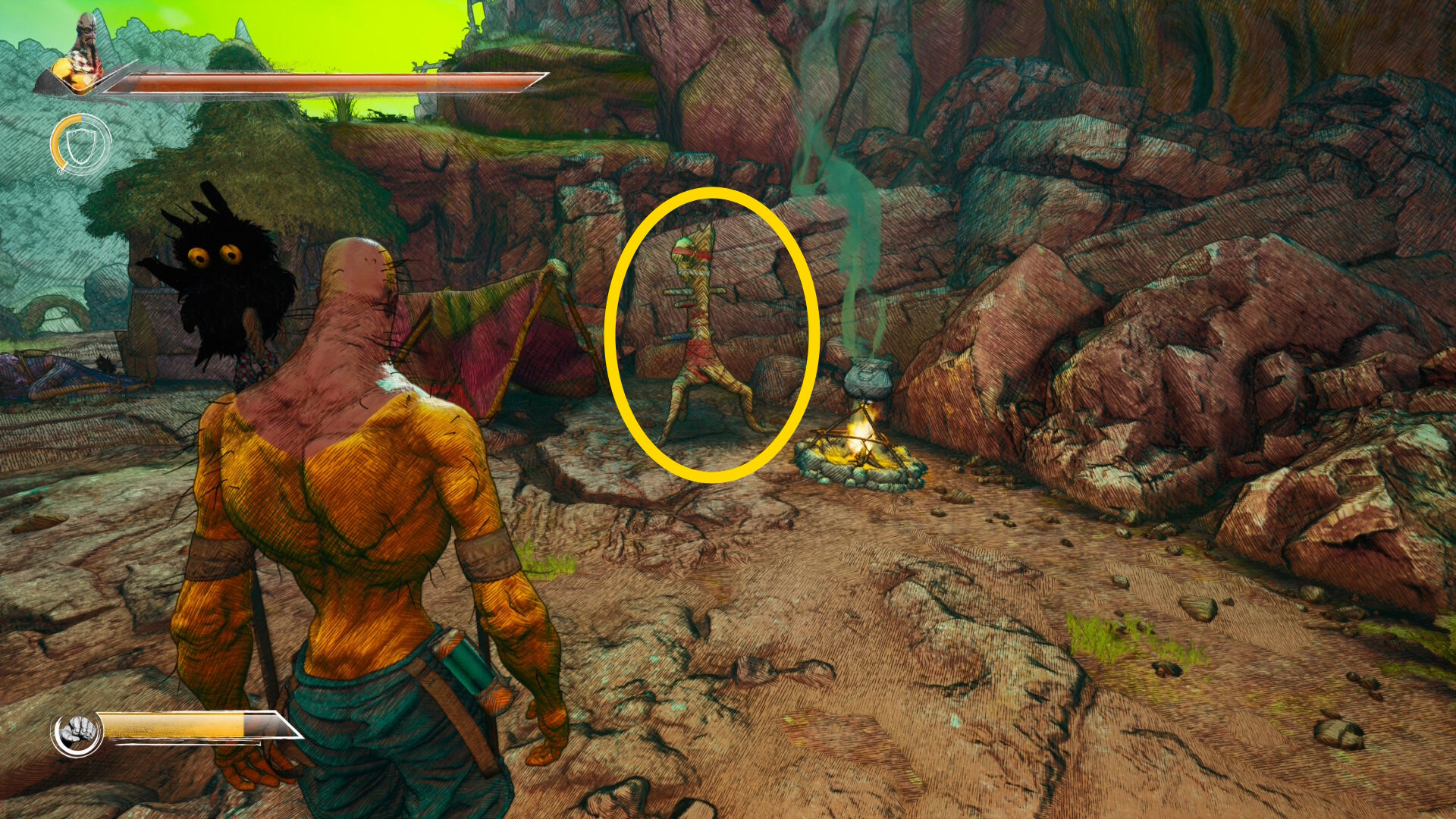 - 下におり、設置したばかりの第2キャンプで HP 回復&セーブ(テントは焚き火の右側にある)