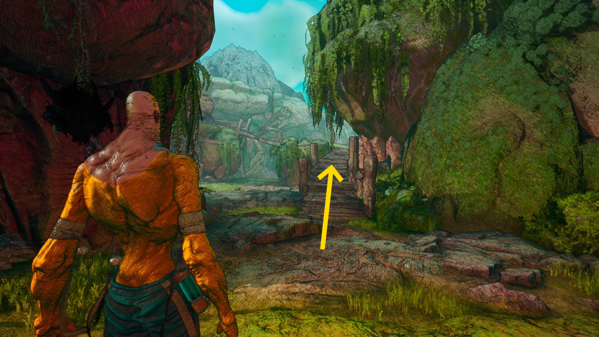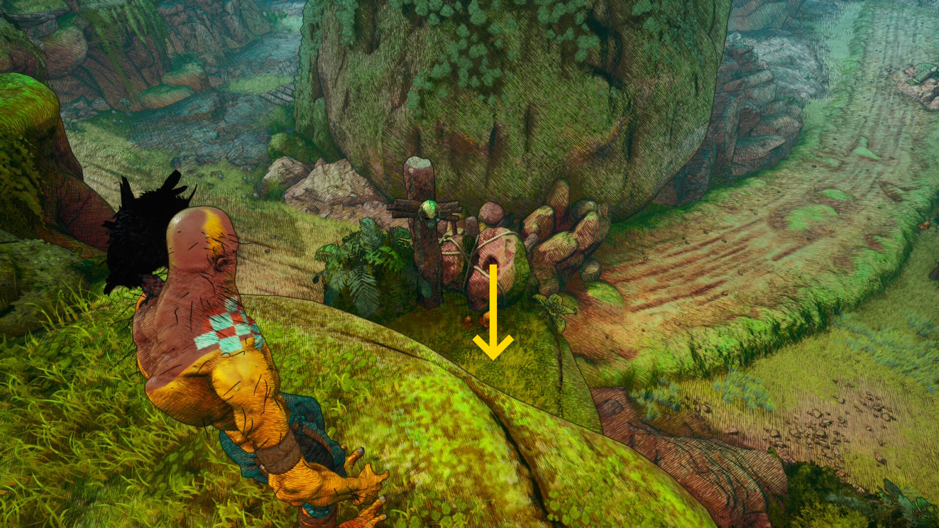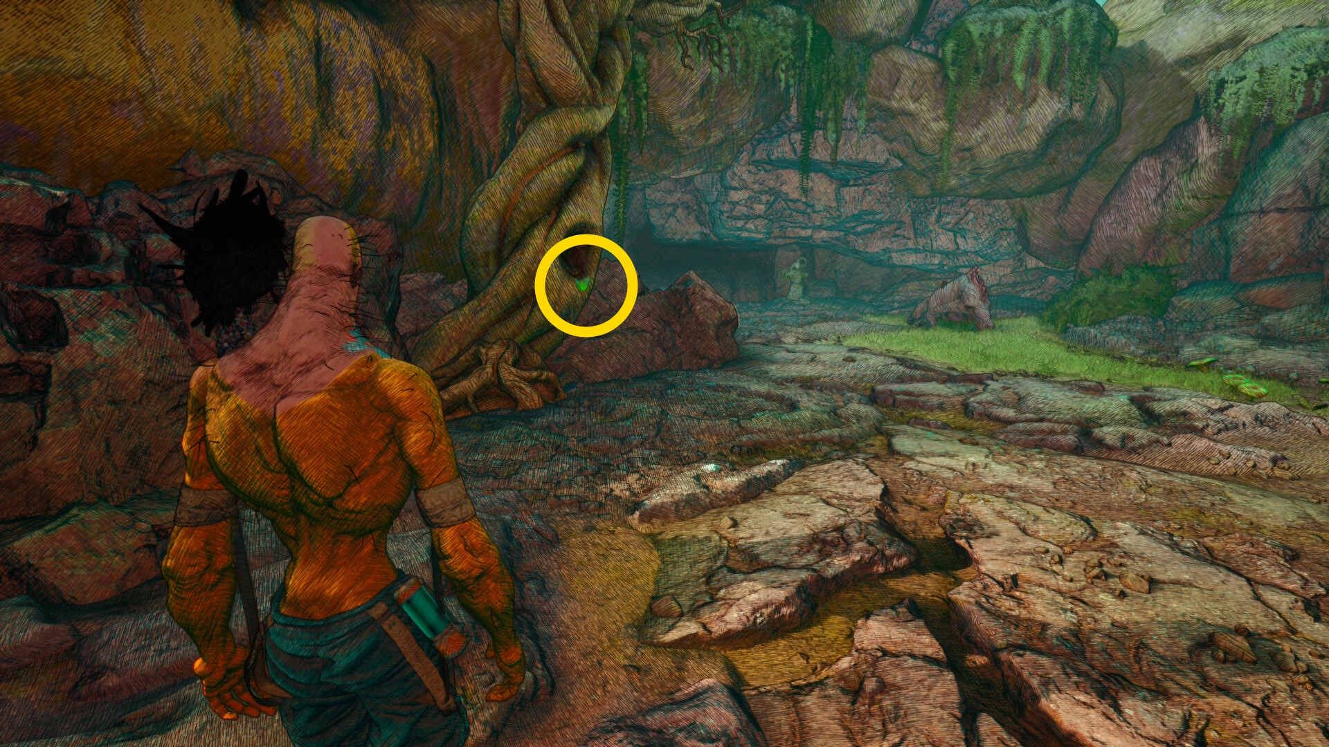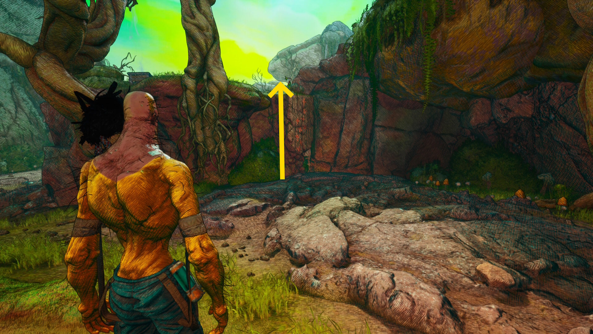 - 洞窟の奥に進み、壁を登って外に出る
