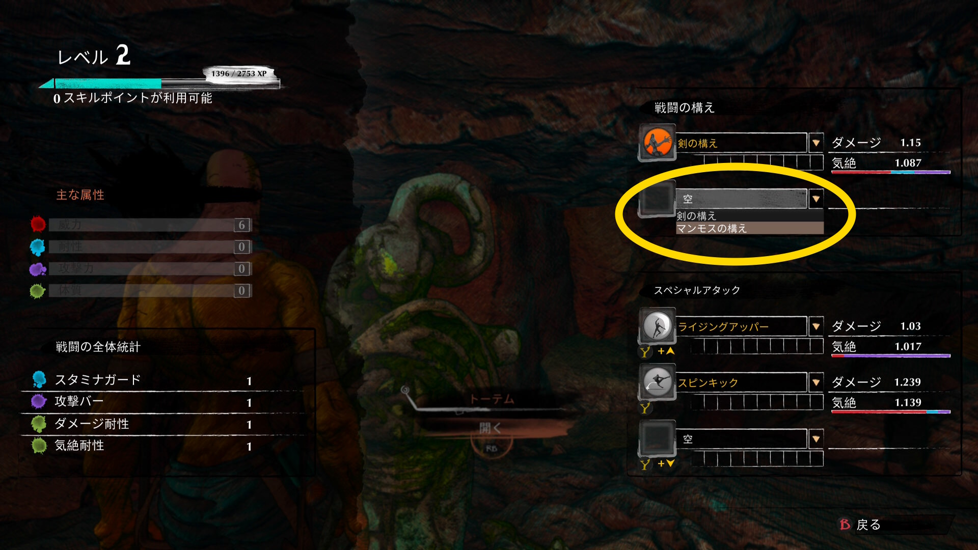- 敵に勝つと マンモスの構え を得る(動きは遅いが与ダメージは大きい。が、現状はこれがメインの構えになるほどではない)
