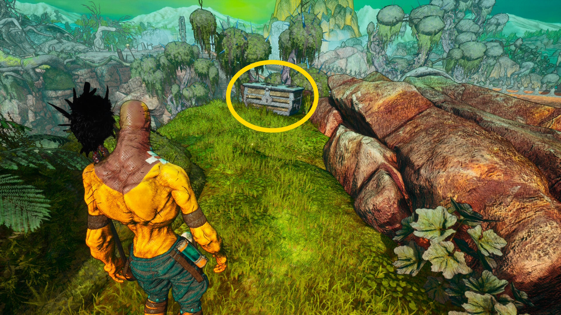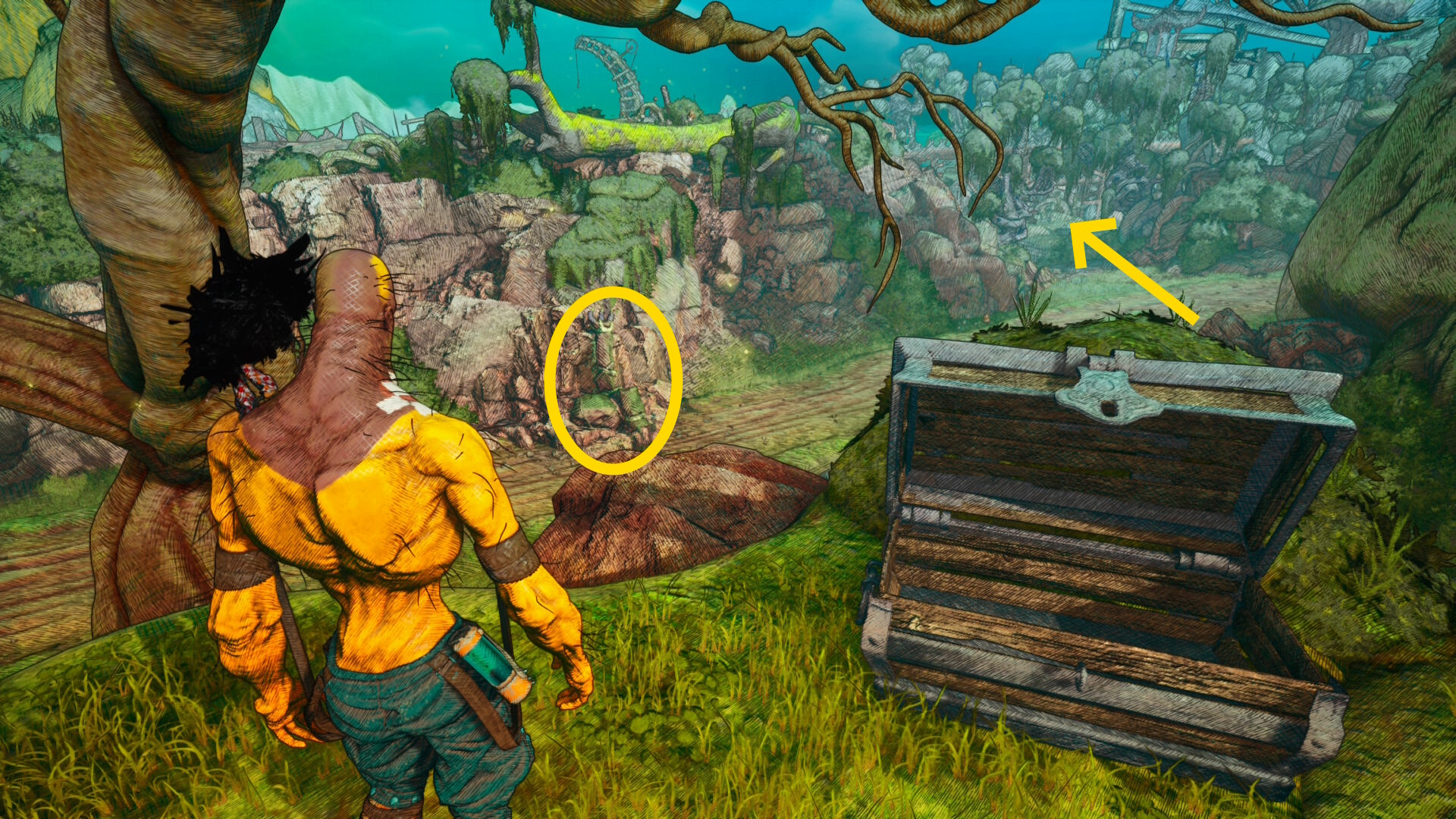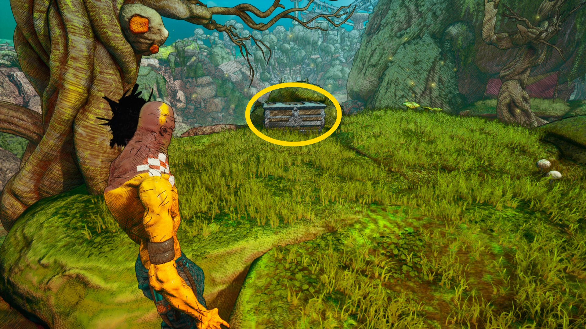 - 開けた箱のところから、左眼下に見える木のところに革の小袋がある