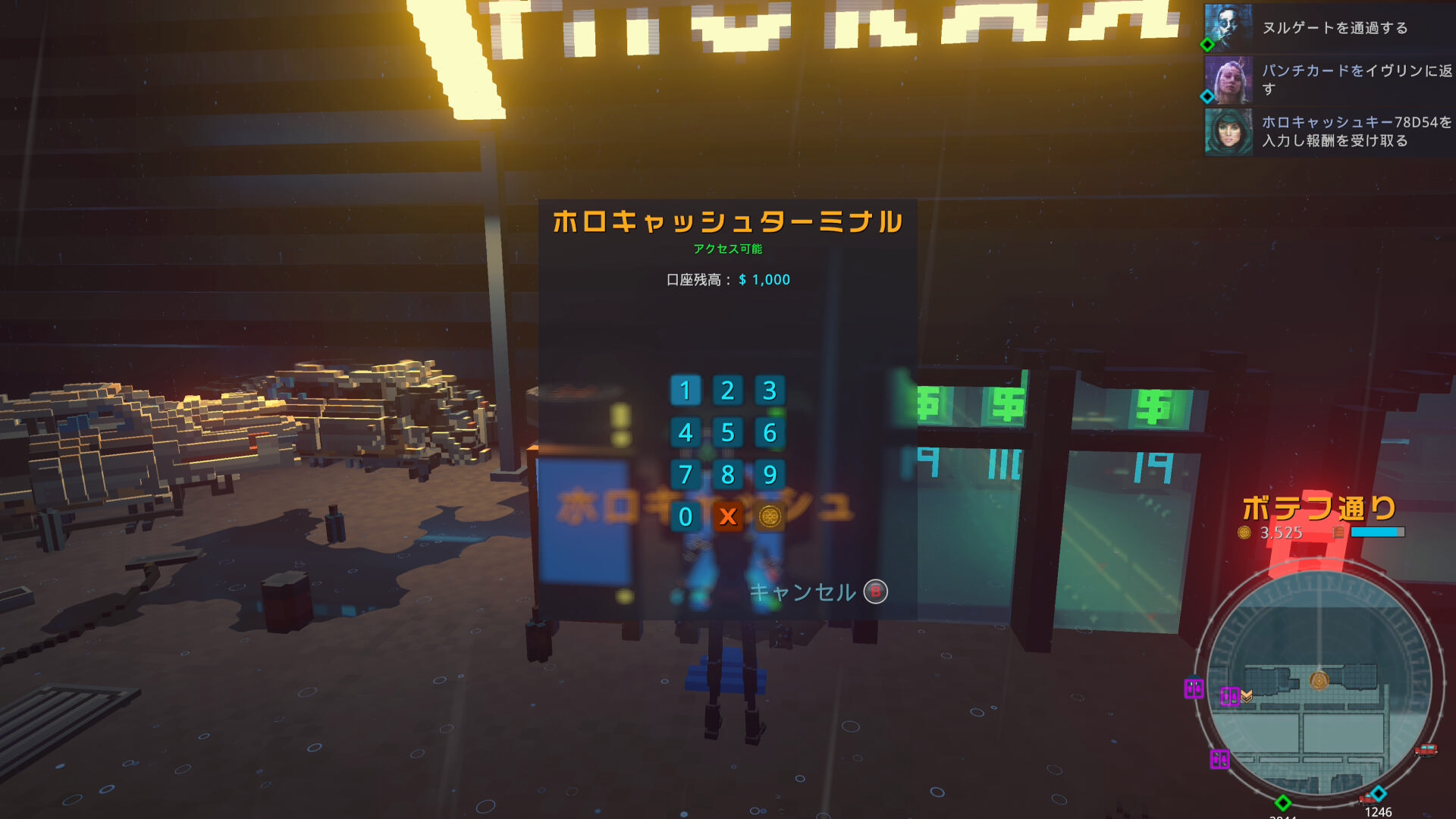 - ボテフ通りの上層にあるホロキャッシュターミナルで 78D54 を入力して、1,000$ 引き出す