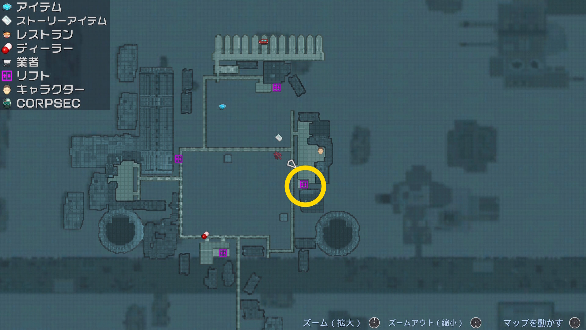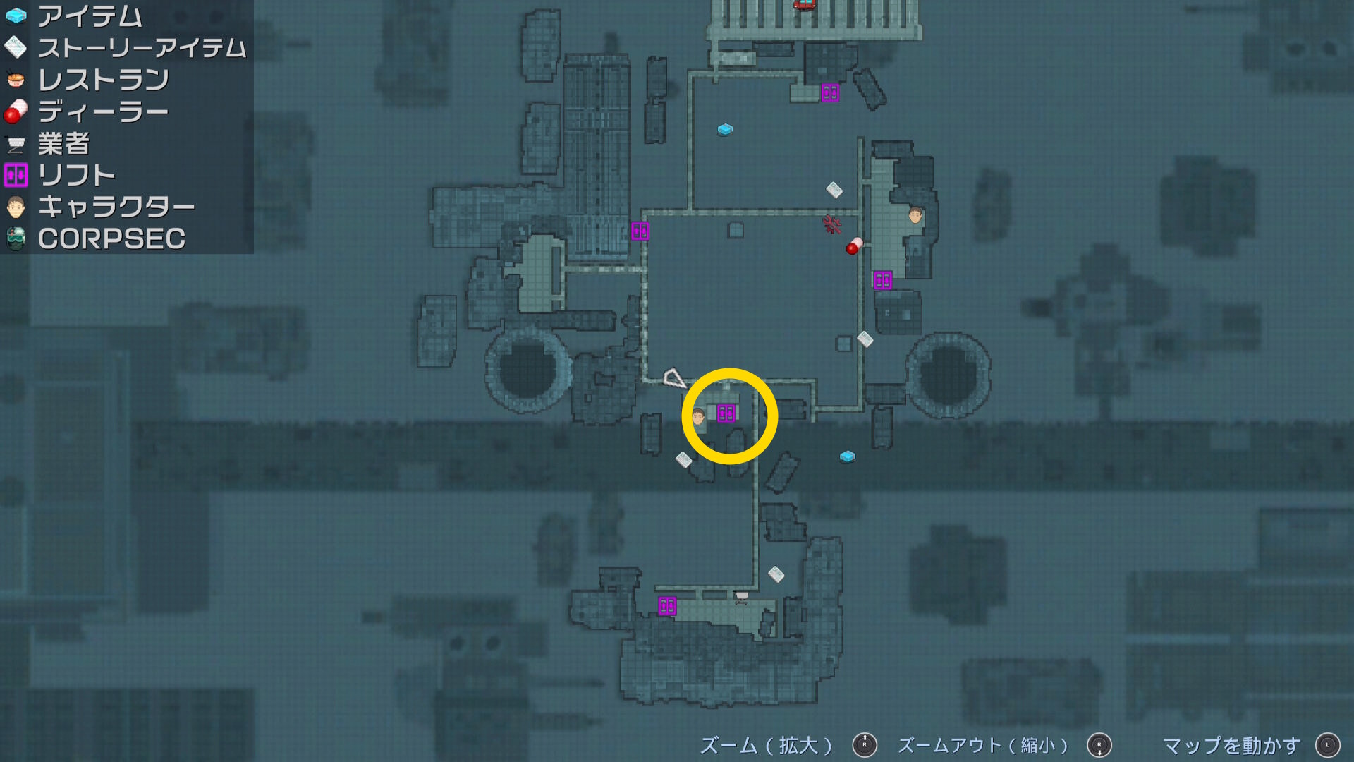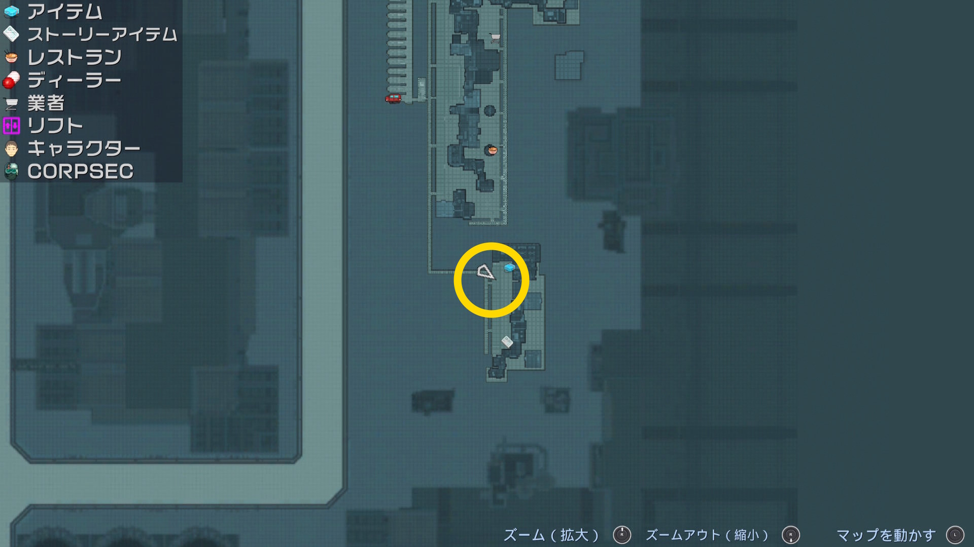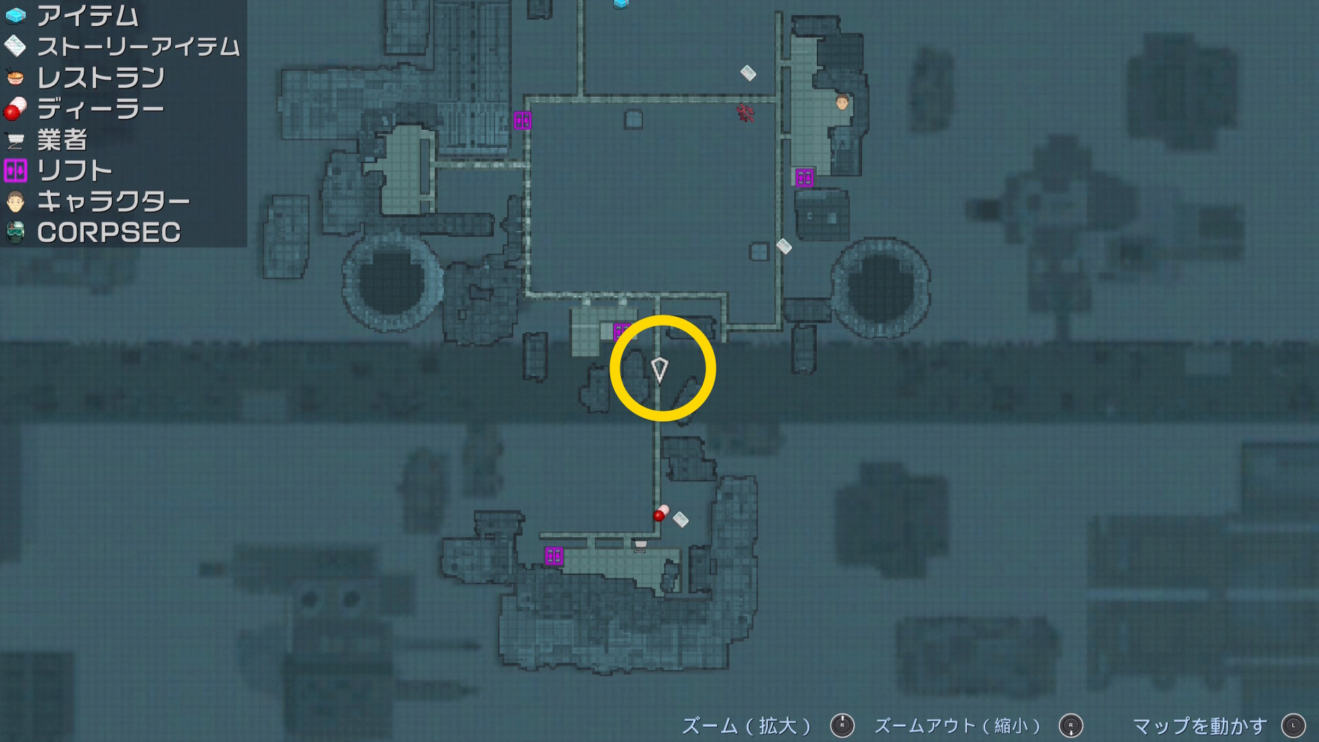 - 最下層におりると北にセキュリティゲートがあり、CORPSEC のチラシがないと通過できない(その奥にあるパンチカードも回収できない)