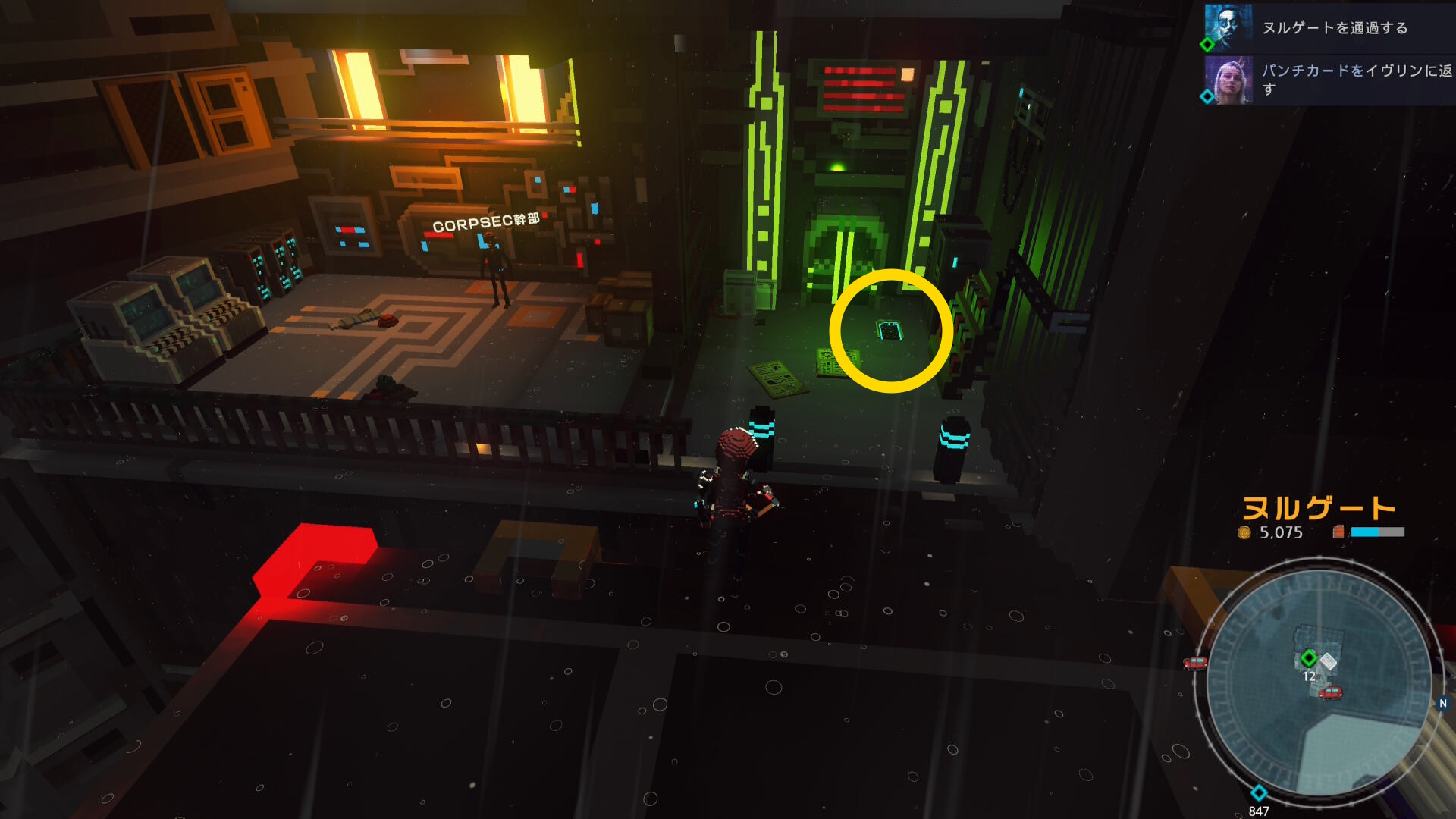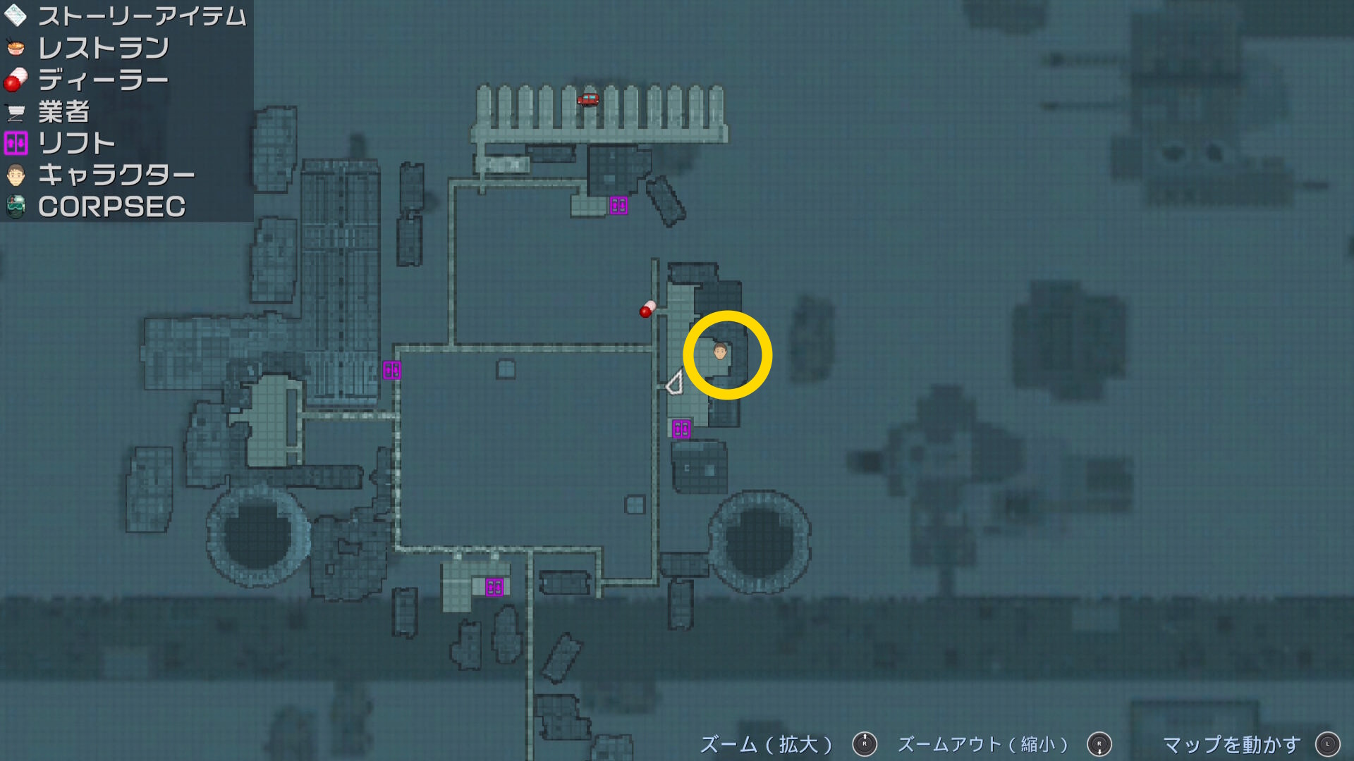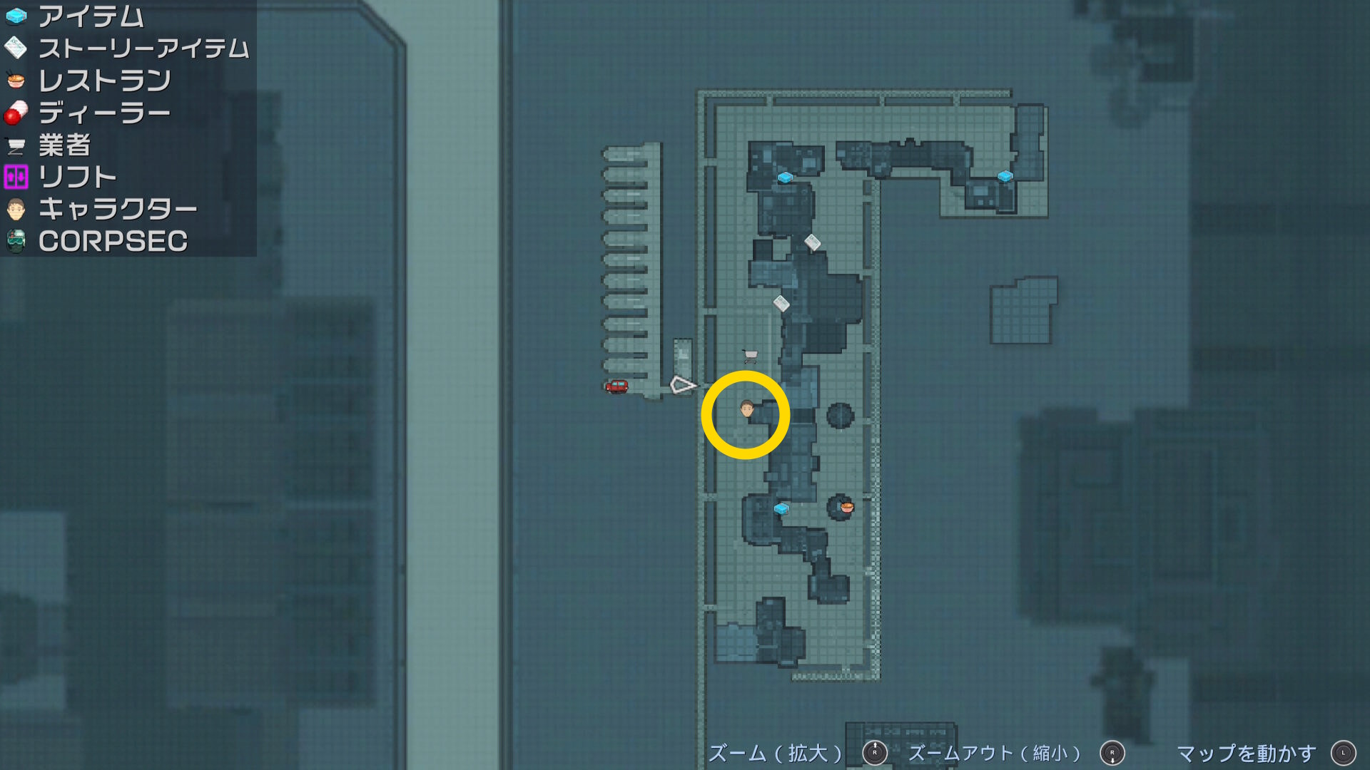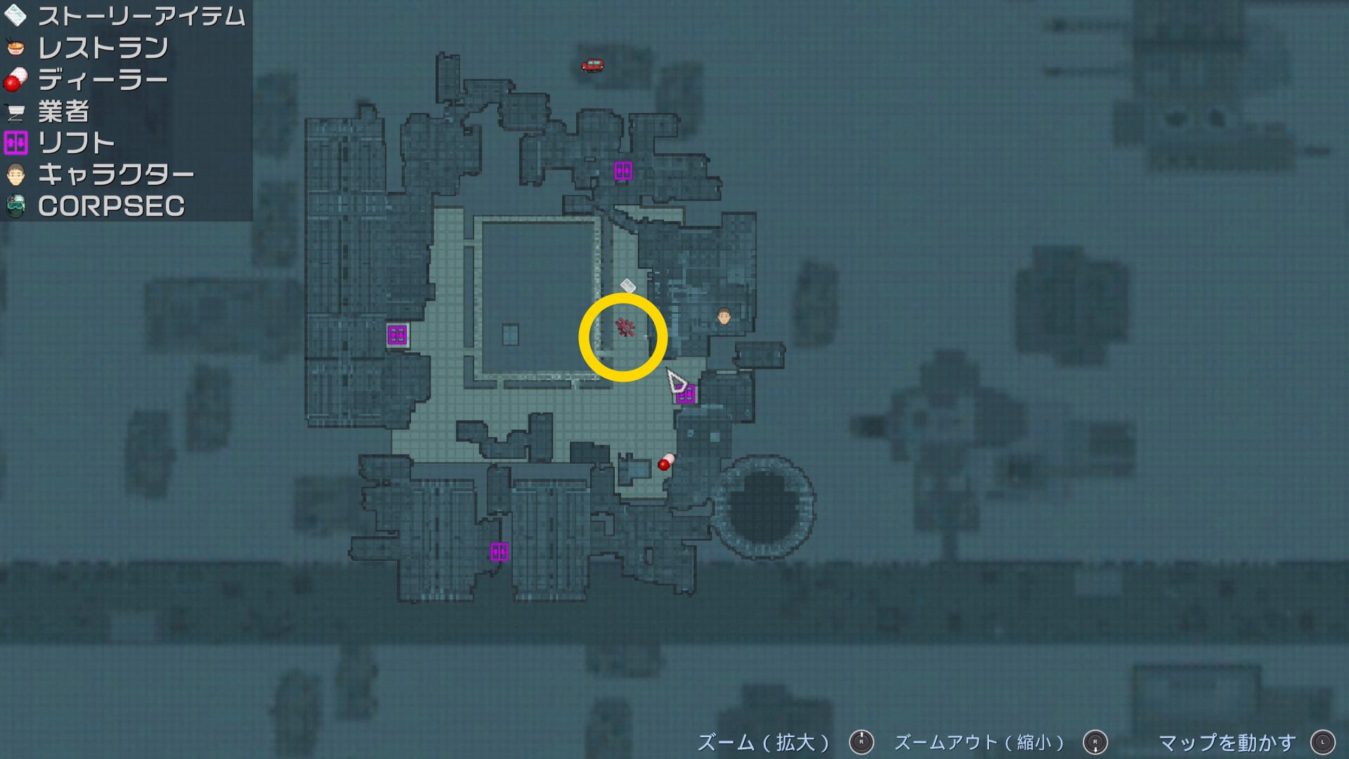 - 最下層におりると北にセキュリティゲートがあり、CORPSEC のチラシがないと通過できない(その奥にあるパンチカードも回収できない)