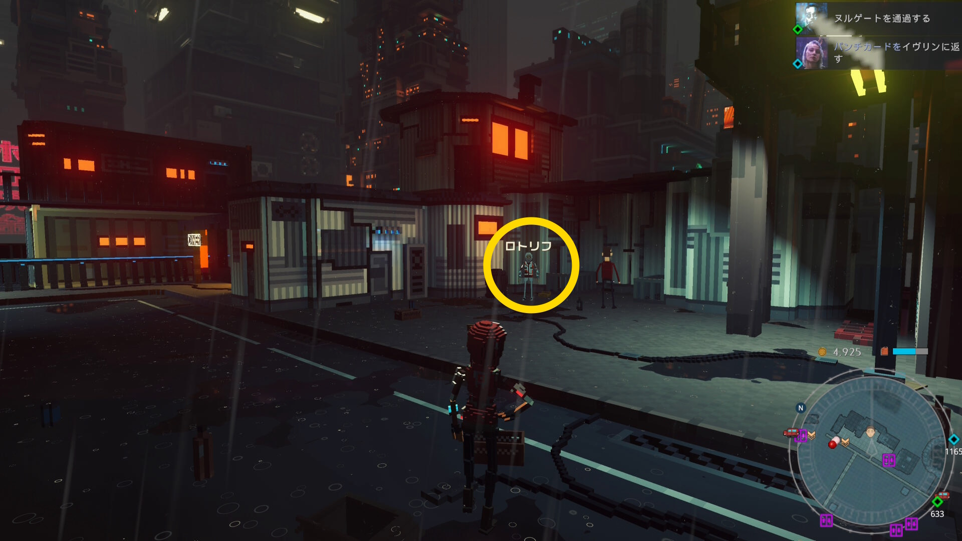 - セキュリティゲートを通過してパンチカードを回収後、中層にもどり「ロトリフ」と会話(話しかけたら配達することになるので注意)