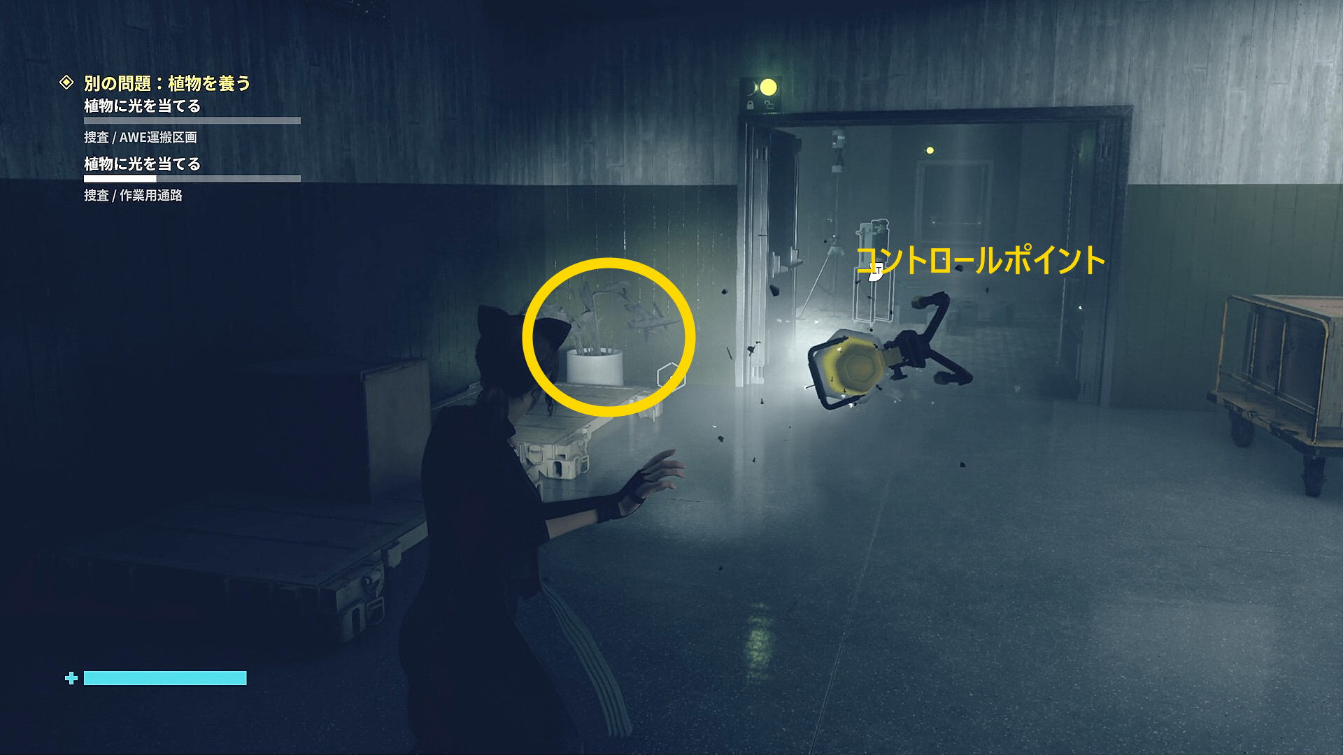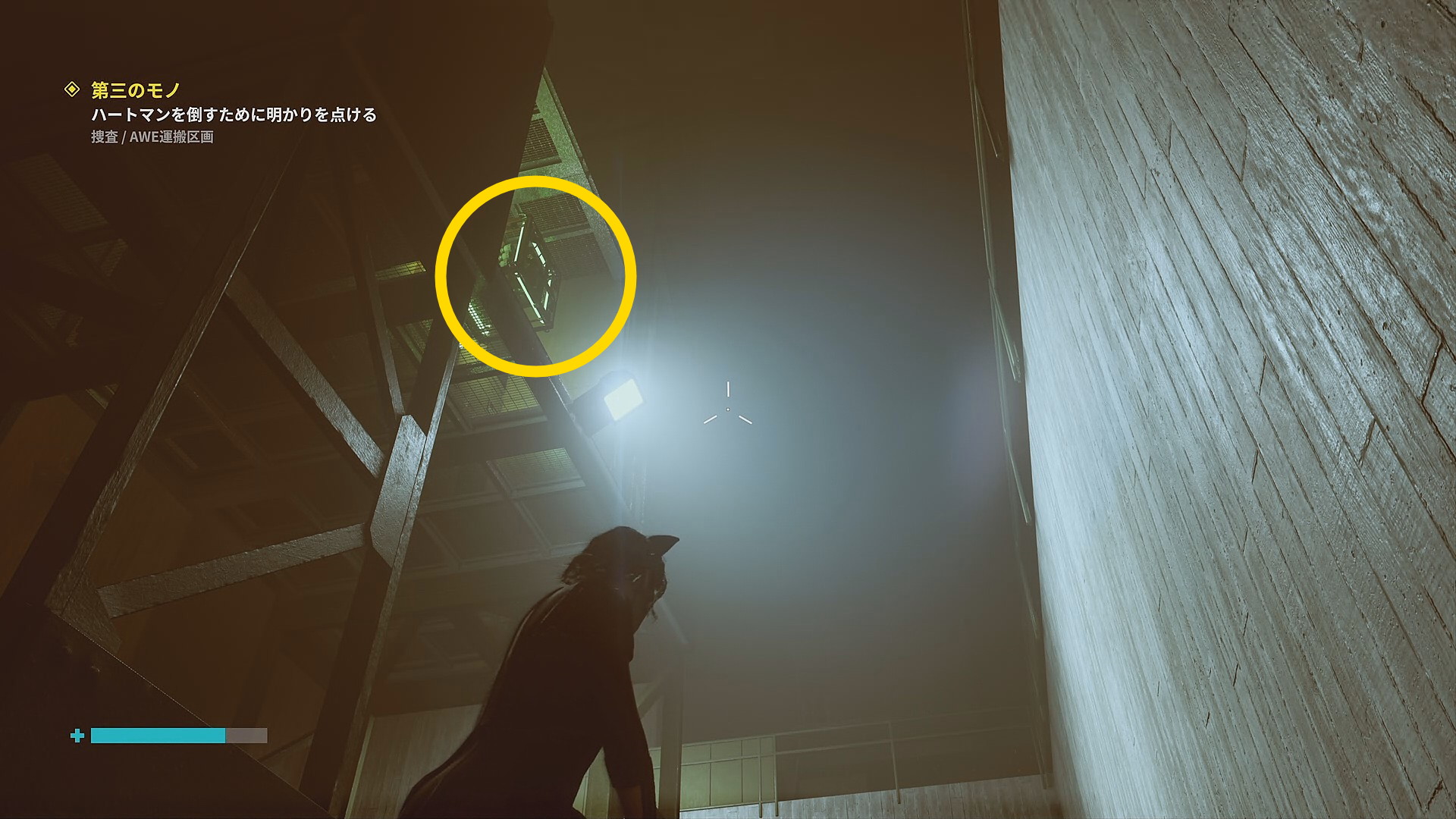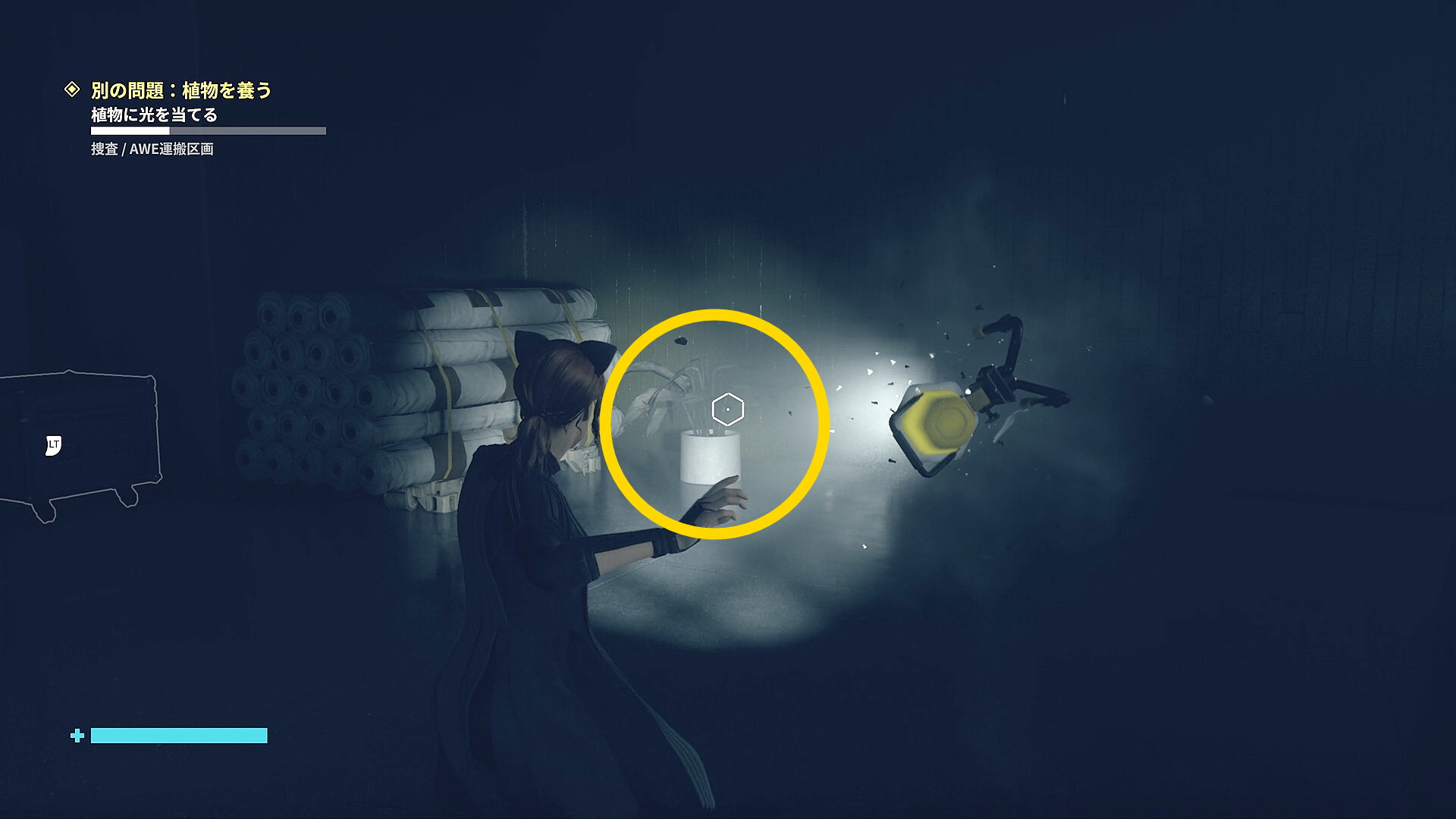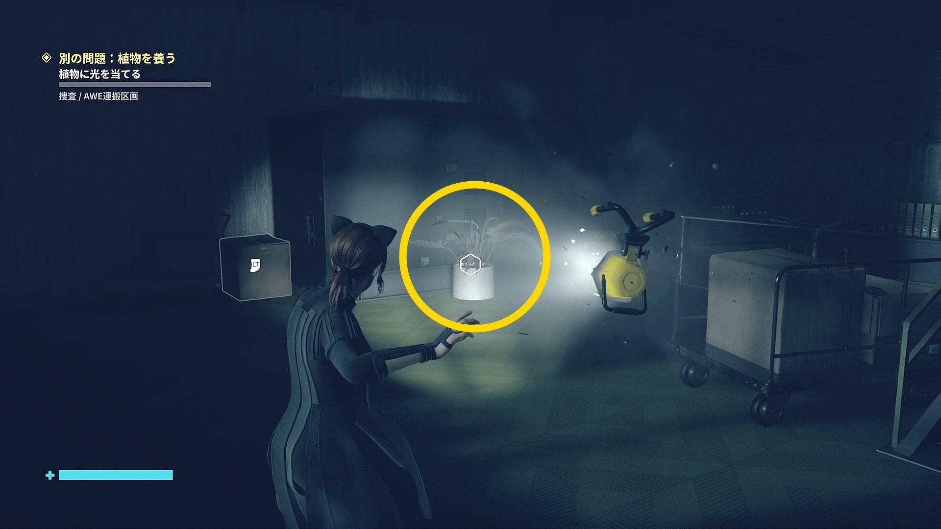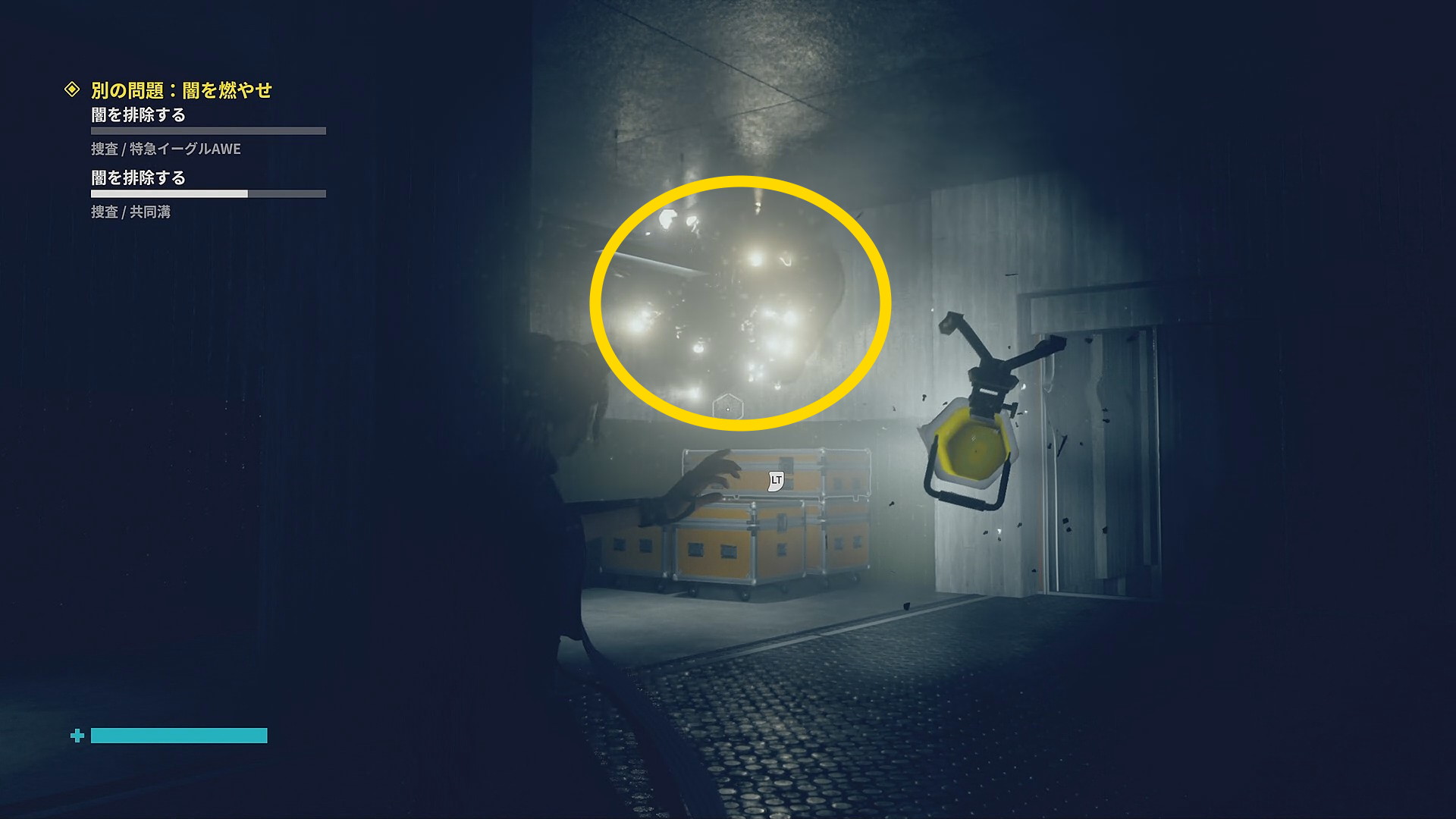 • 画面左下には「強力な光源を闇に向けて破壊しましょう」と指示があるので、左を見ると小型投光器があるので RB で引き寄せて光を闇に向けて照射 (左の小部屋にも小型投光器あり)