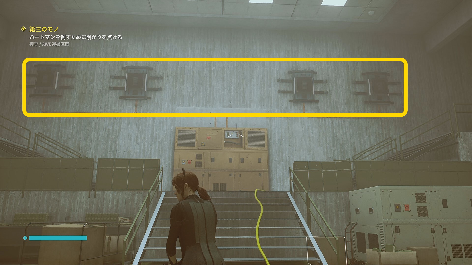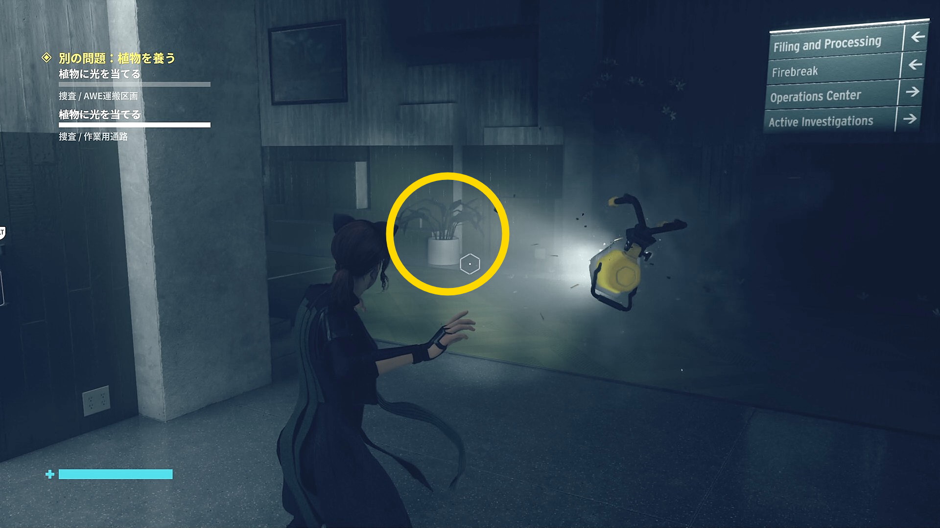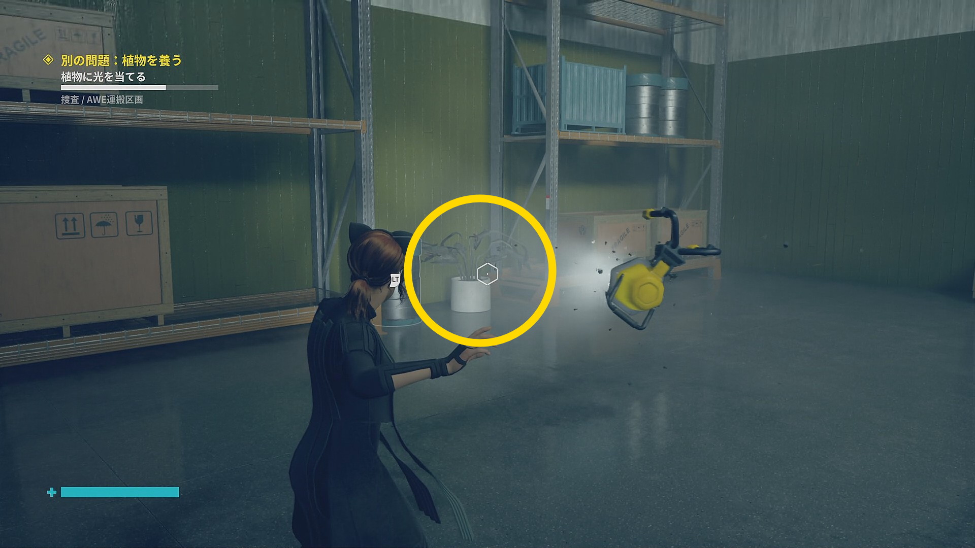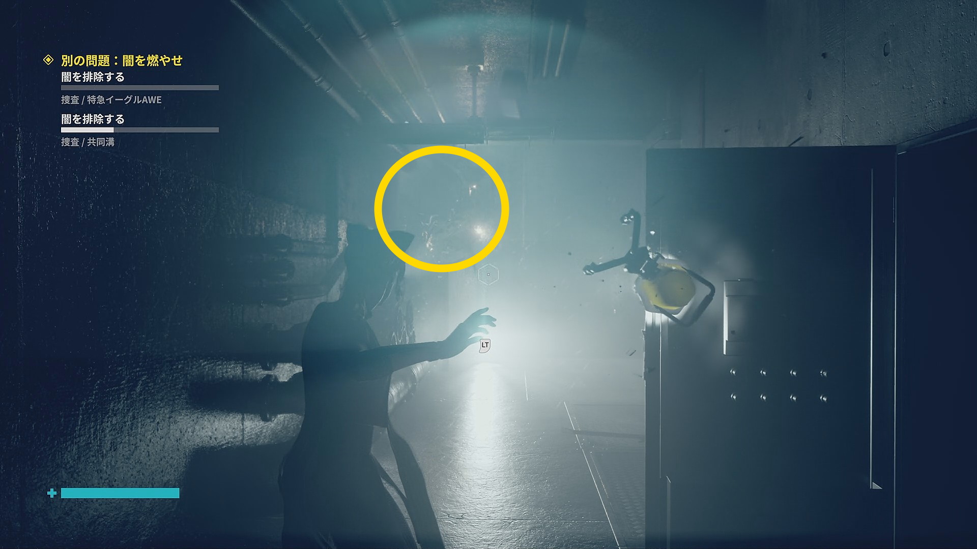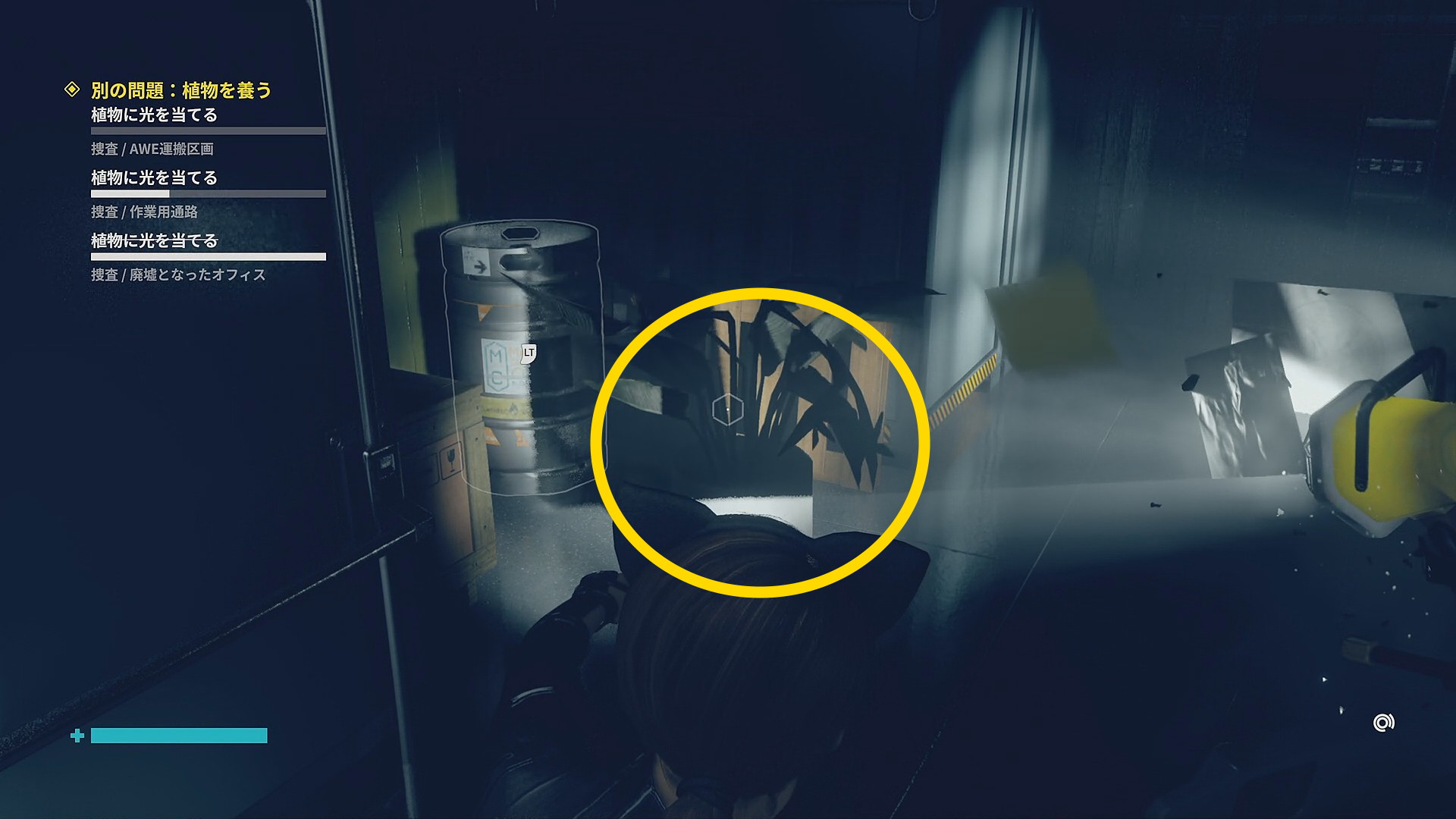 • 画面左下には「強力な光源を闇に向けて破壊しましょう」と指示があるので、左を見ると小型投光器があるので RB で引き寄せて光を闇に向けて照射 (左の小部屋にも小型投光器あり)