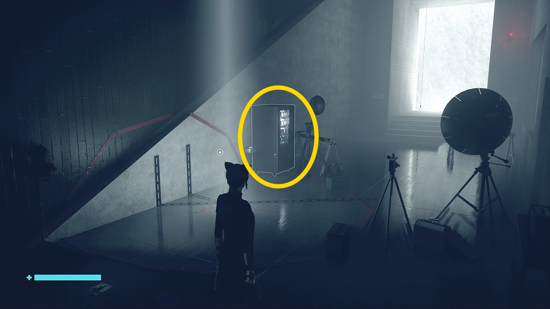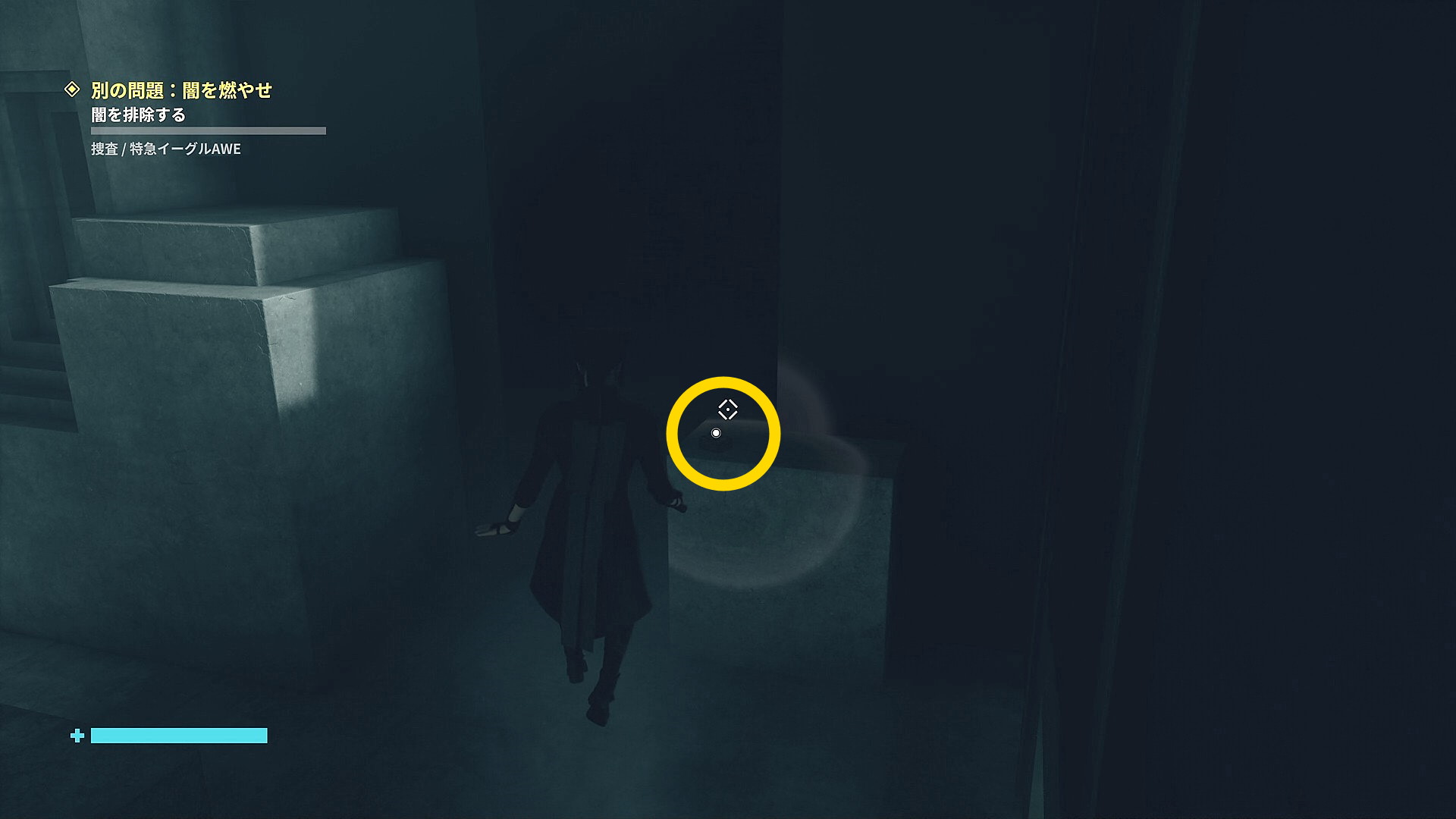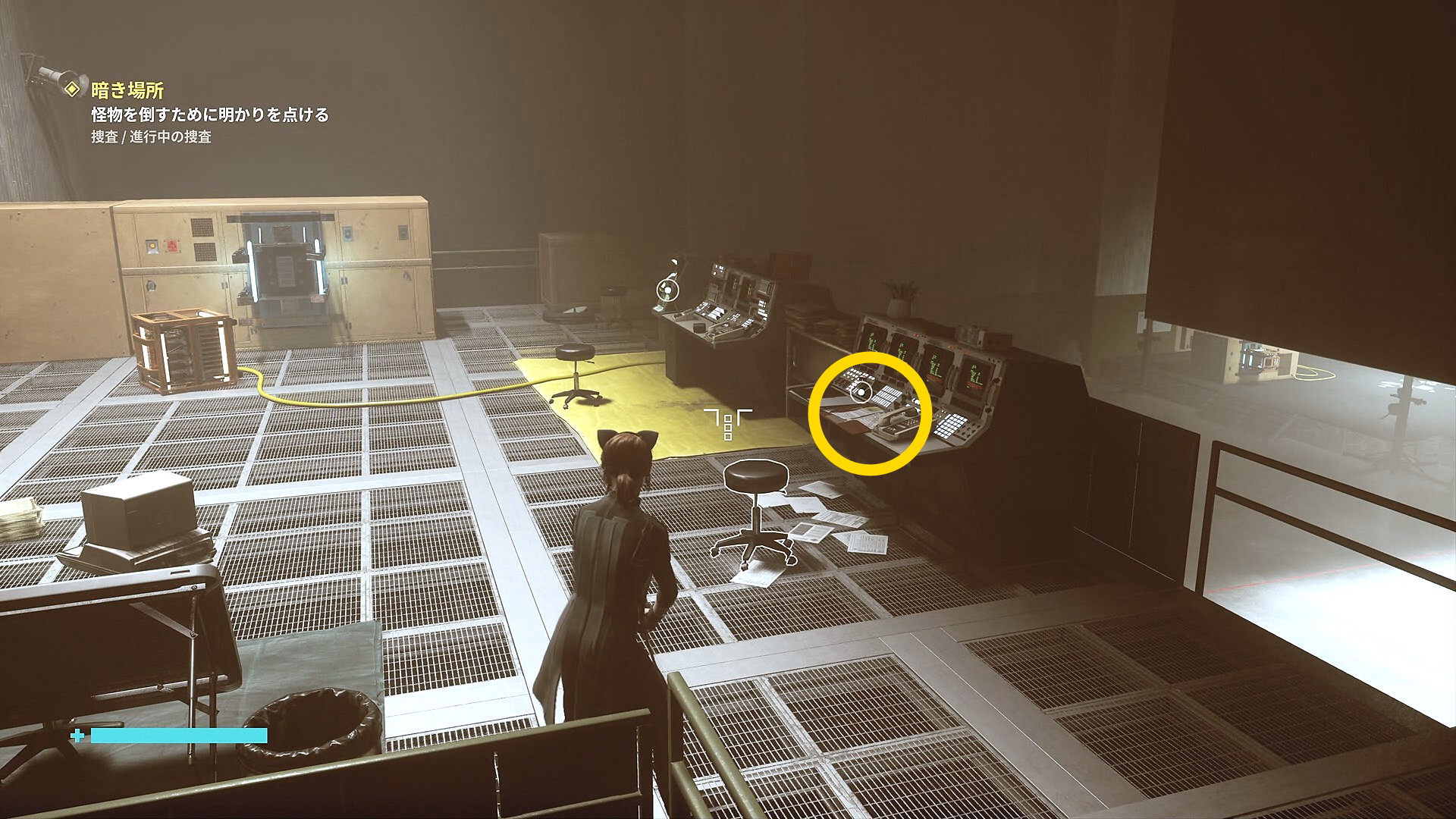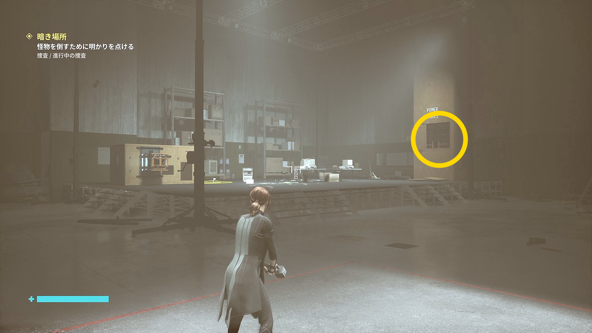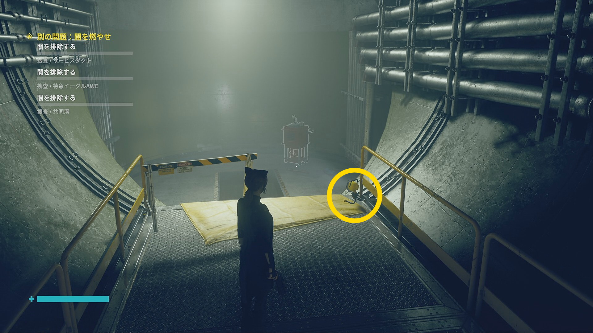 • 画面左下には「強力な光源を闇に向けて破壊しましょう」と指示があるので、左を見ると小型投光器があるので RB で引き寄せて光を闇に向けて照射 (左の小部屋にも小型投光器あり)