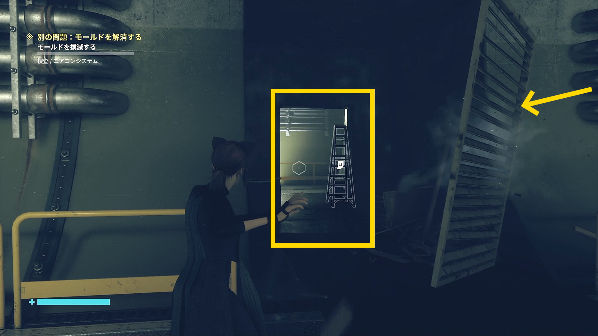 • 頭上の通路に浮揚したら、トラ模様のバリケードの先に入り (カビだらけだが大丈夫)、奥にボックスあり