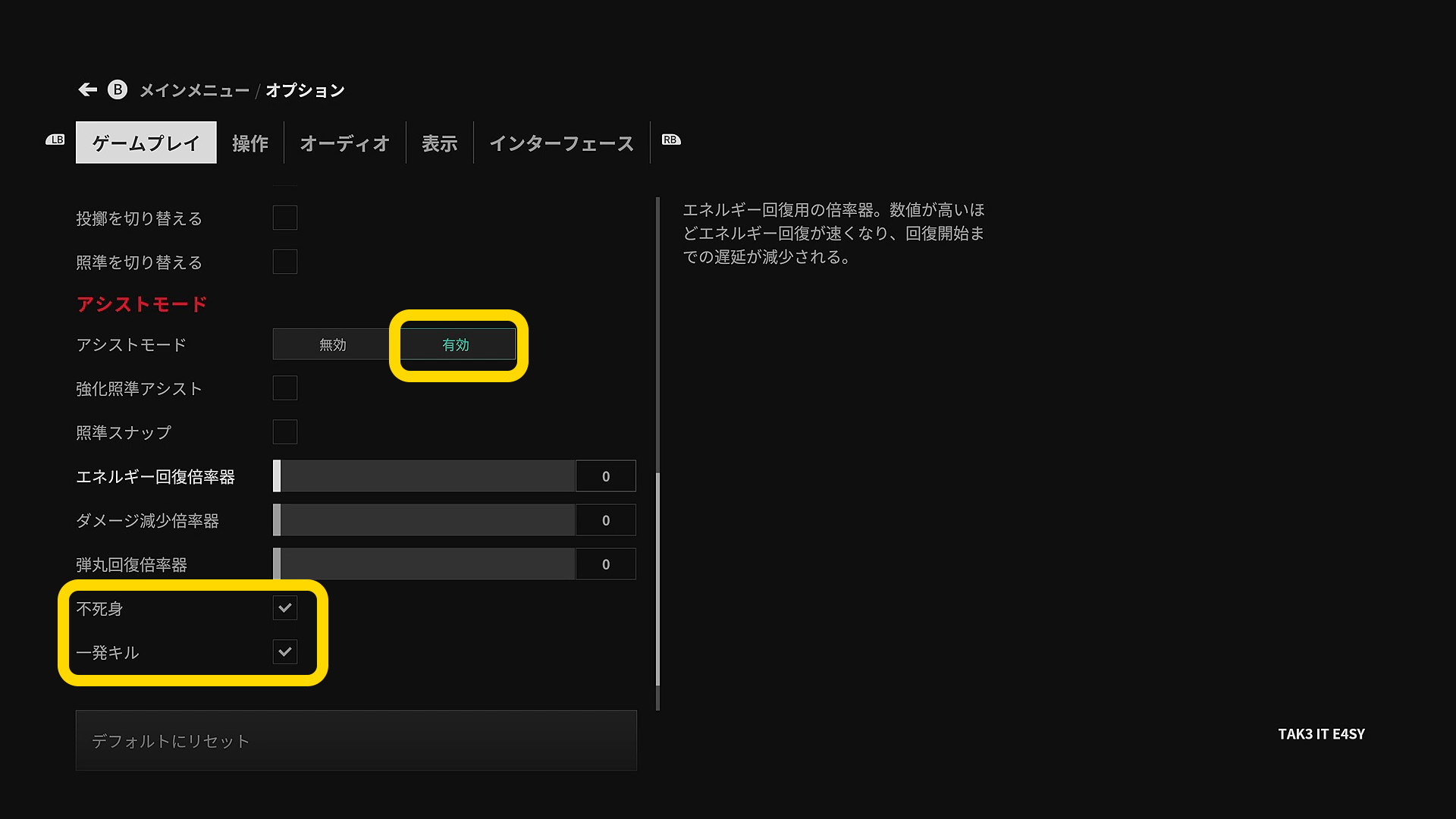 - オプション ⇒ 一番下に移動 ⇒ アシストモードを有効にする ⇒「不死身」と「一発キル」を ON