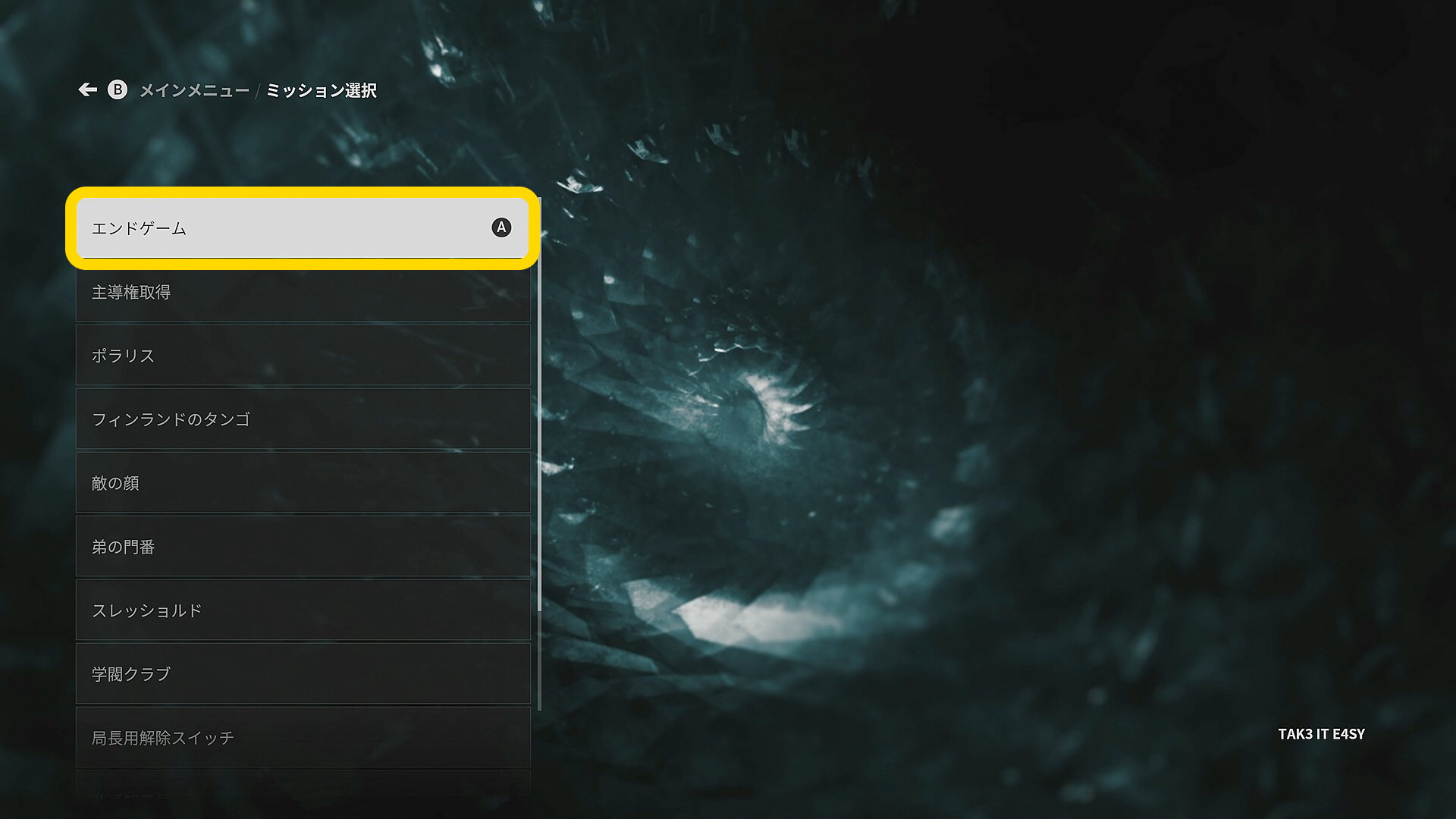- タイトルに戻り、ミッション選択 ⇒ エンドゲーム と進む