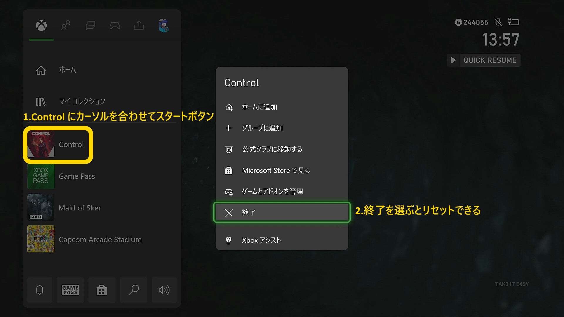 - ゲームを起動する (クイックレジュームなしで起動する)