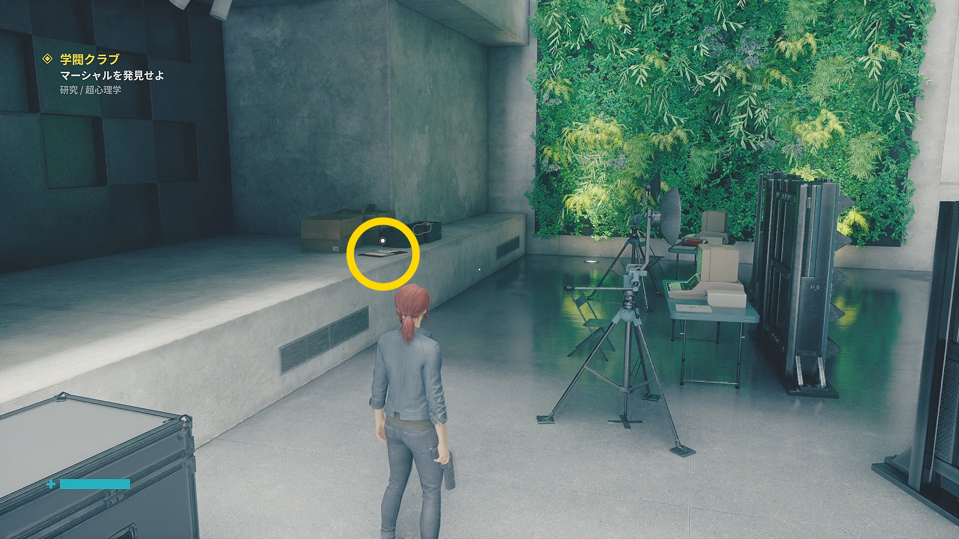 • 突き当り、左にライトがあたる壁パネルがある (右はコンテナに塞がれたドアがある。中に入り、右側にボックスあり)
