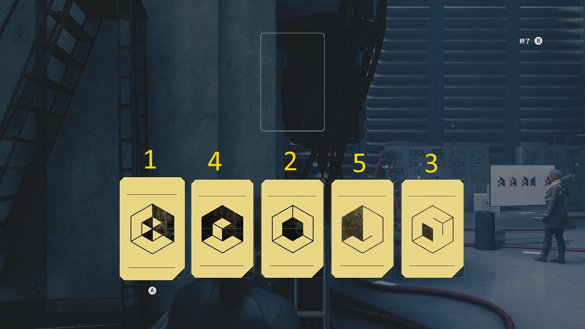 • 入って右側の端末を調べるとモニターにマークが映っており、十字パッドの上下左右で絵を合わせて解錠する