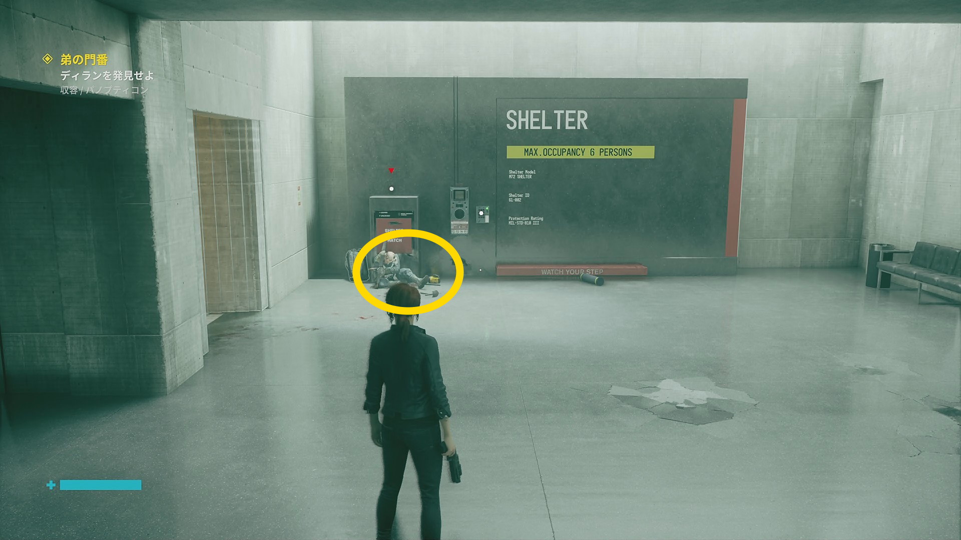 - シェルターを出たら左に見えるドアを開けて進む