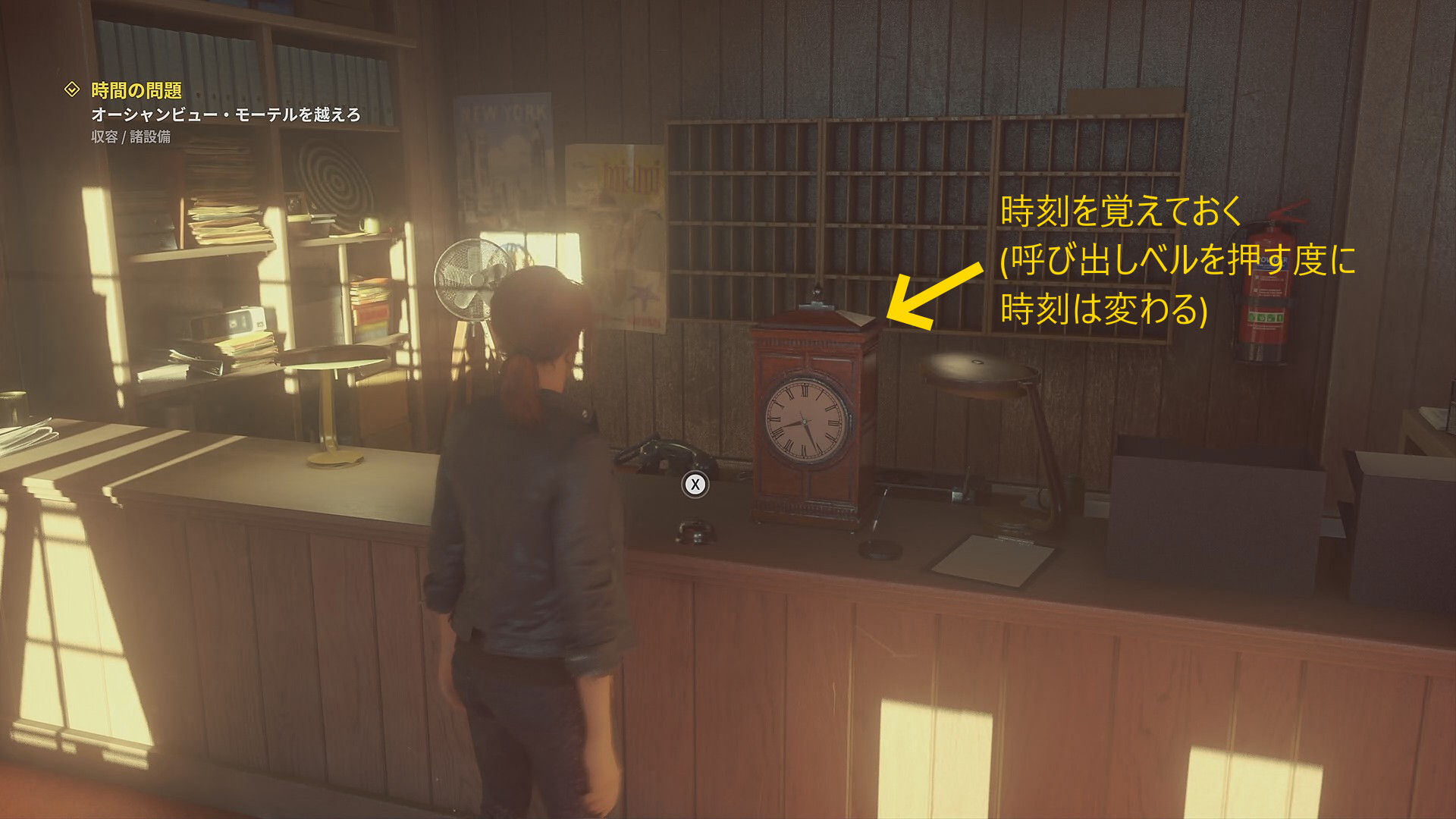 - いつものごとく受付カウンターの呼び出しベルを押すが、今回はその傍らにある置き時計の時刻を覚えておく必要がある