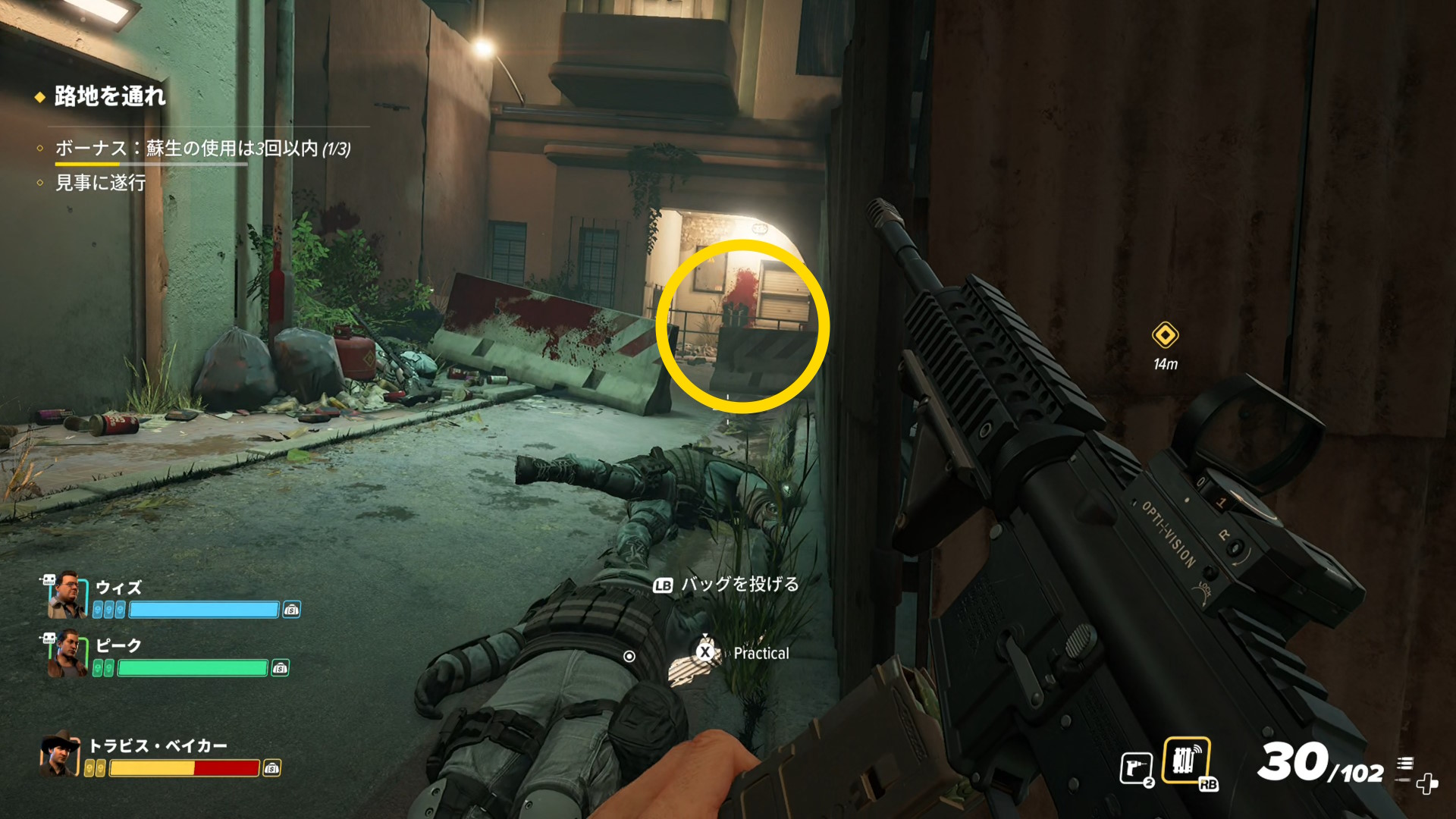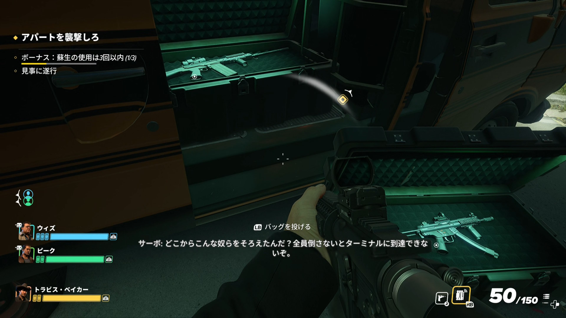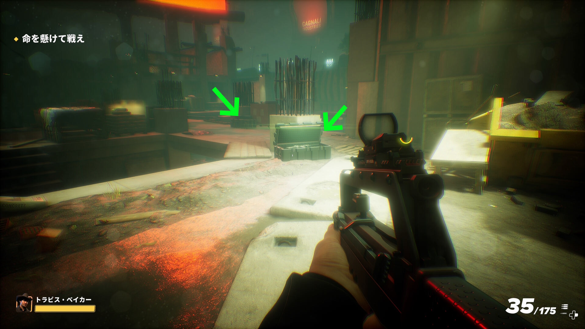 - 初期武器でも良いが、少し進むと武器ボックスが置かれてあり、ランダムで様々な銃器がセットされる(下画像の場所だけではなく、エリア内にいくつも配置されている)