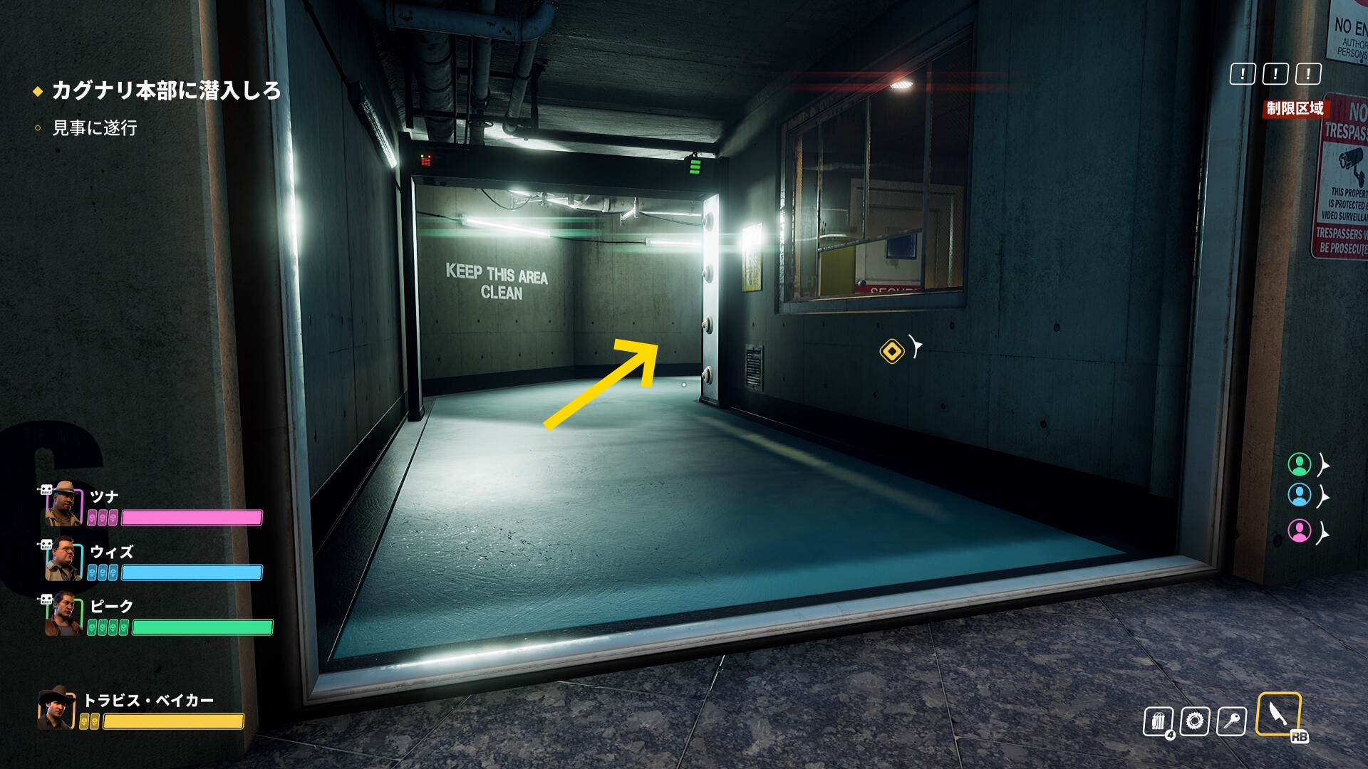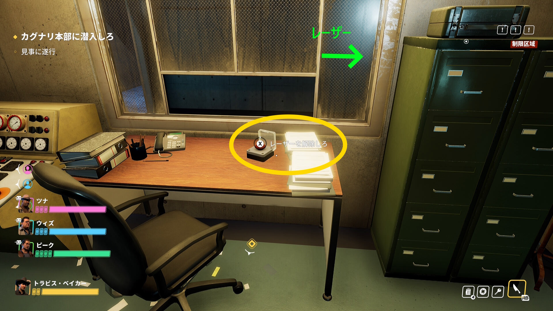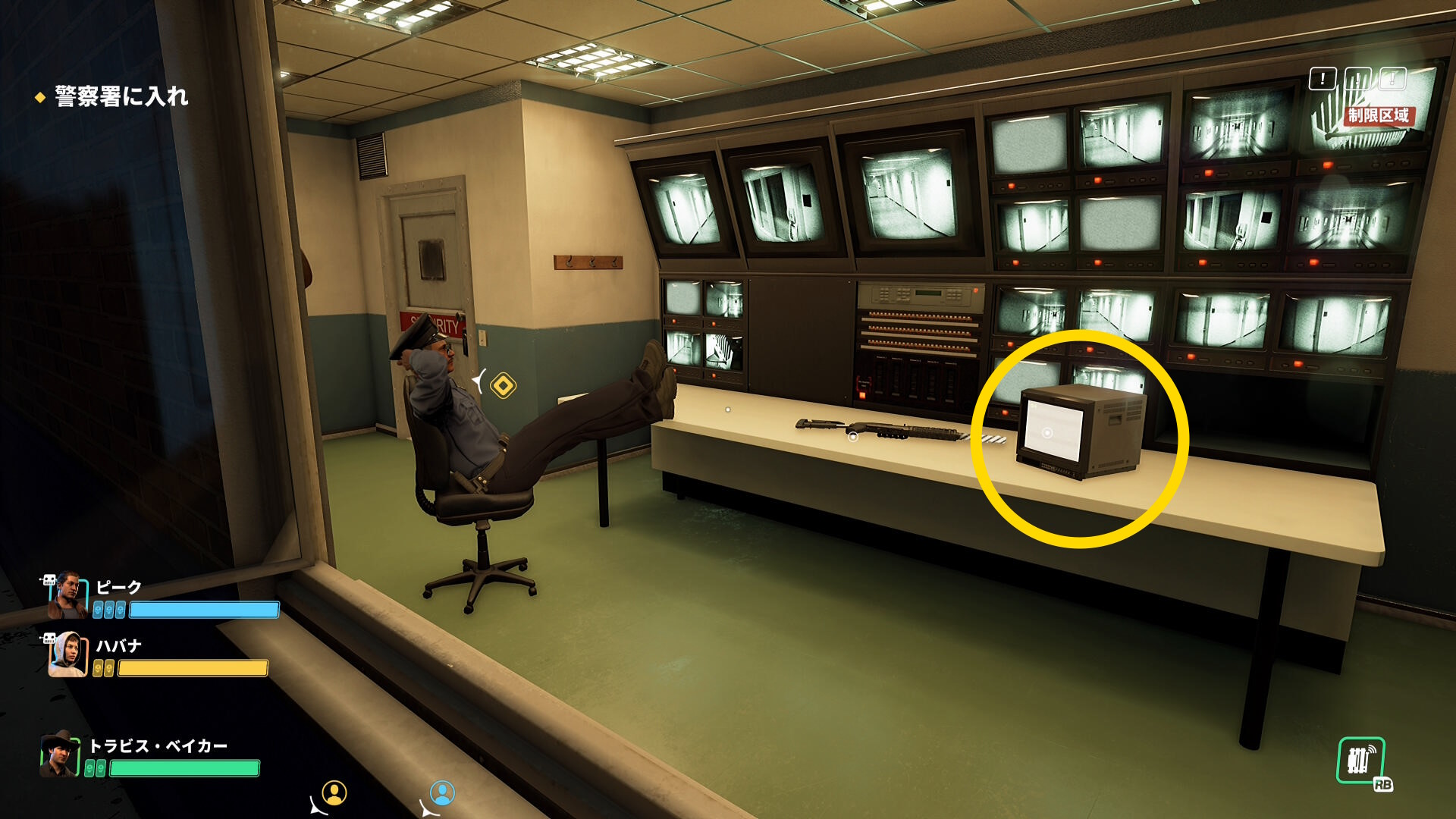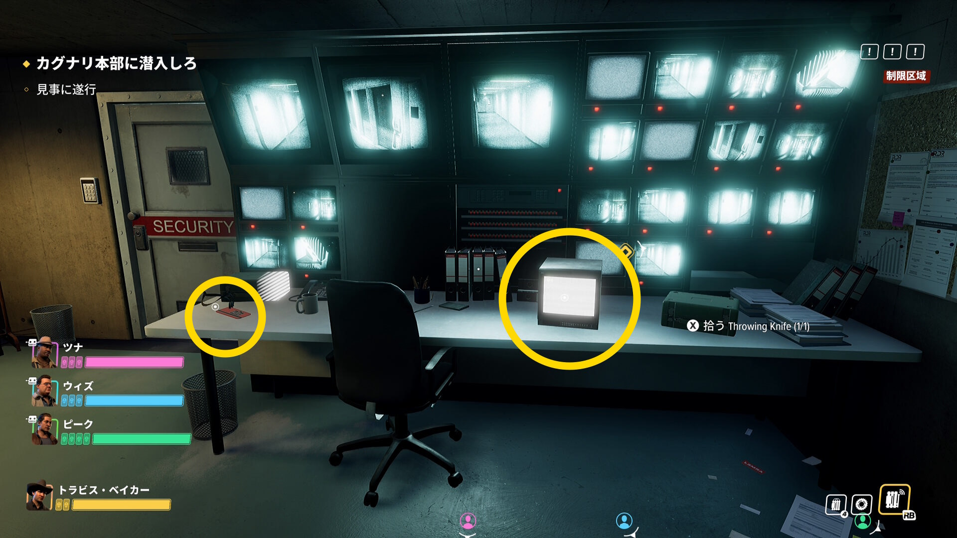 - セキュリティールームに入ったら、正面のモニターにアクセスして監視カメラを OFF する