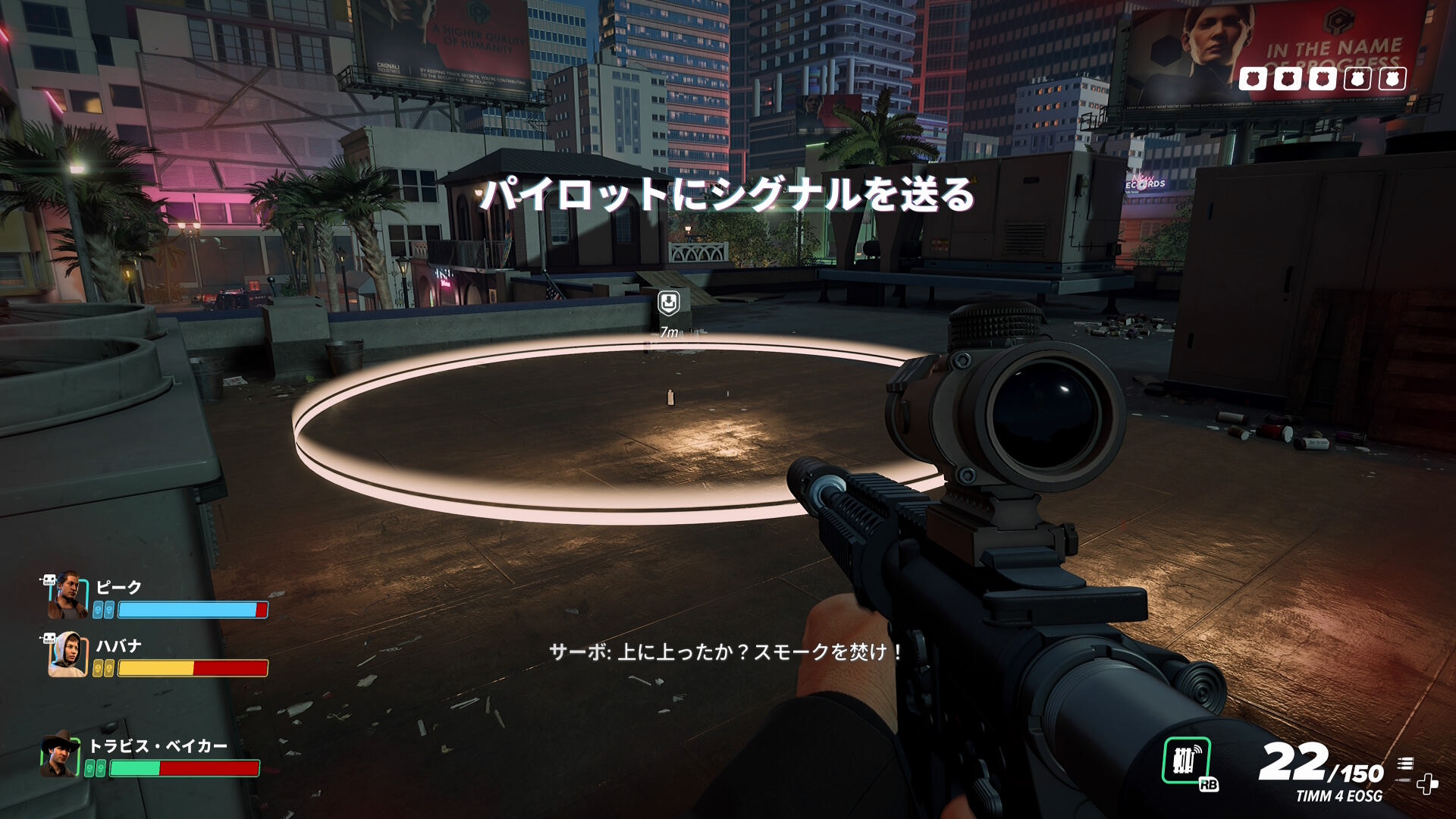 - 屋上に上がったら、正面奥のサークル内に置かれた発煙筒を焚く