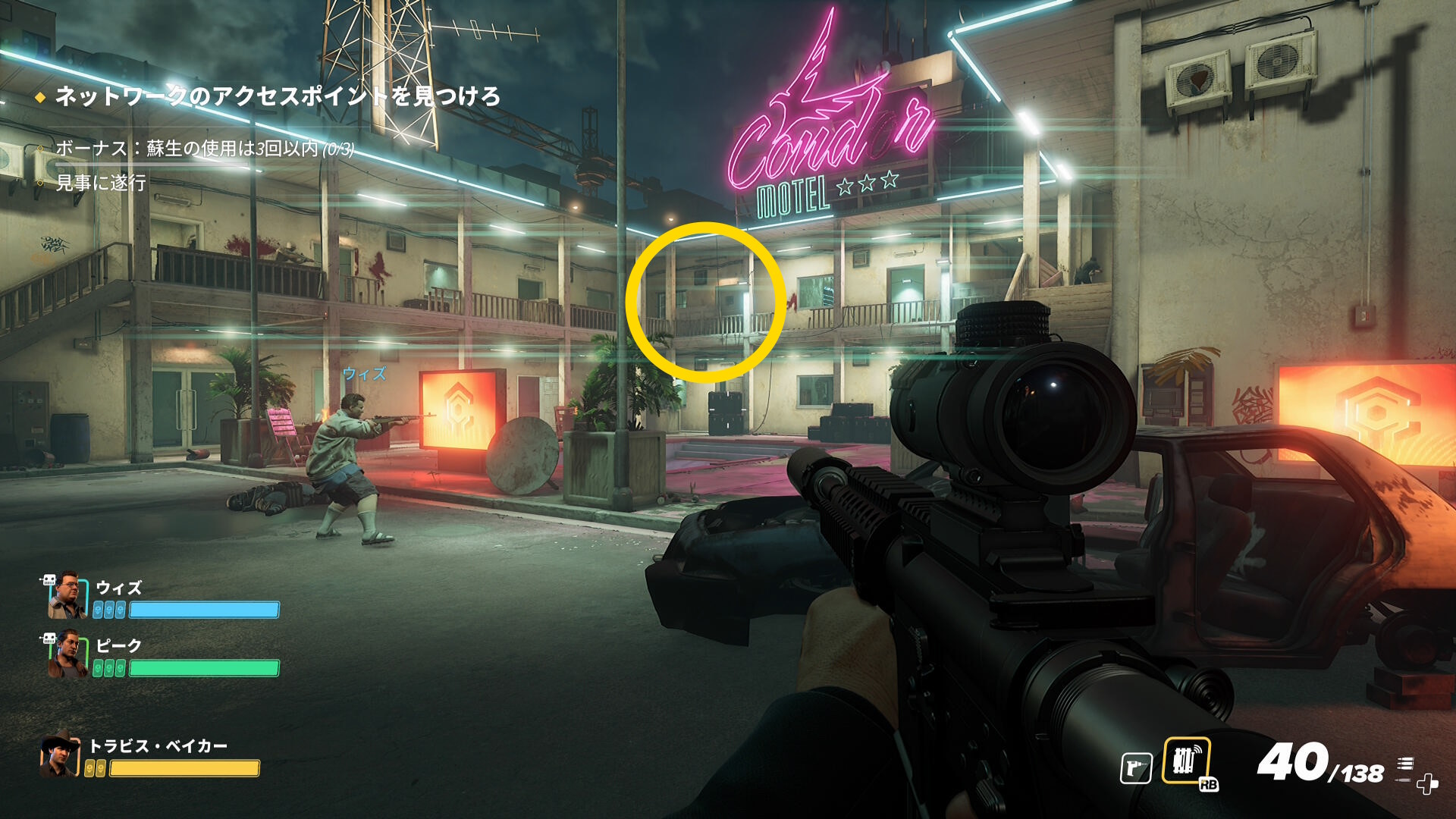 - なお、航空支援の爆撃があり、ダッシュでモーテルに近づくとモロに攻撃を受けて大ダメージを受けるので注意