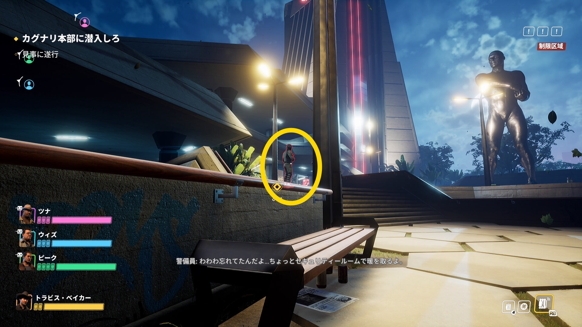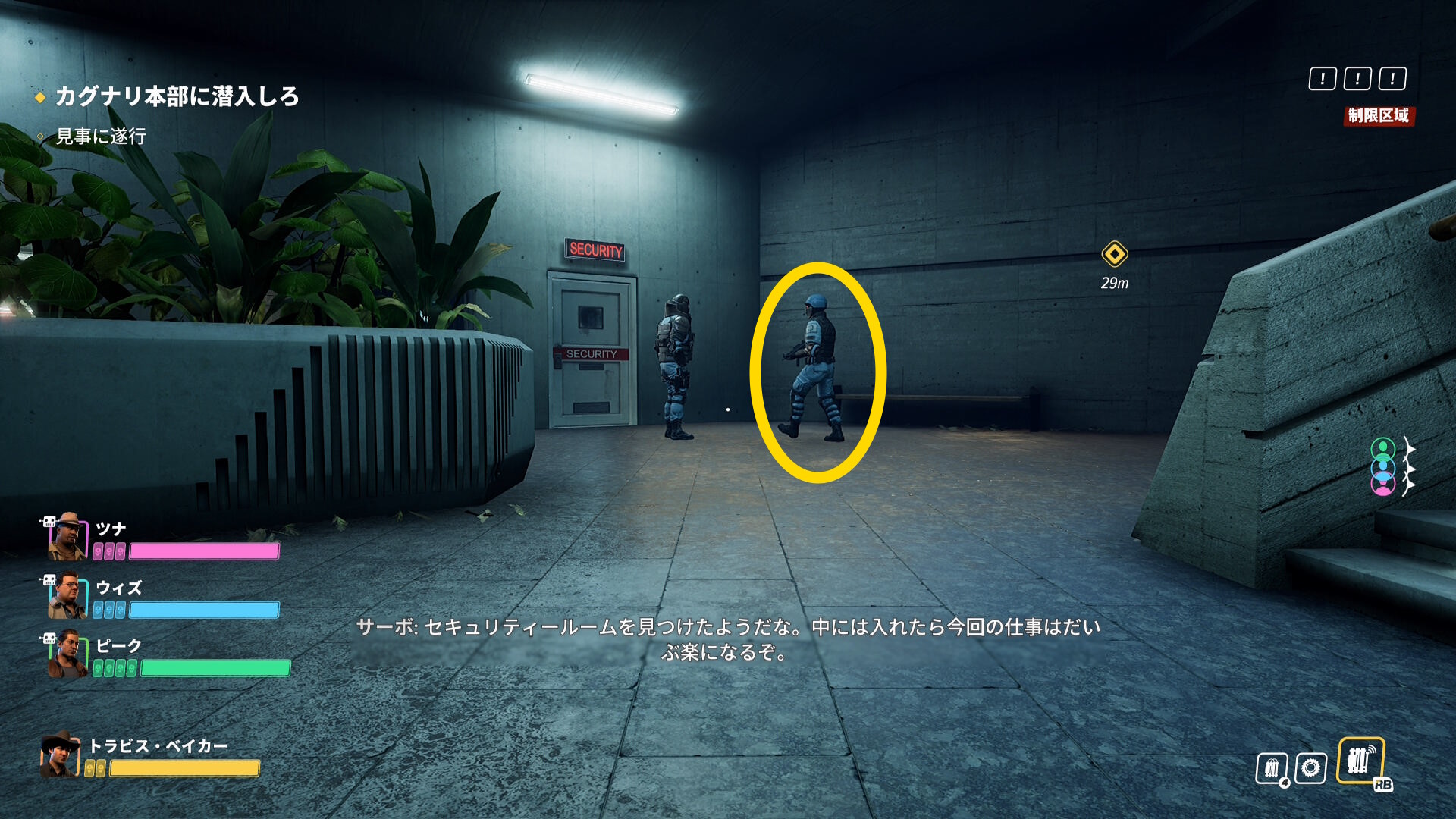 - セキュリティールームには警察官がいるので拘束し、監視カメラを OFF する