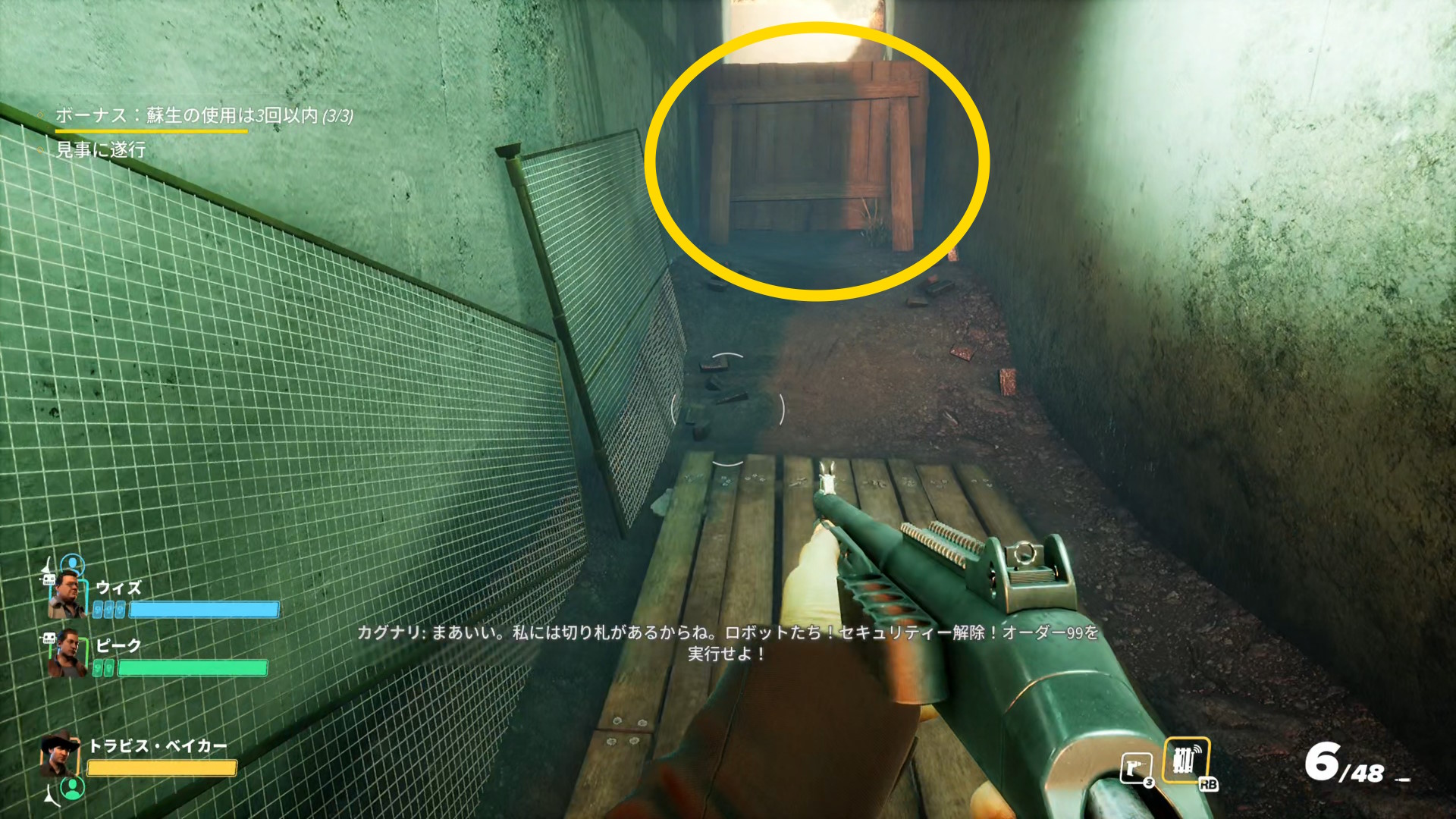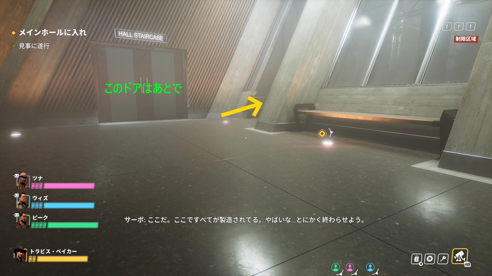 - オートタレットを破壊(もしくは探索して設置されていないことを確認)後、ノコギリ作業の終わったドアを開ける