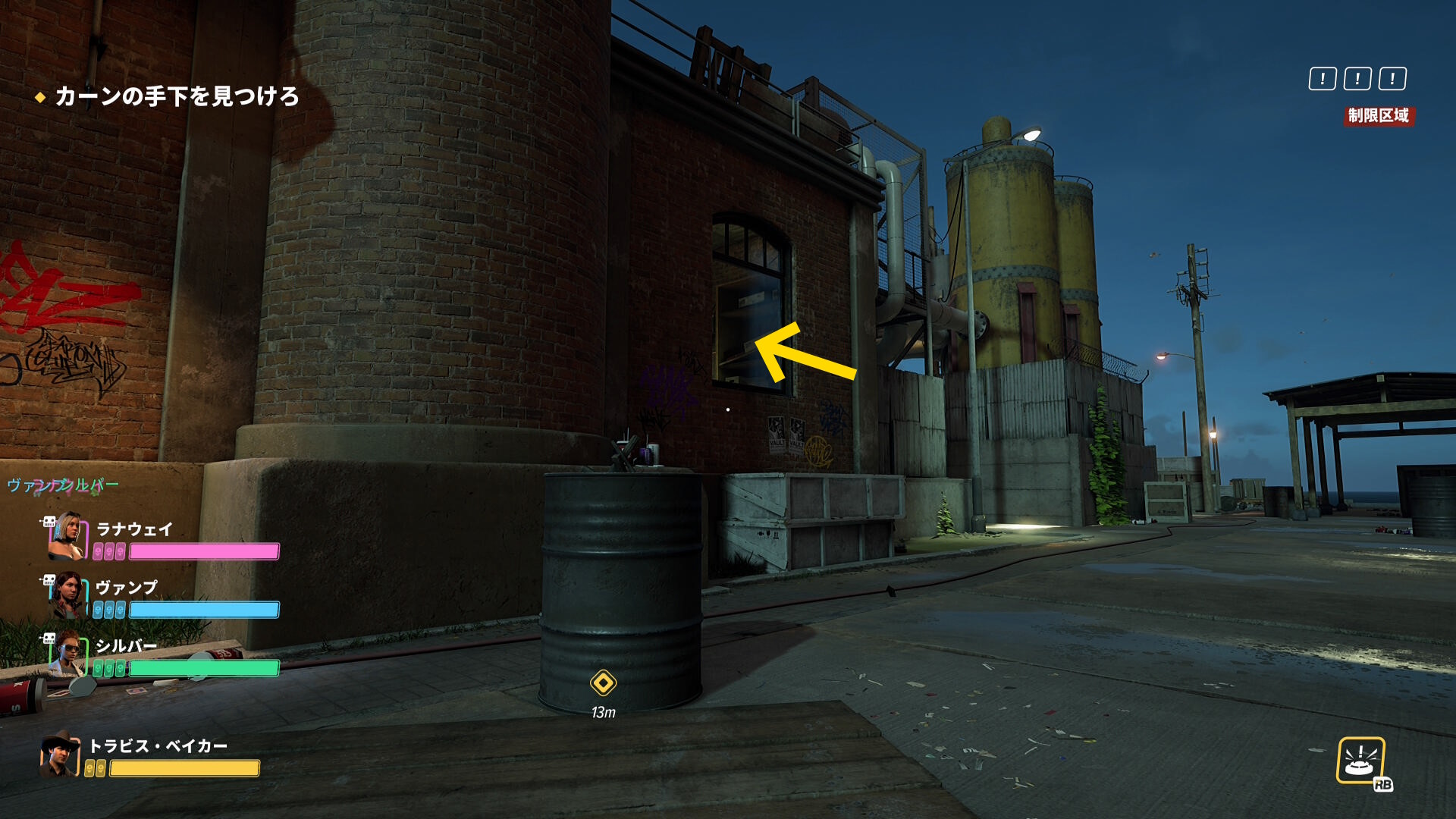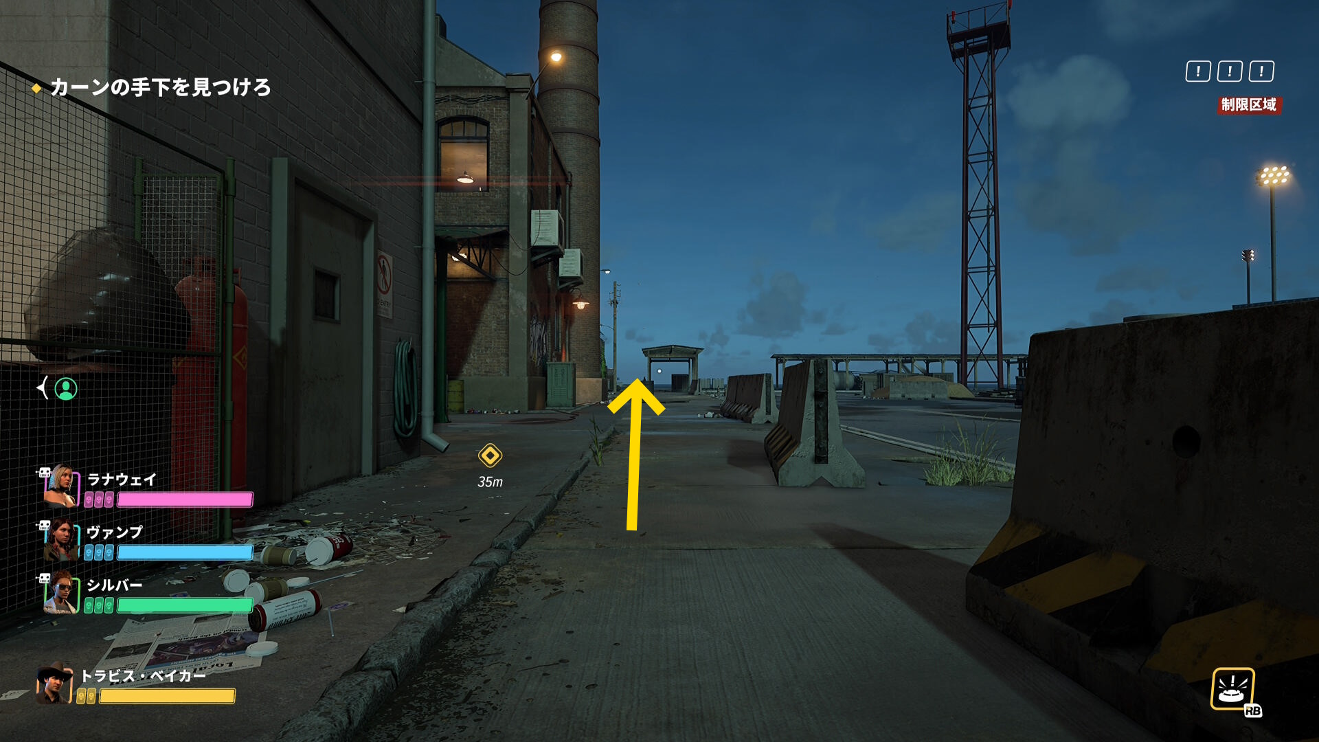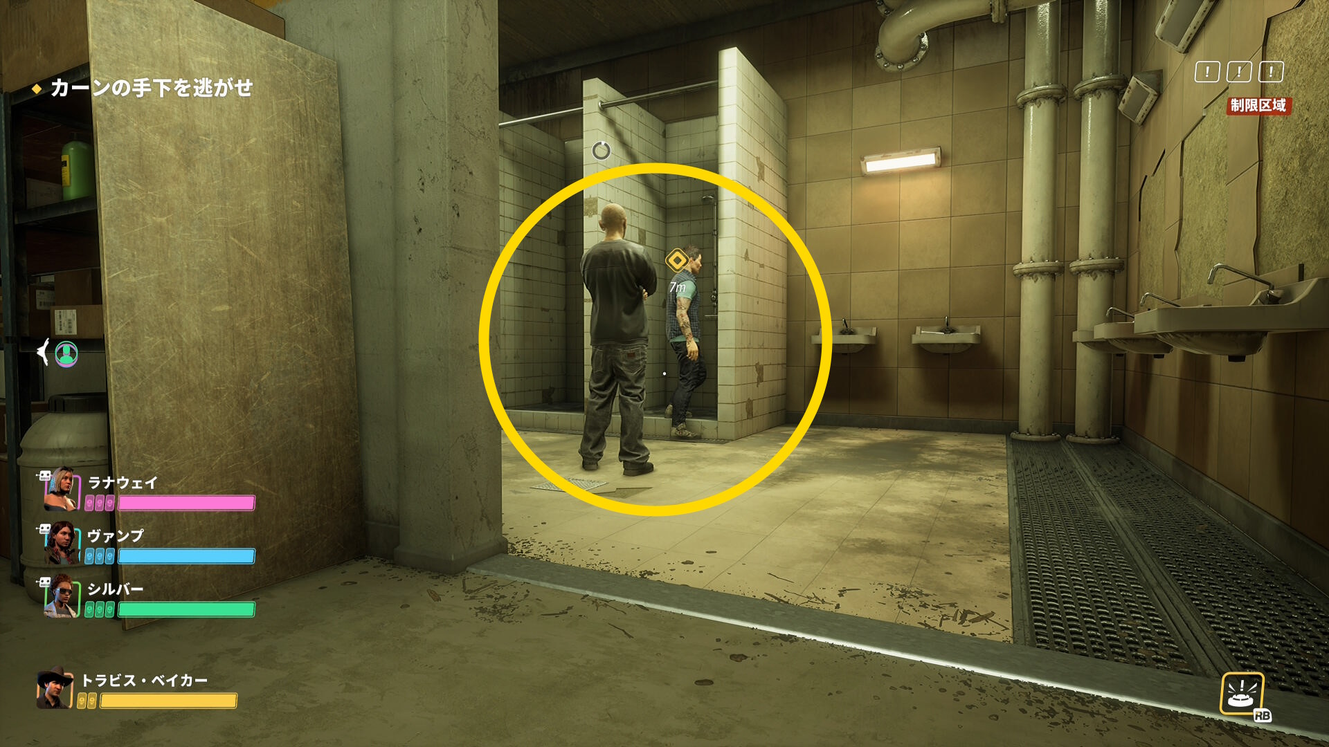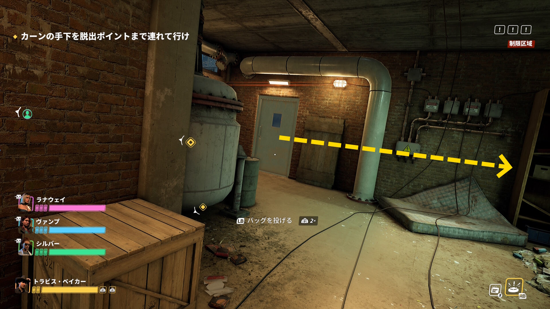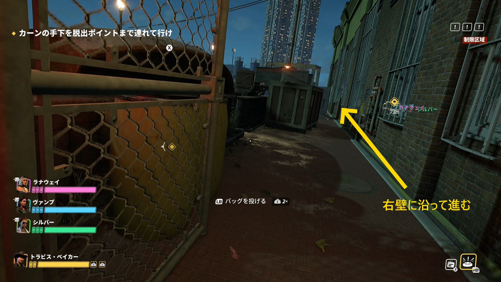 - ベイカーとの距離が 15メートル 以上離れると立ち止まる(歩きで移動すること:彼が立ち止まると ”手下を連れいけ” という表示が画面に出る)